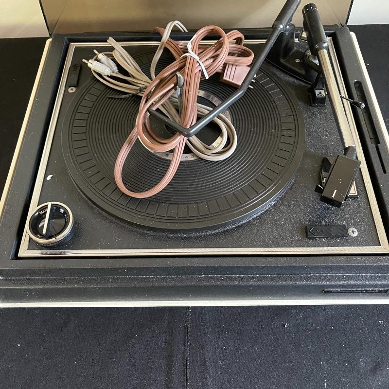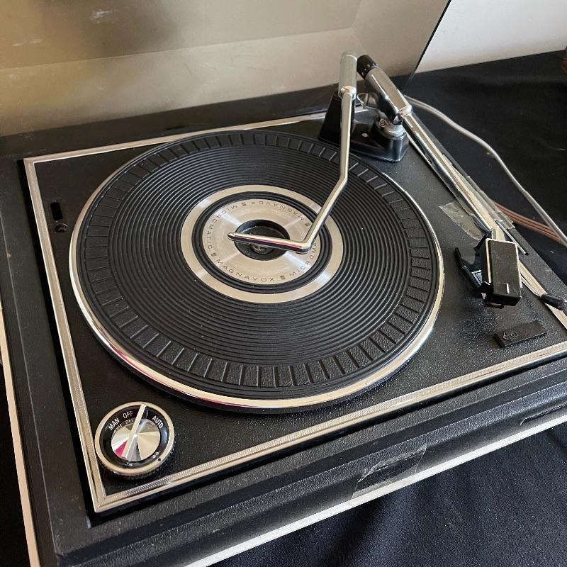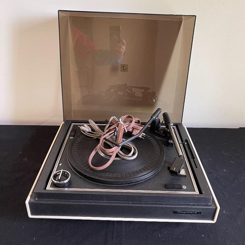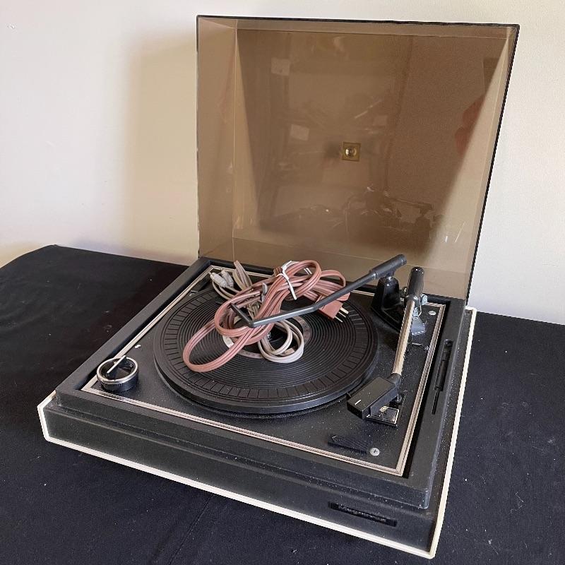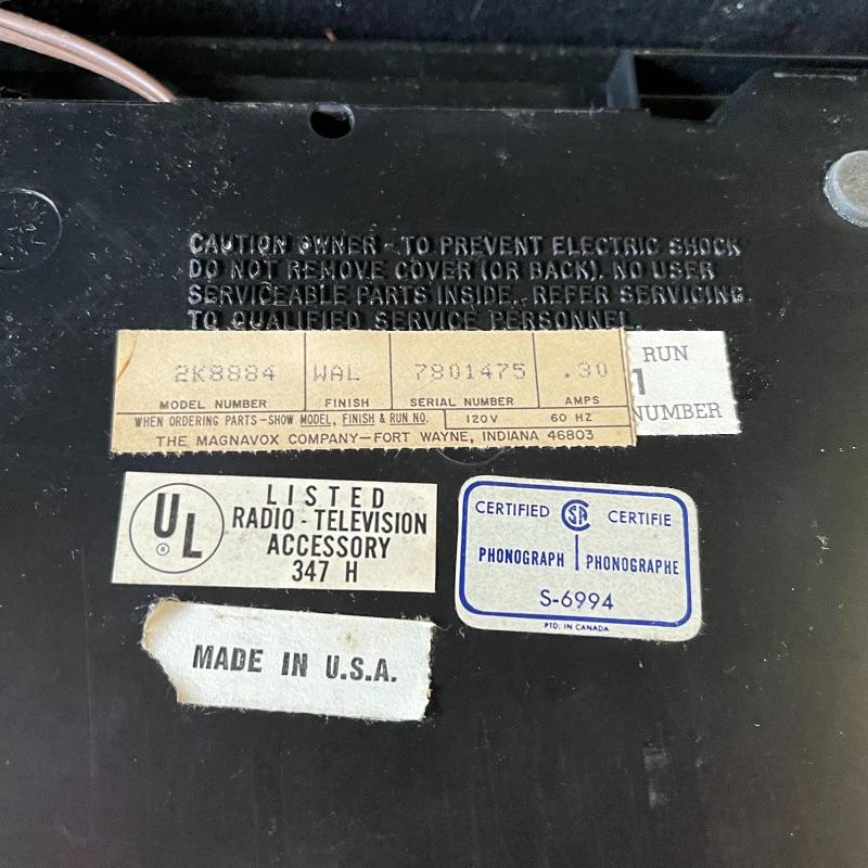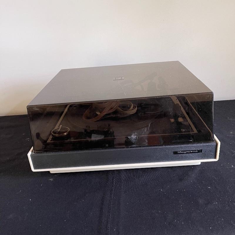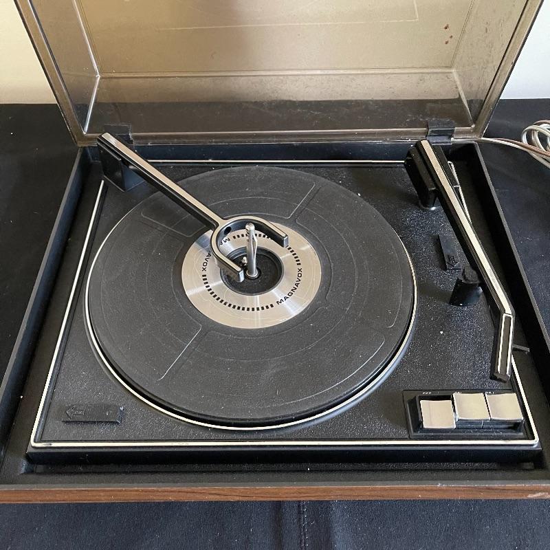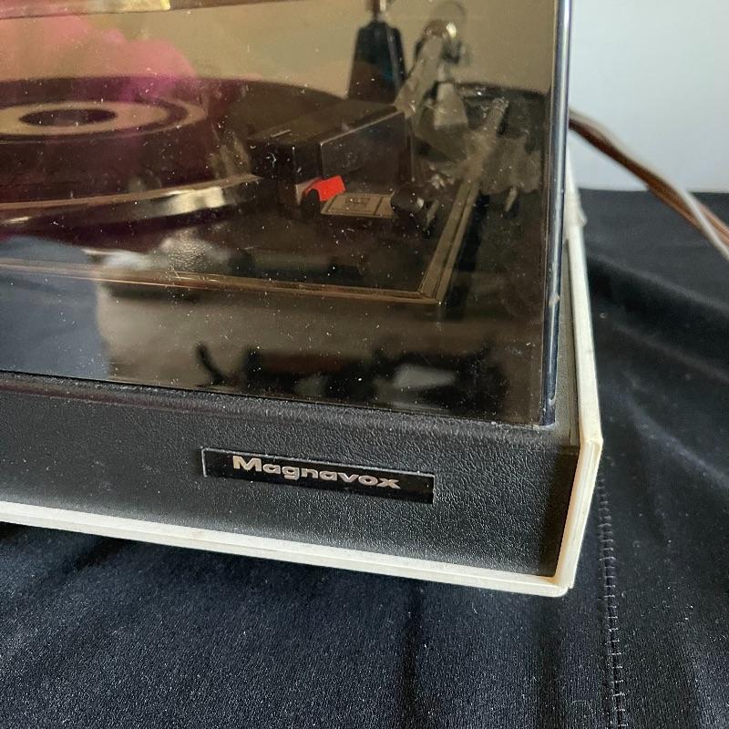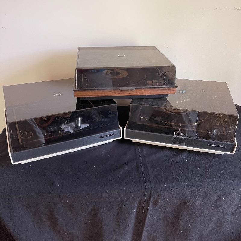 Three Magnavox turntables with plastic lids. The model number of the first turntable is 2K8884 and this unit powered on when tested and the turntable turned. The second is KD1204WA21. The last is KD1202BK22. These last two units have a different type of plug, see pictures.