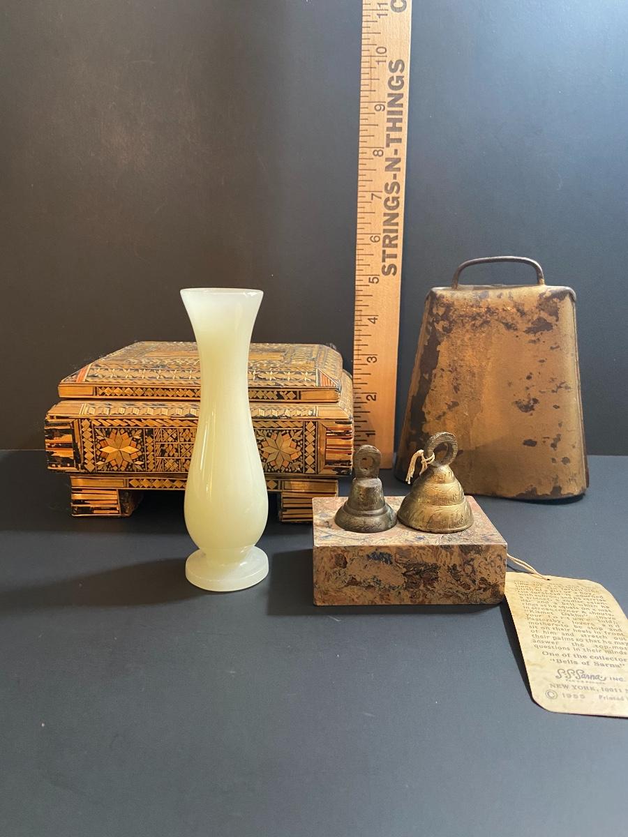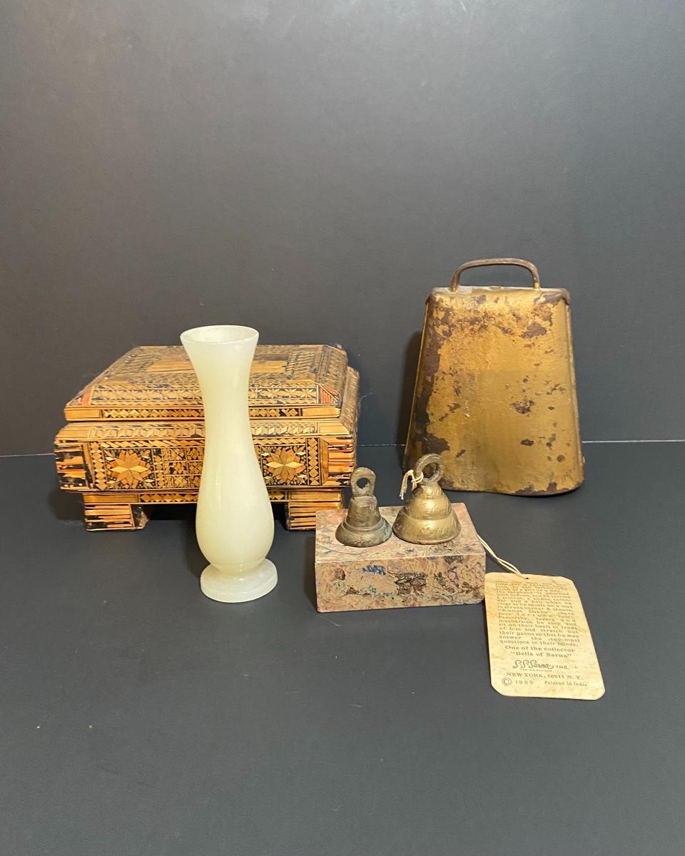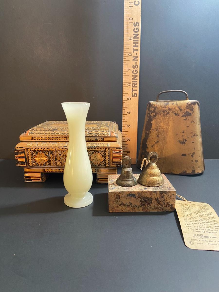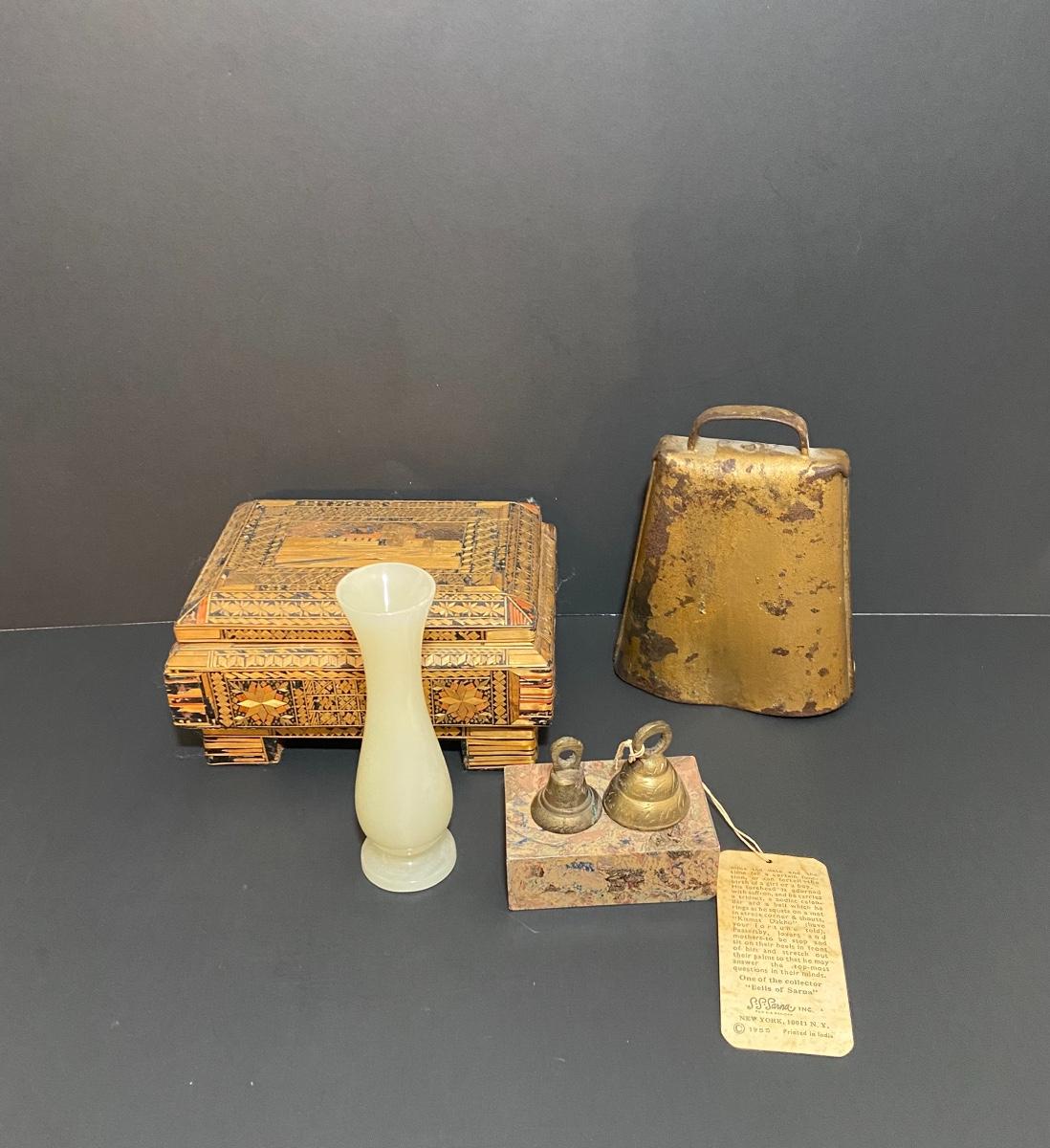 Lot 144: Six vintage and antique items: Trinket box, bells, candle holder +