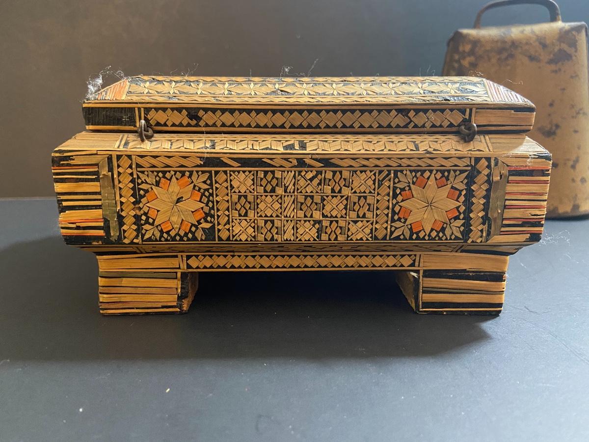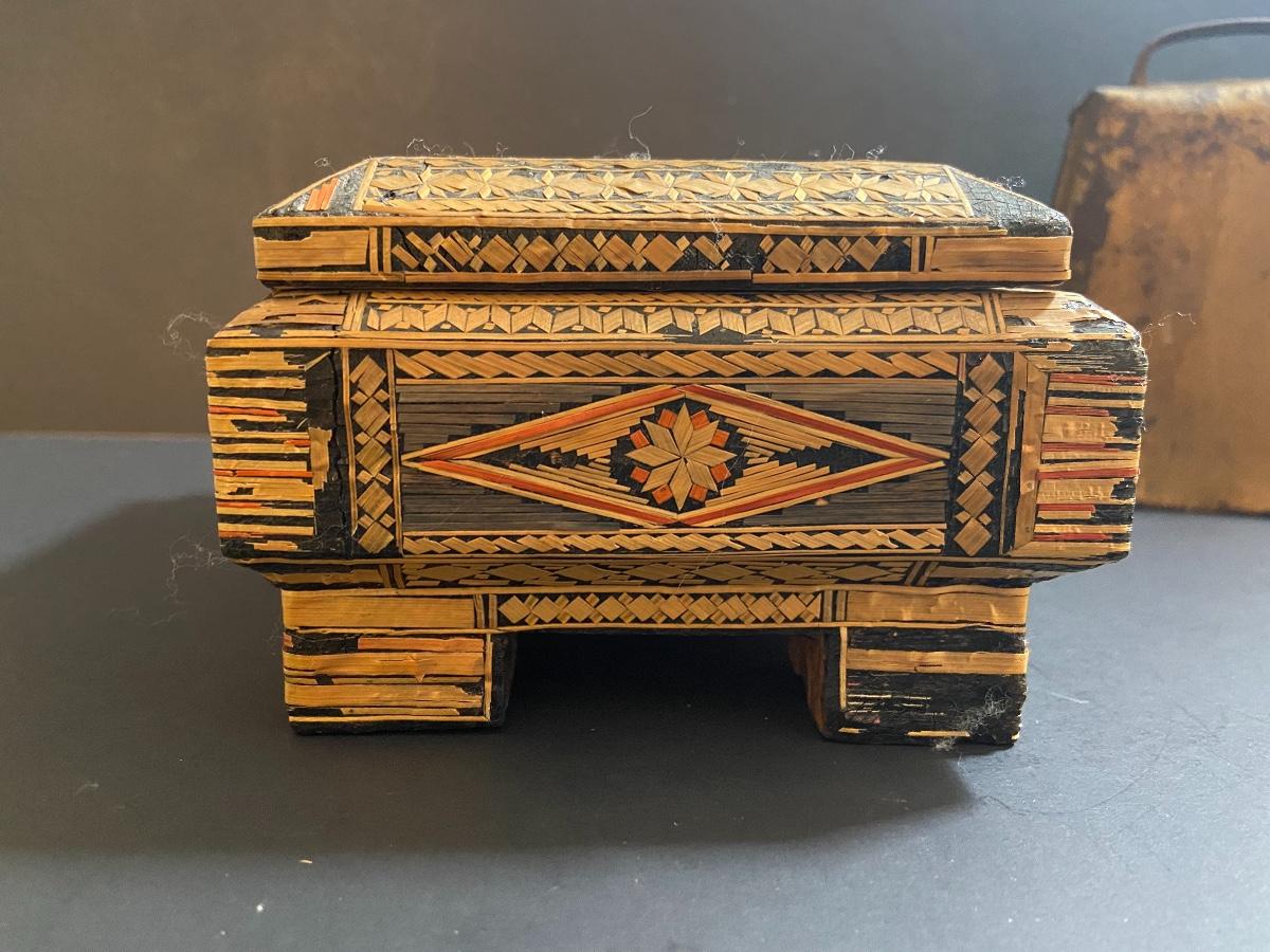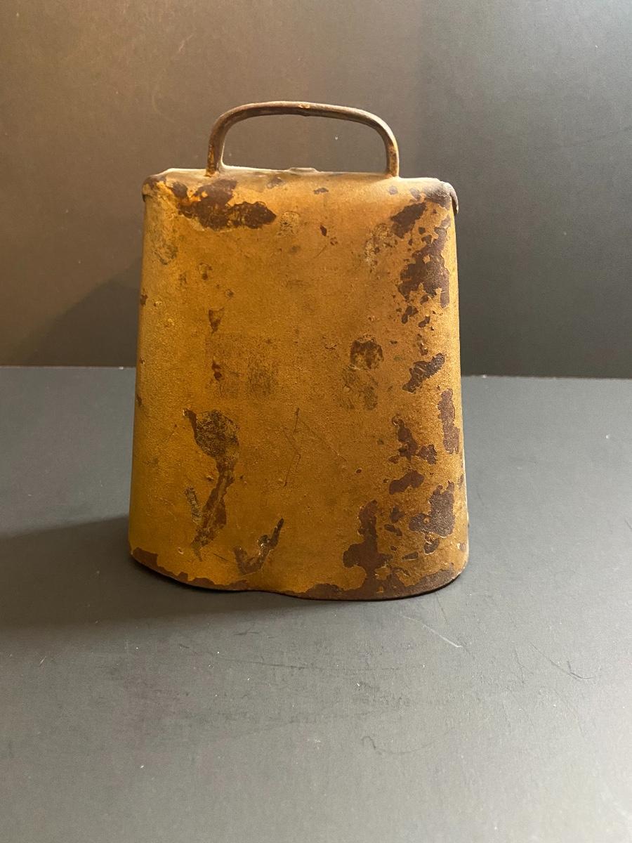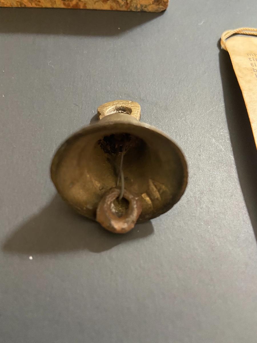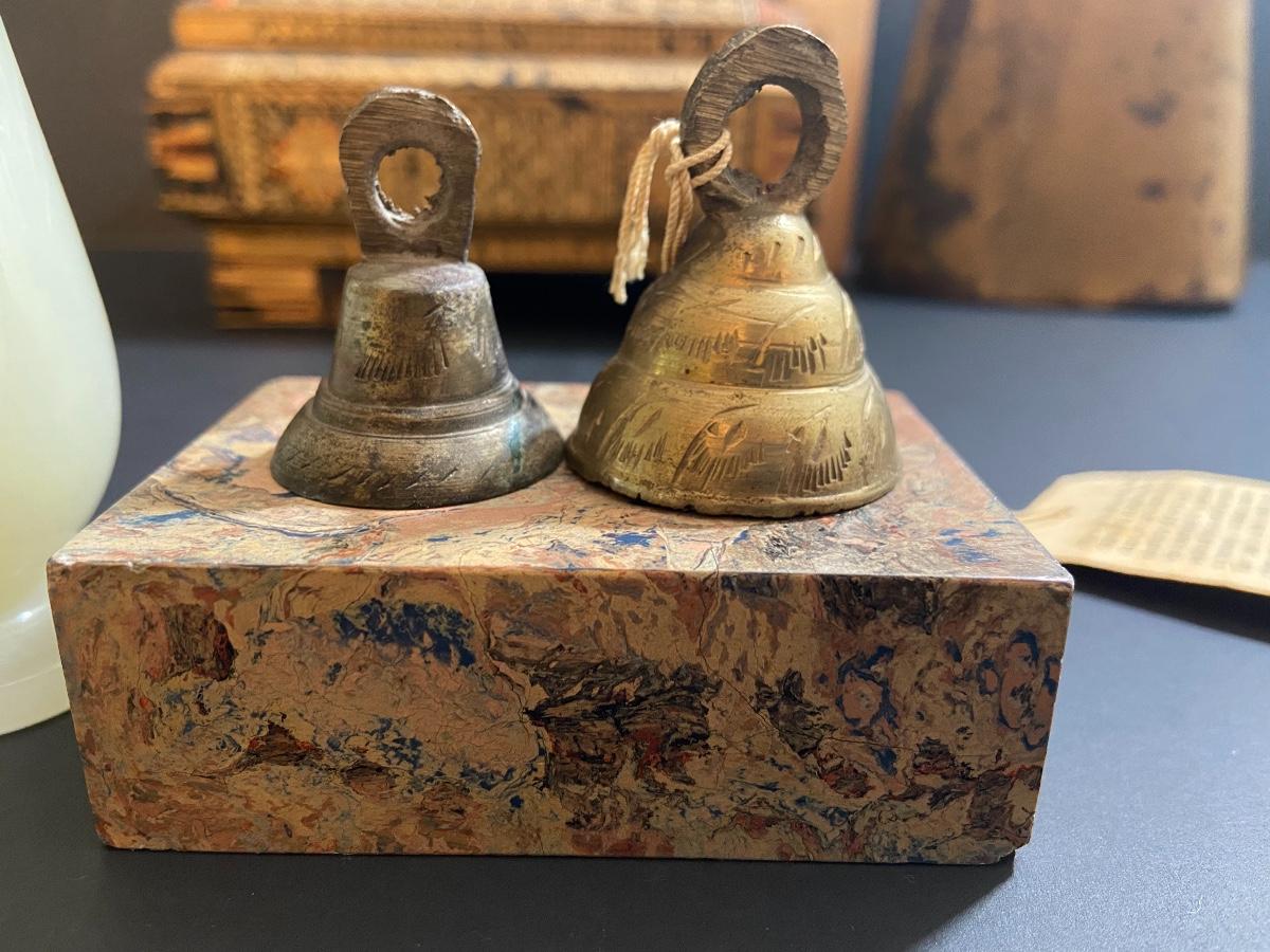 Lot 144: Six vintage and antique items: Trinket box, bells, candle holder +