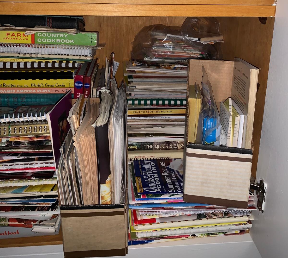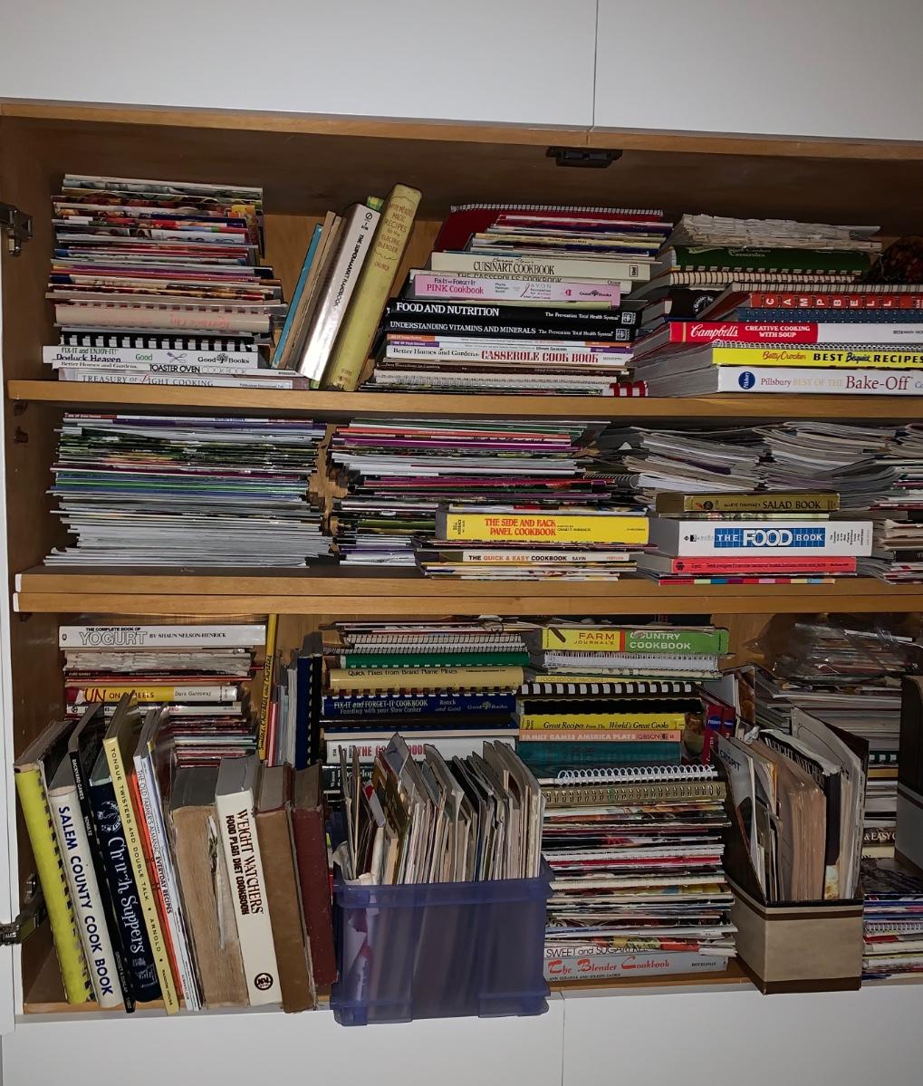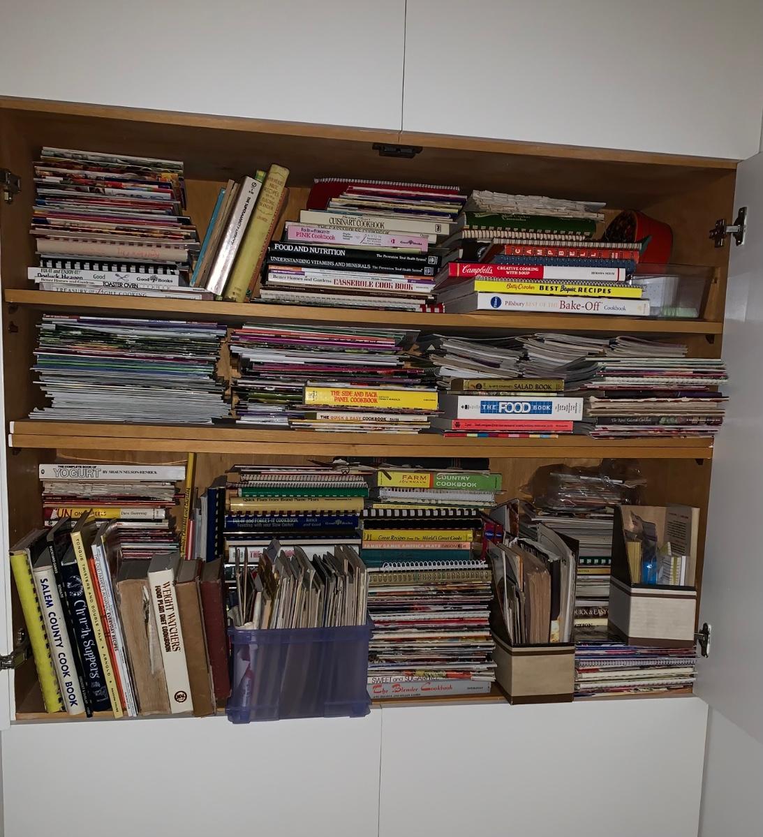 cabinet full with new and vintage cookbooks and magazines for the collector or crafter.