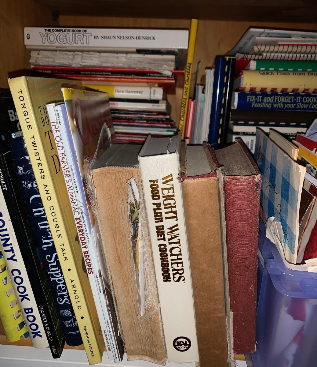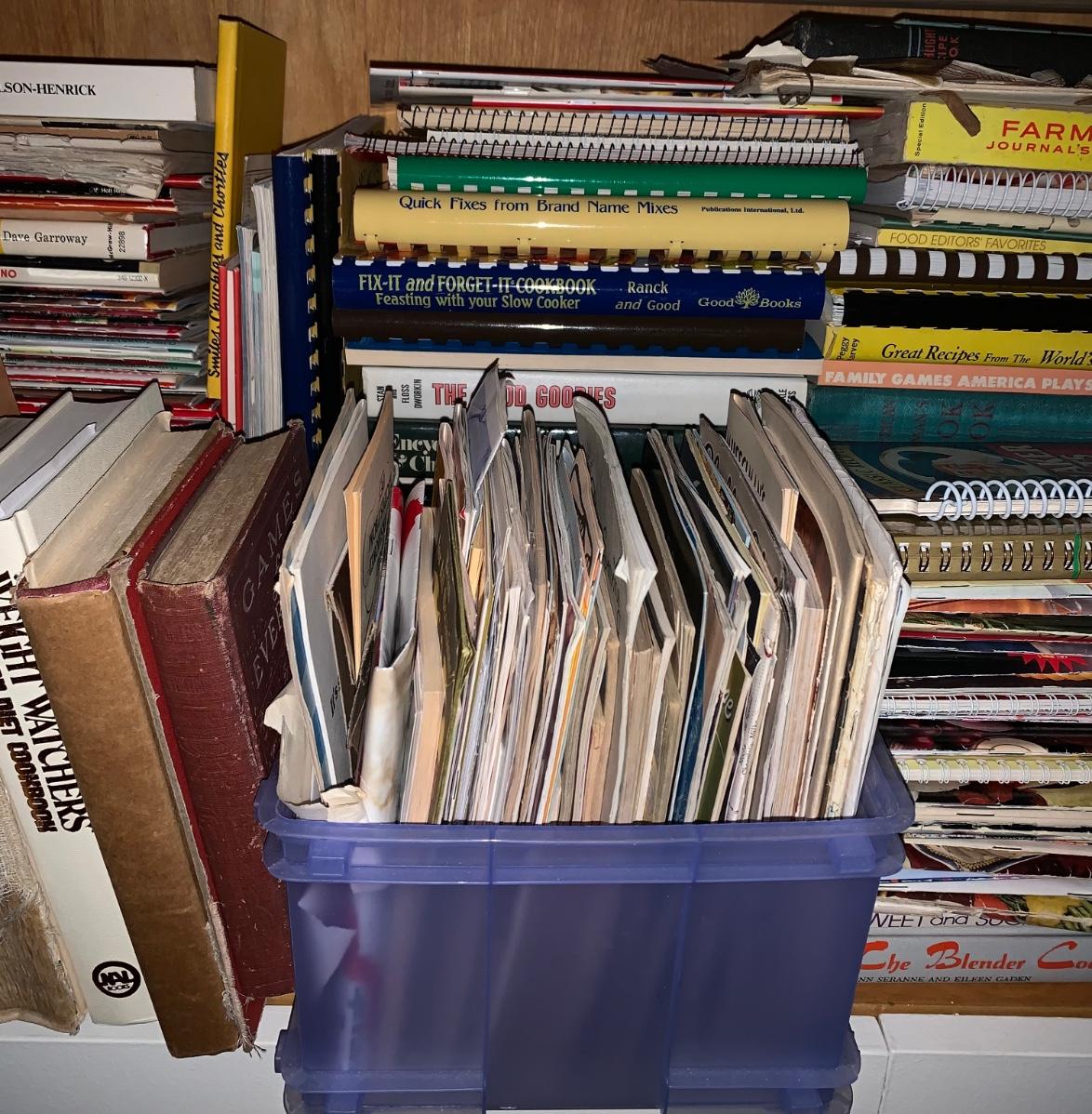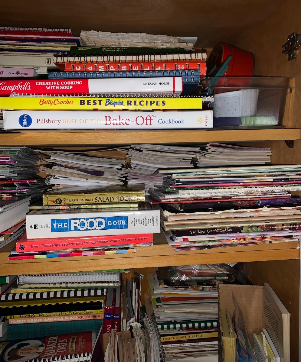 cabinet full with new and vintage cookbooks and magazines for the collector or crafter.