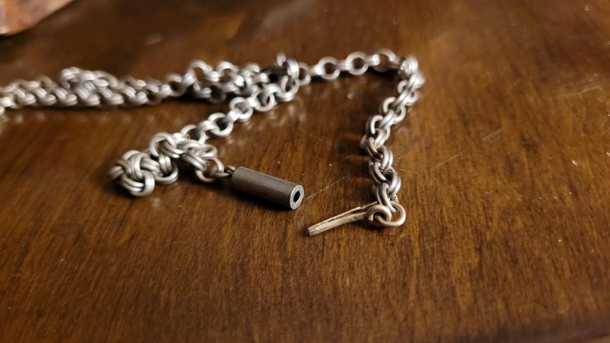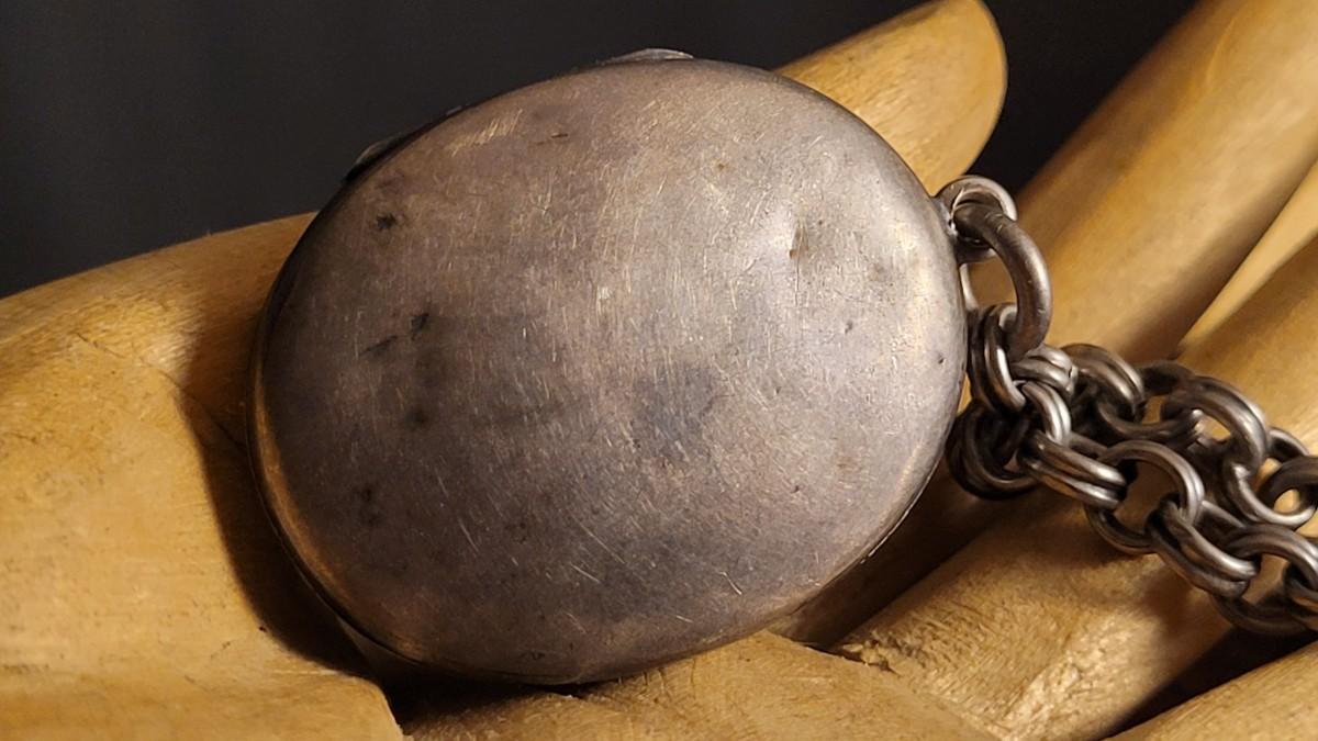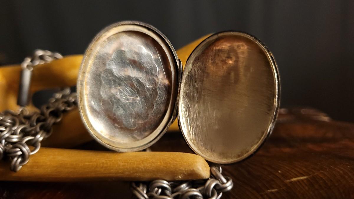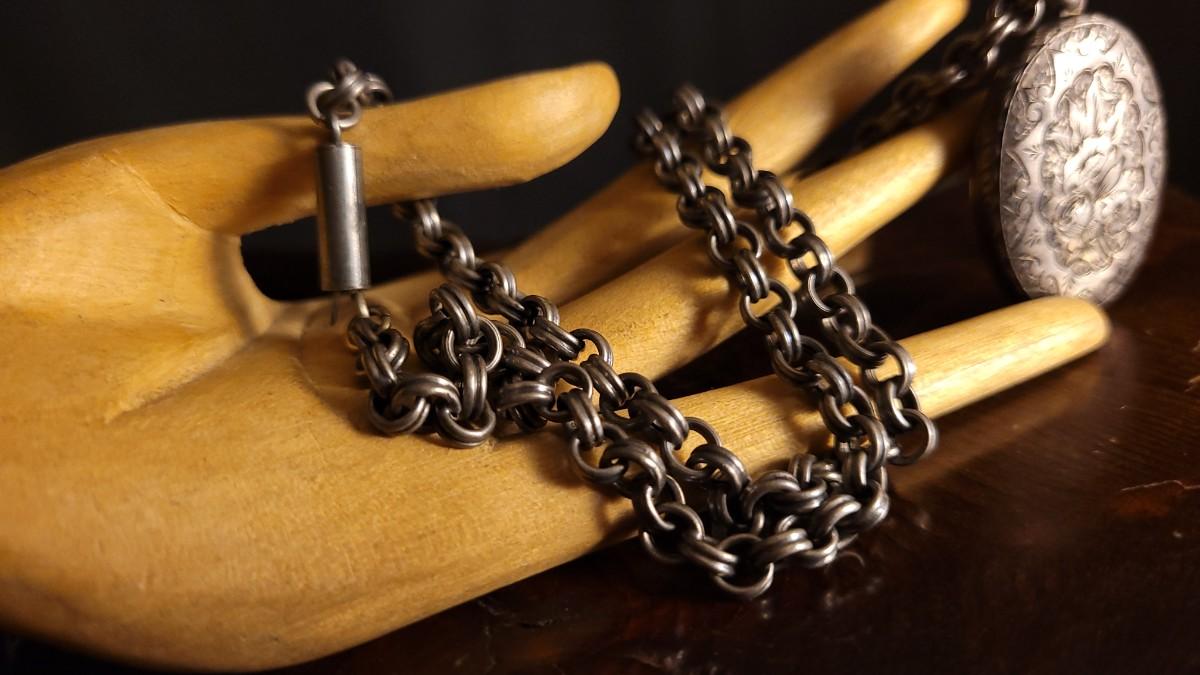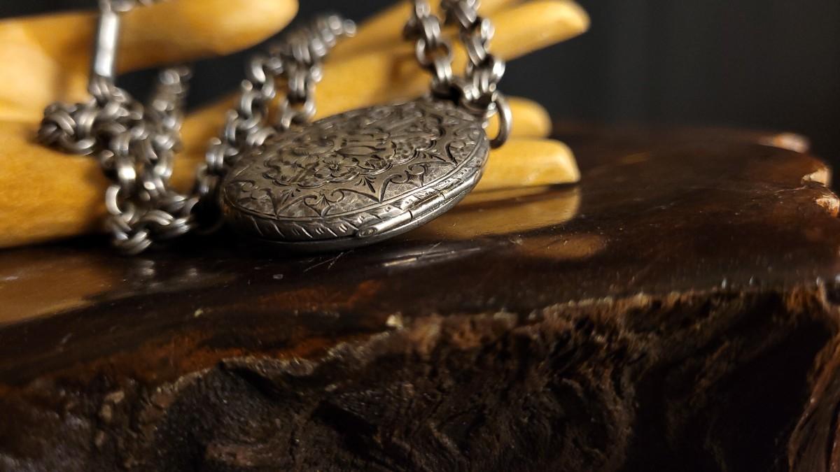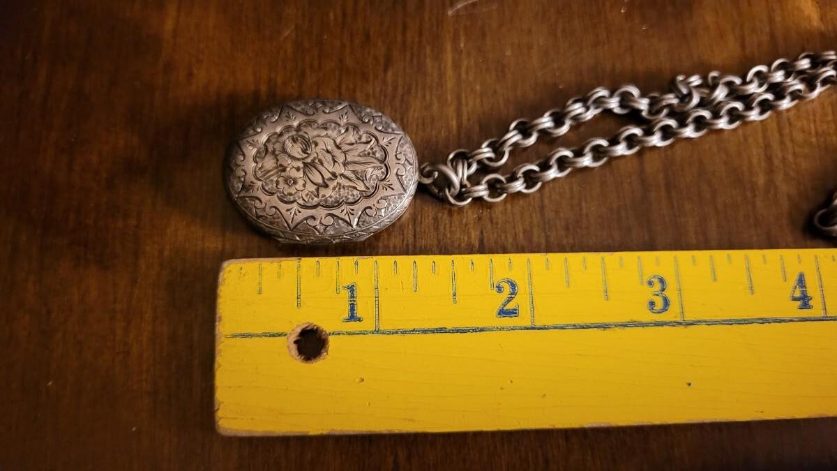 This lot features a beautifully Chased Pendant that was surely worn by someone who found it to be a comfort to wear their lover's photo encased safely and close to their heart. Fine quality Engraving on the front side. Does show a few dings on reverse to be expected with age. Opens as intended. Appears to be original Silver Tone dual link chain that measures about 18" (9" drop).