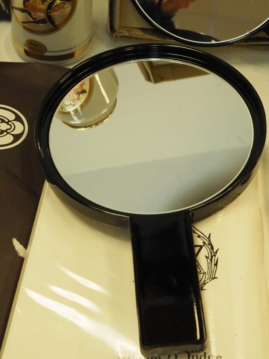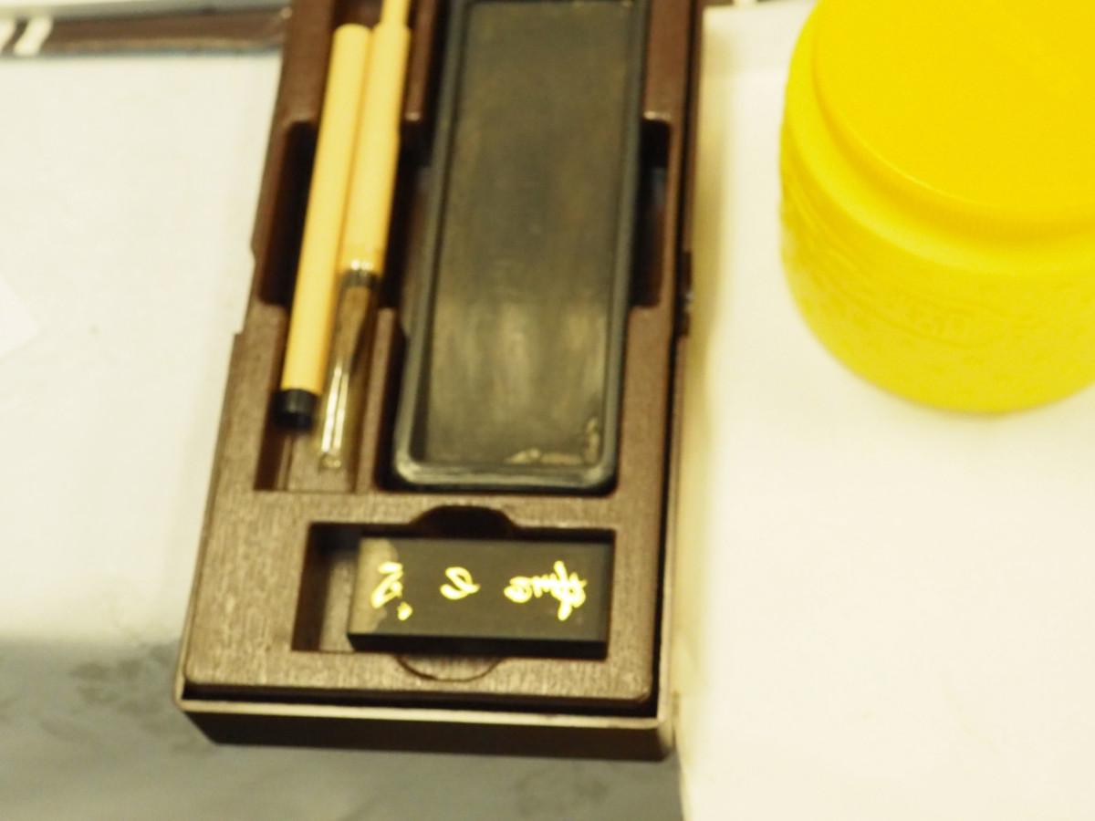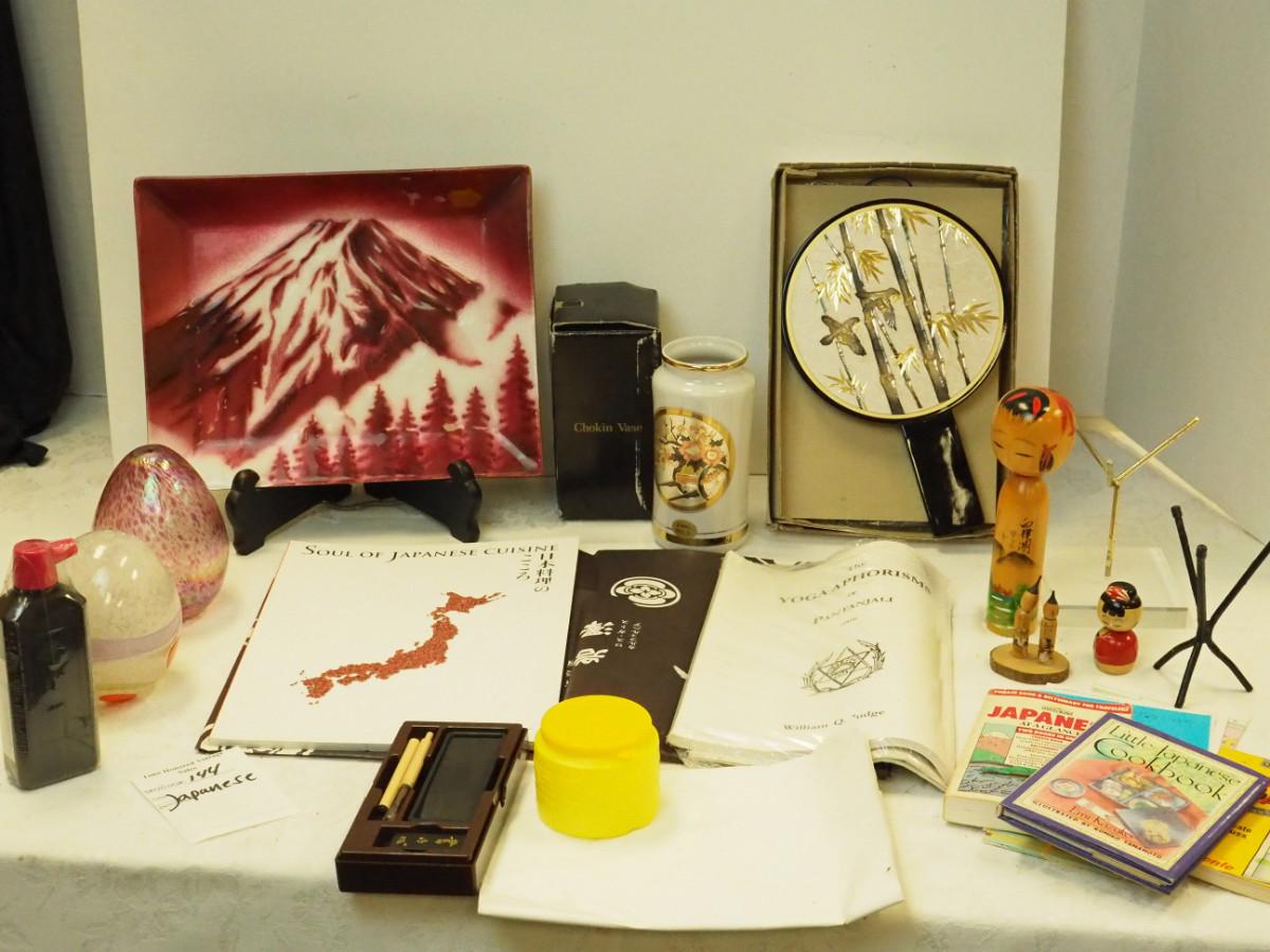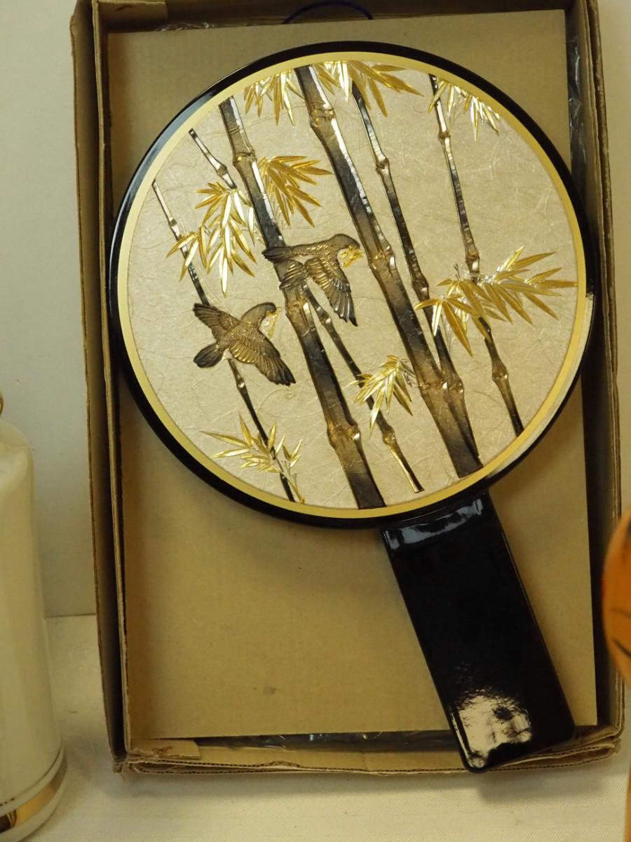 Lot 144 Asian art, Japanese enamel red Mt Fuji, ink, stone and brush, Mirror, dolls Japanese cook book. Gold Chokin vase.