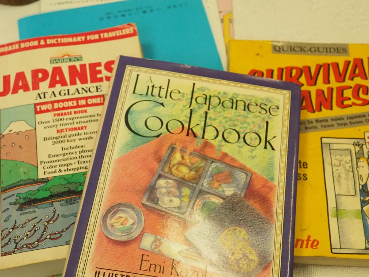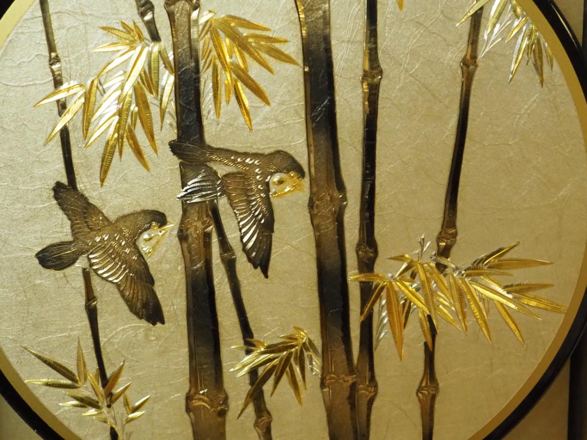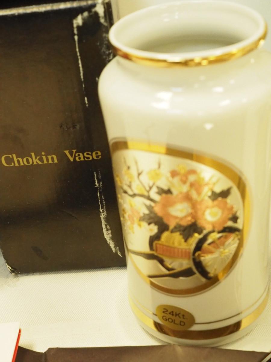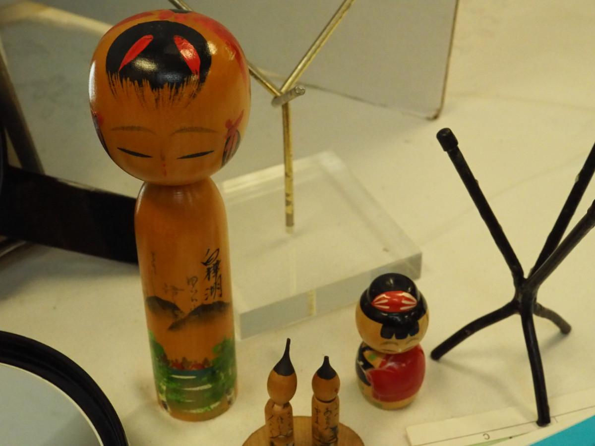 Lot 144 Asian art, Japanese enamel red Mt Fuji, ink, stone and brush, Mirror, dolls Japanese cook book. Gold Chokin vase.