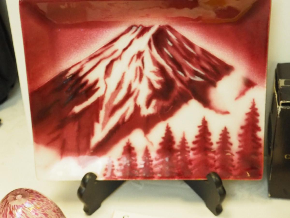 Lot 144 Asian art, Japanese enamel red Mt Fuji. Sumie painting