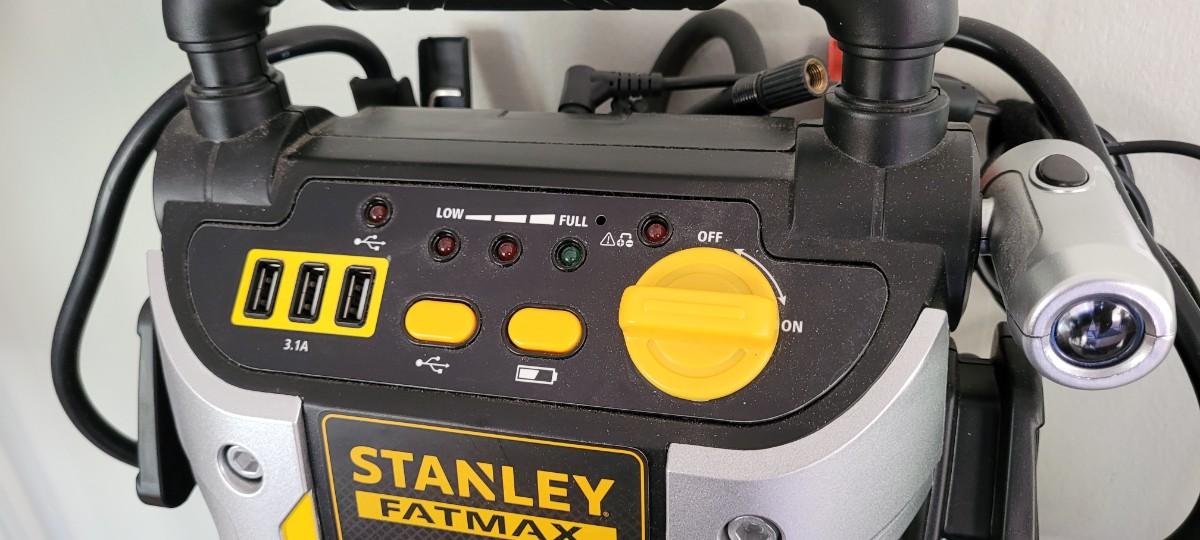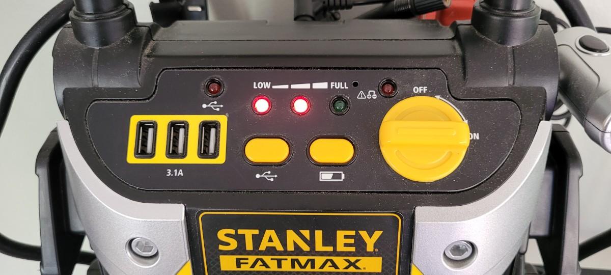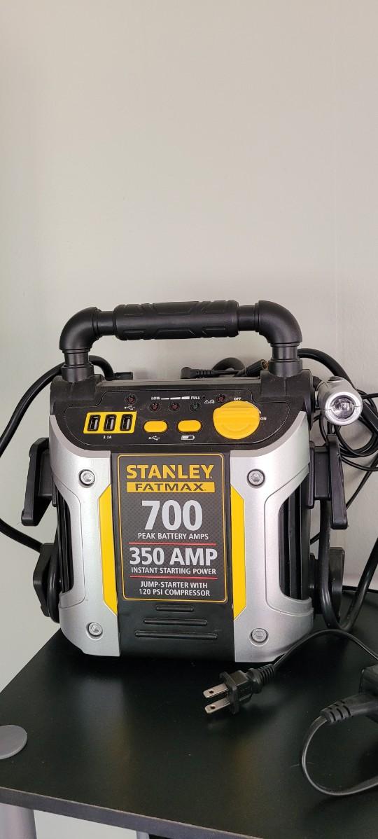 Lot 144: STANLEY 700 Peak Amp Portable Battery Jumpstart Power Bank w/ Charger