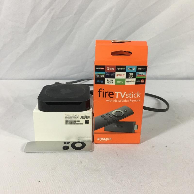 Apple TV and Amazon Fire Stick. Lot includes Apple TV model # A1469 third generation unit that was certified refurbished and a Amazon Fire Stick second generation. Apple TV powered on when tested and Fire Stick was not tested. Cut your cable ties with these two great streaming units.