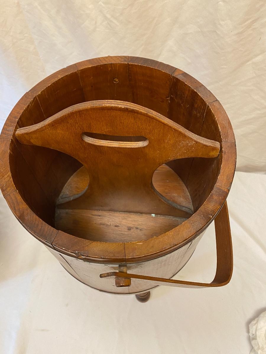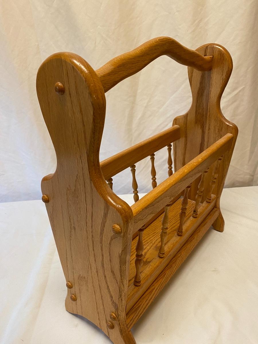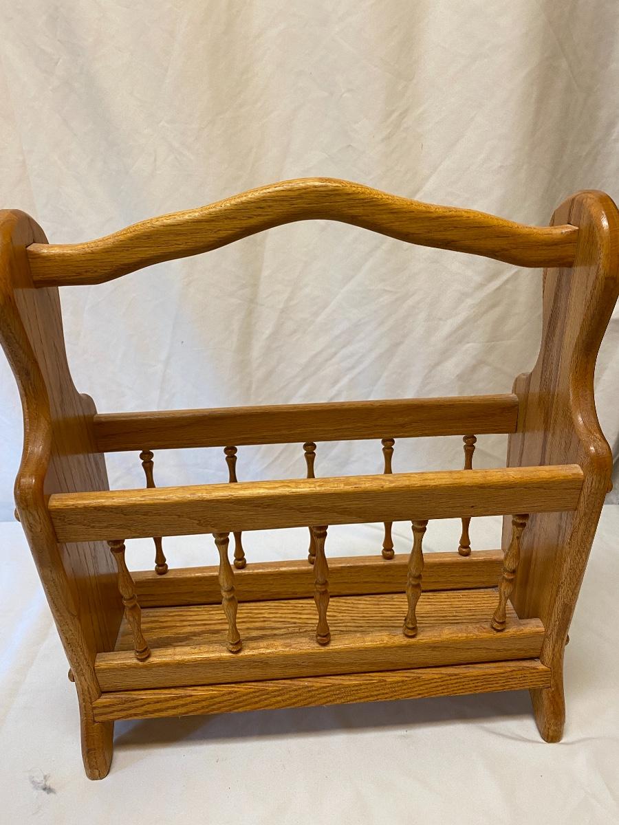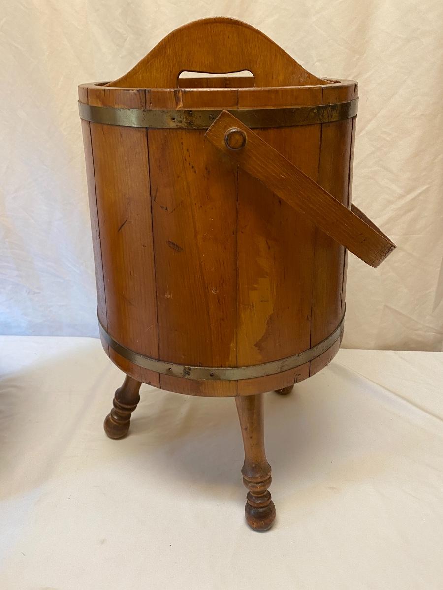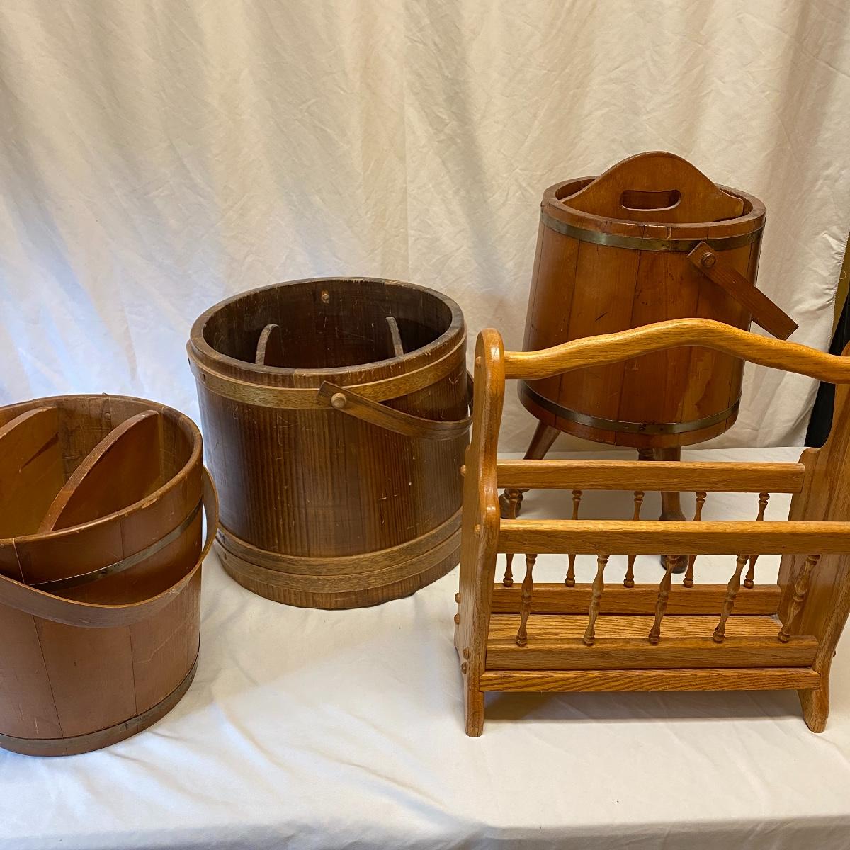 Amplify your country decor with these wooden barrels turned into magazine racks! There are three barrels with dividers inside to add or tidy books, papers or magazines. This lot also includes a good old fashioned magazine rack. The largest barrel measures 17”d x 13.5” tall. Bucket/barrel on legs measures approximately 12” diameter by 23”tall. Local pick up only.