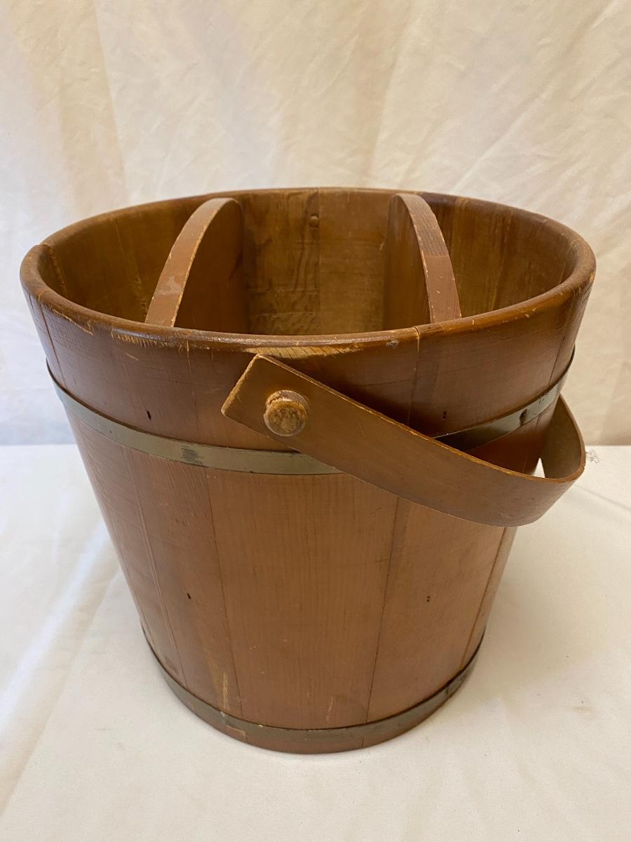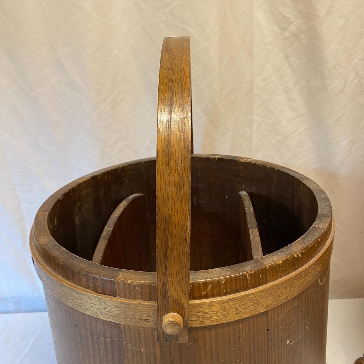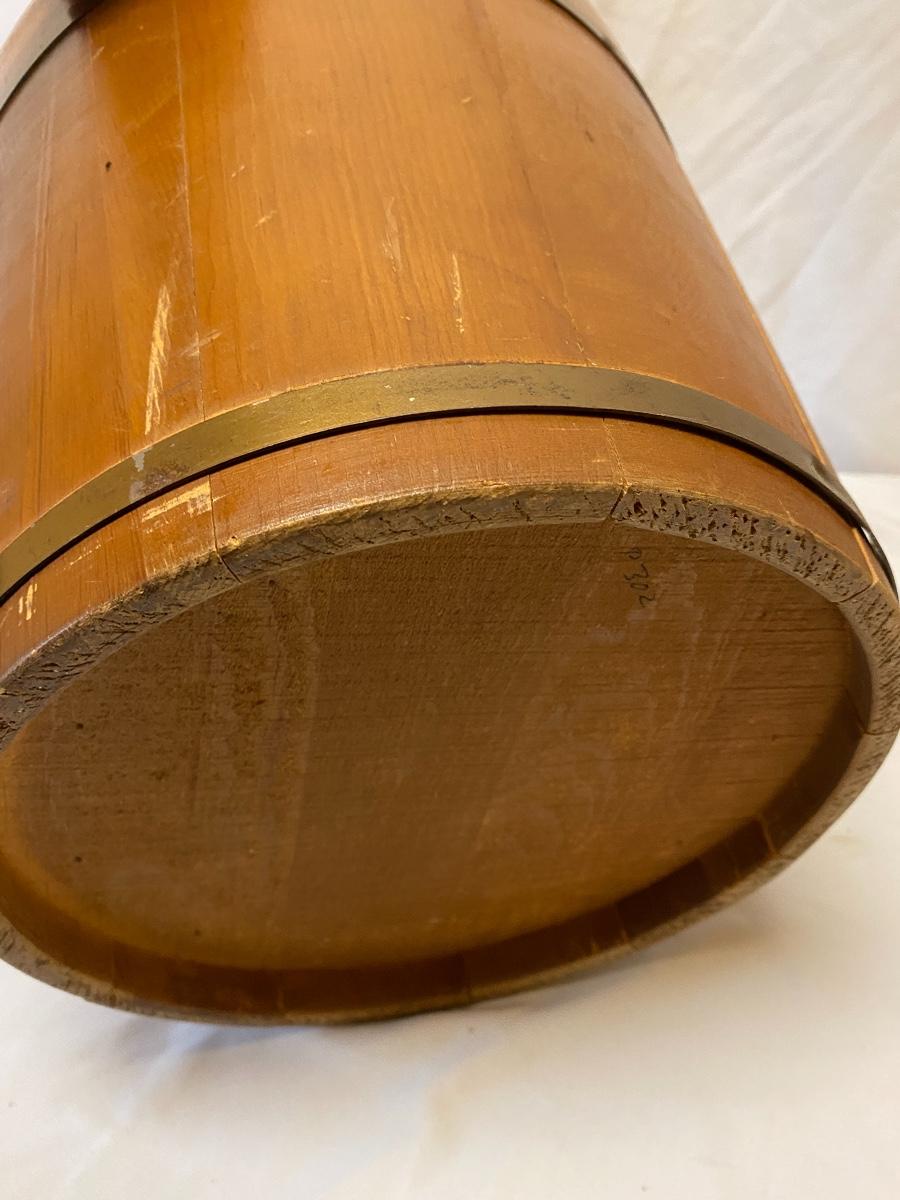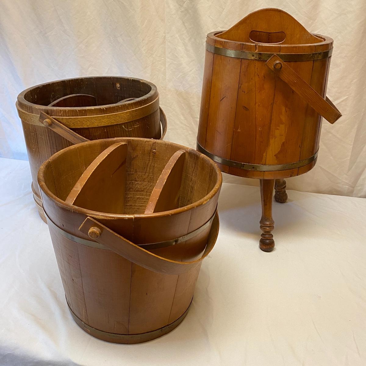 Amplify your country decor with these wooden barrels turned into magazine racks! There are three barrels with dividers inside to add or tidy books, papers or magazines. This lot also includes a good old fashioned magazine rack. The largest barrel measures 17”d x 13.5” tall. Bucket/barrel on legs measures approximately 12” diameter by 23”tall. Local pick up only.