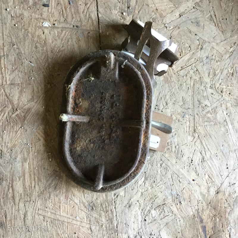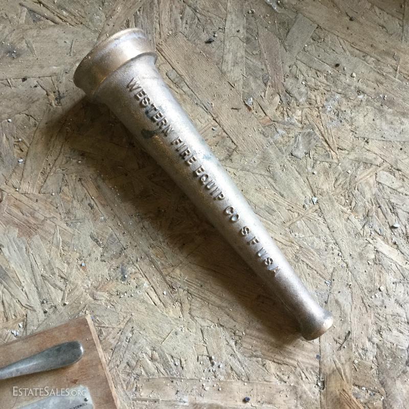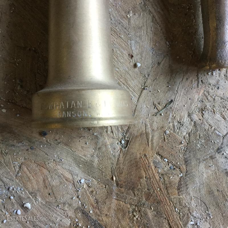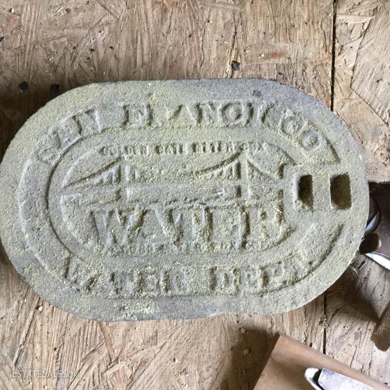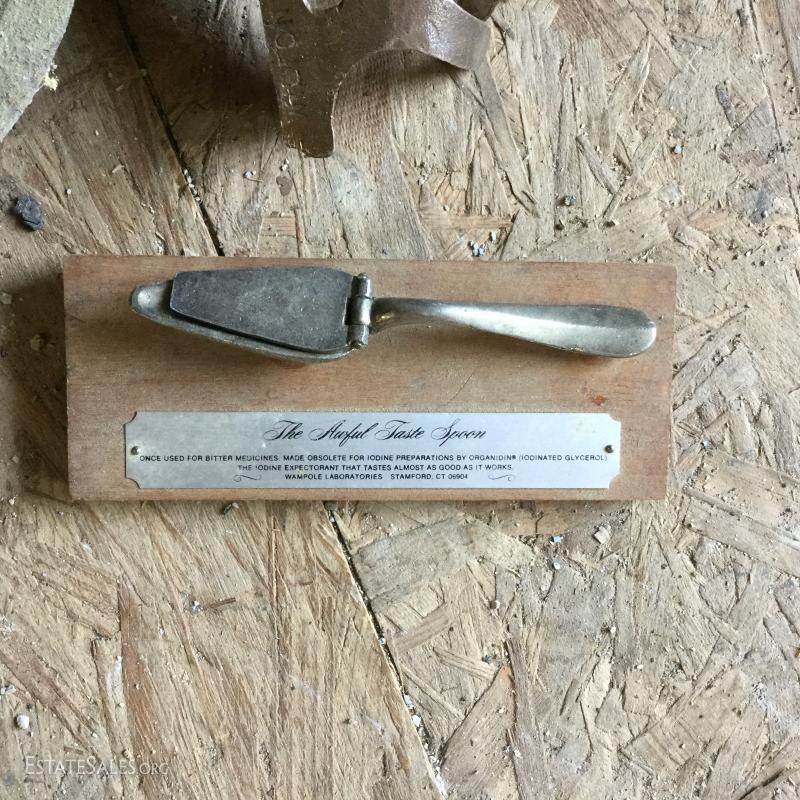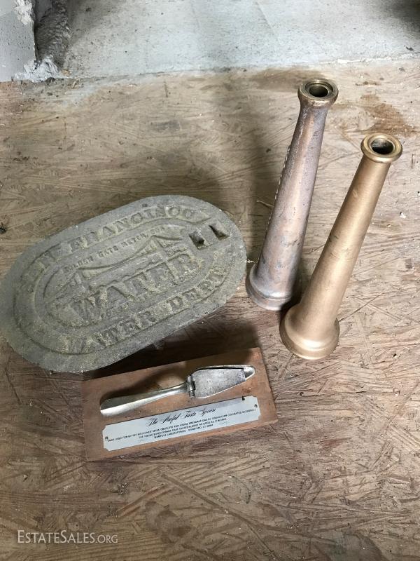 2 metal fire hose attachments (10"h), one is from Ranson, W. VA and the other from San Francisco. Includes one San Francisco Water Dept. access cover. Interesting "The Awful Taste Spoon" from Walpole Laboratories in Stamford, CT. Needs to be reattached to wood stand. This lot is available for local pick up in Hendersonville, NC only.