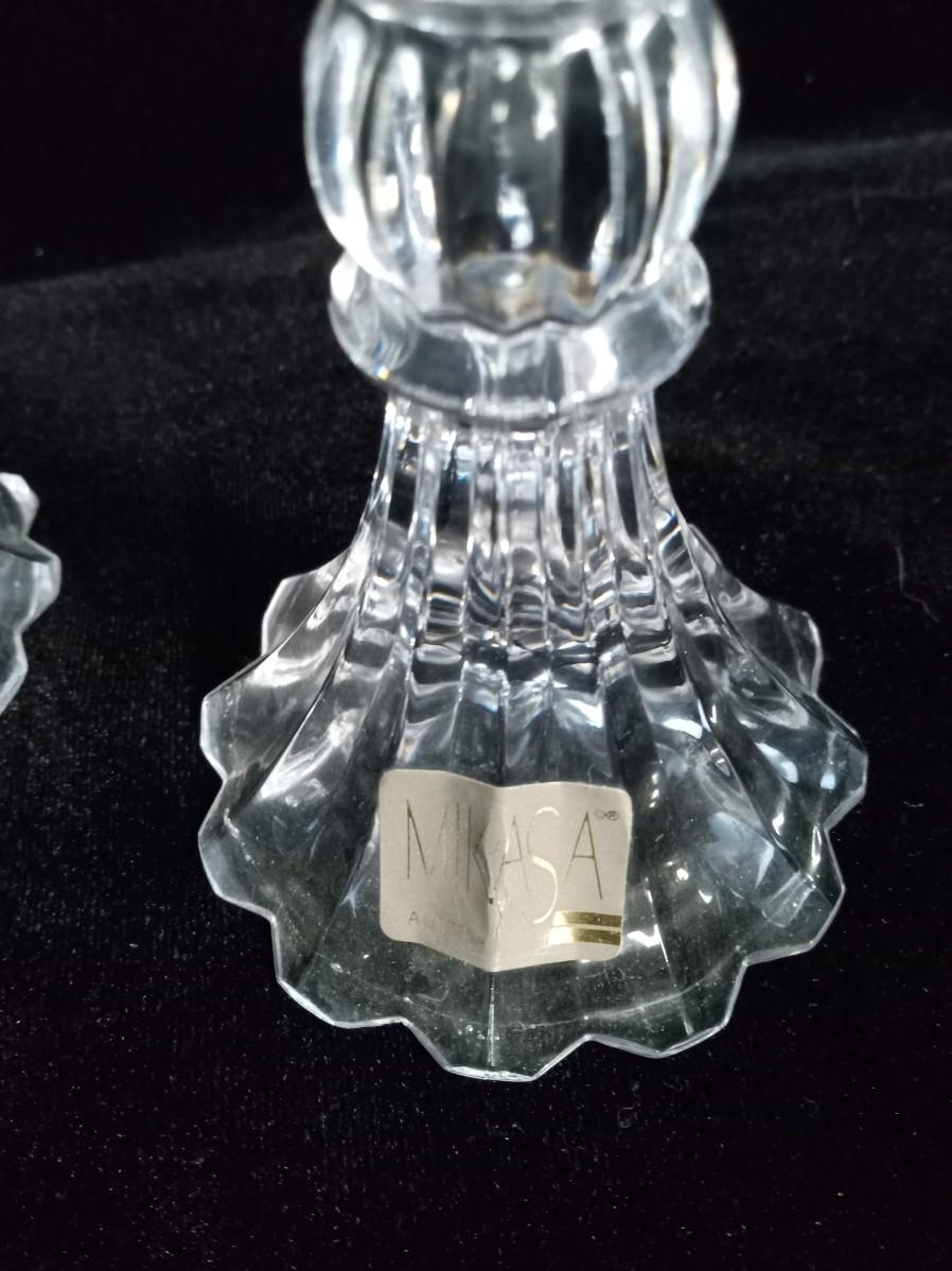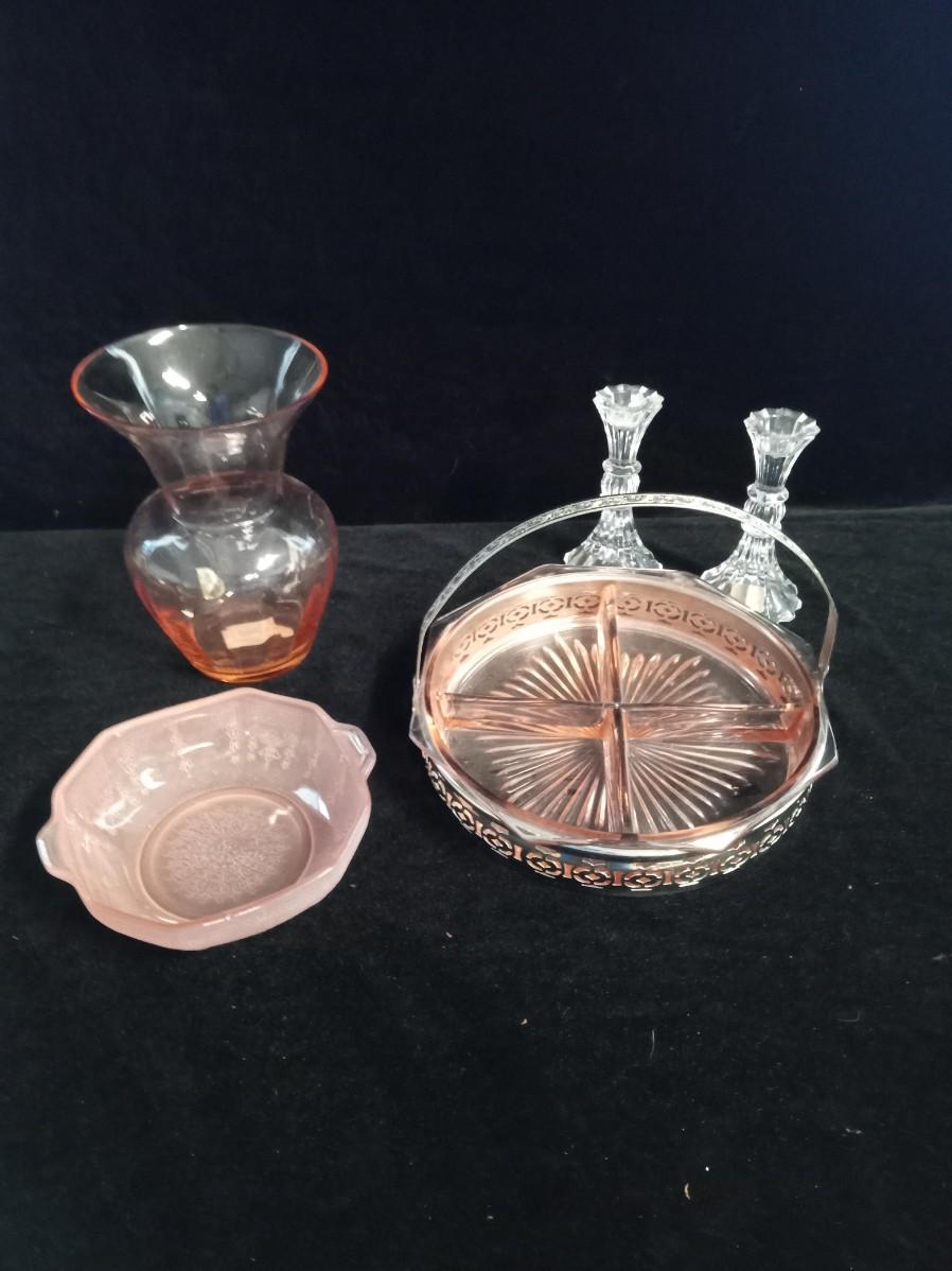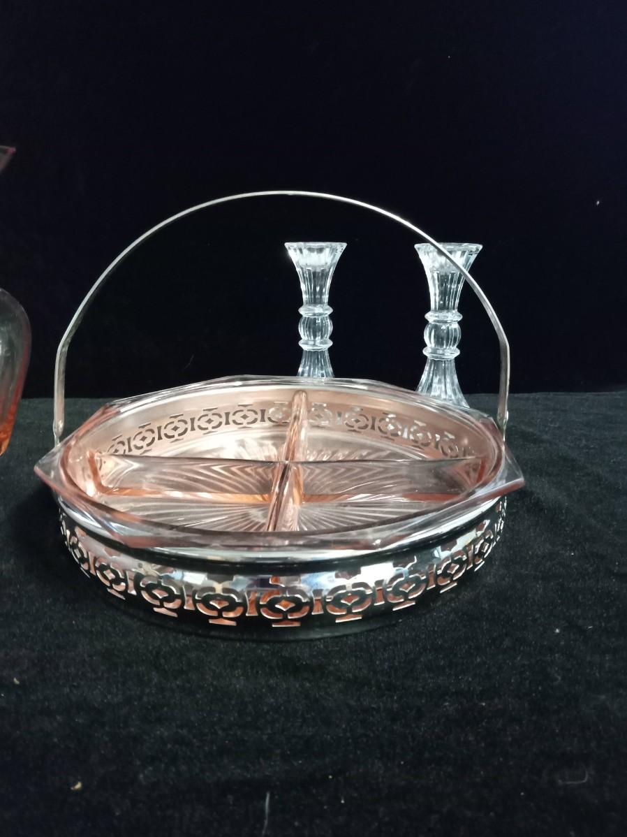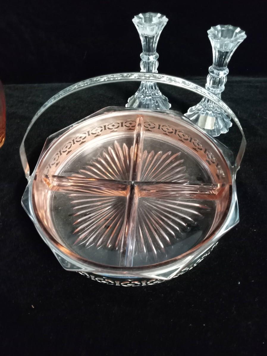 PAIR OF MIKASA CANDLESTICKS. A CAVALIER GLASS VASE AND CONDIMENT BOWL AND A DEPRESSION GLASS DIVIDED DISH WITH A METAL, HANDLED FRAME