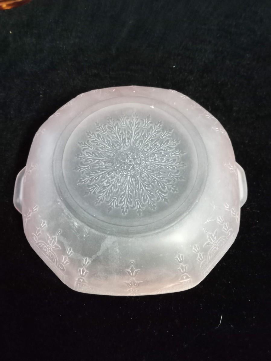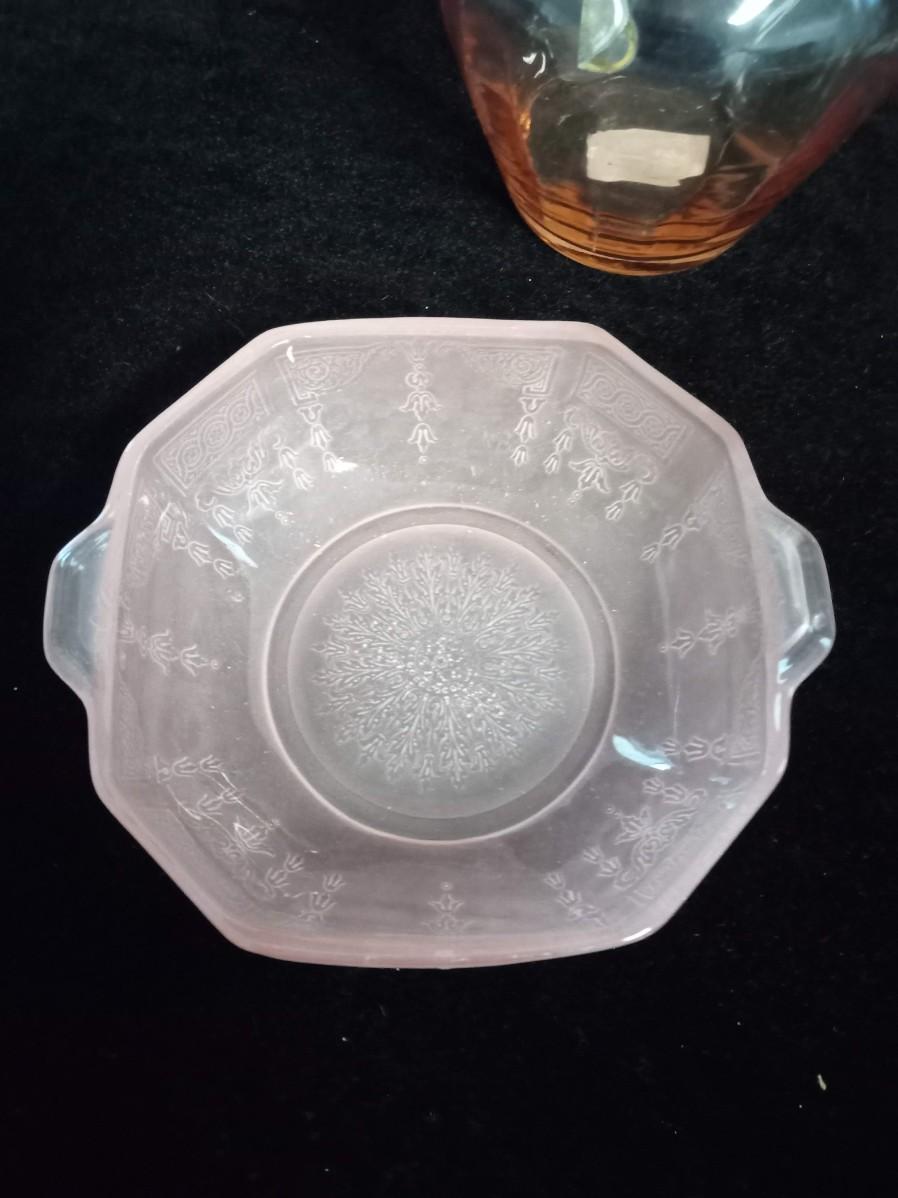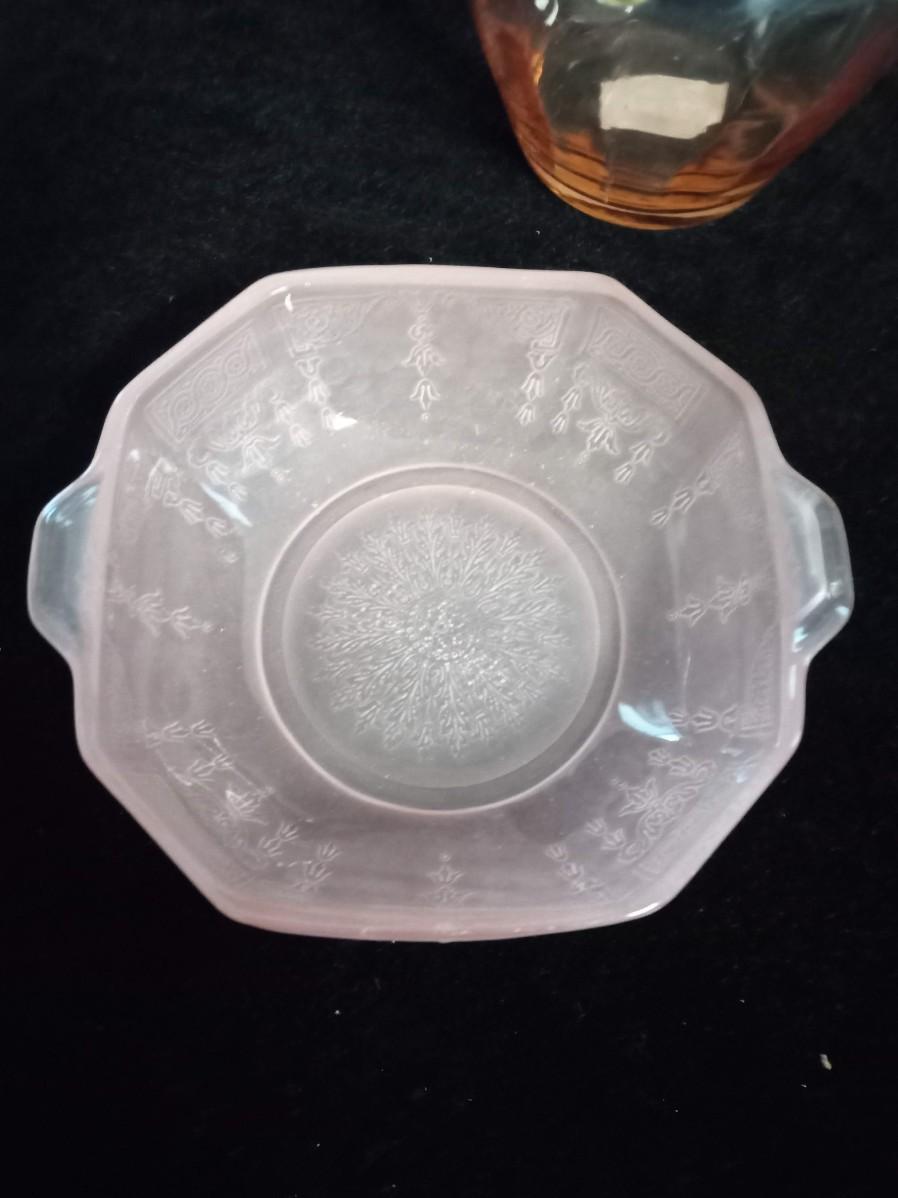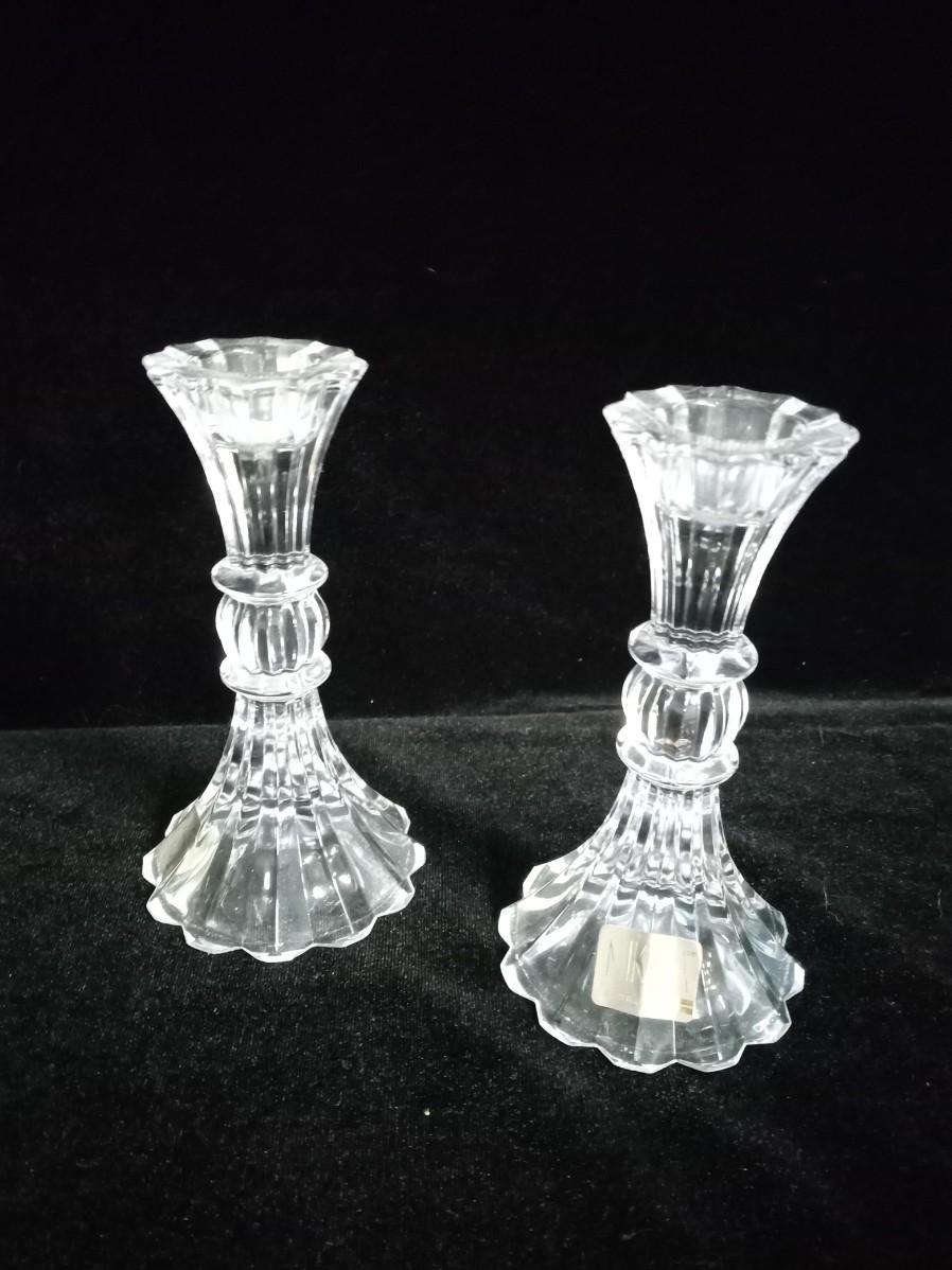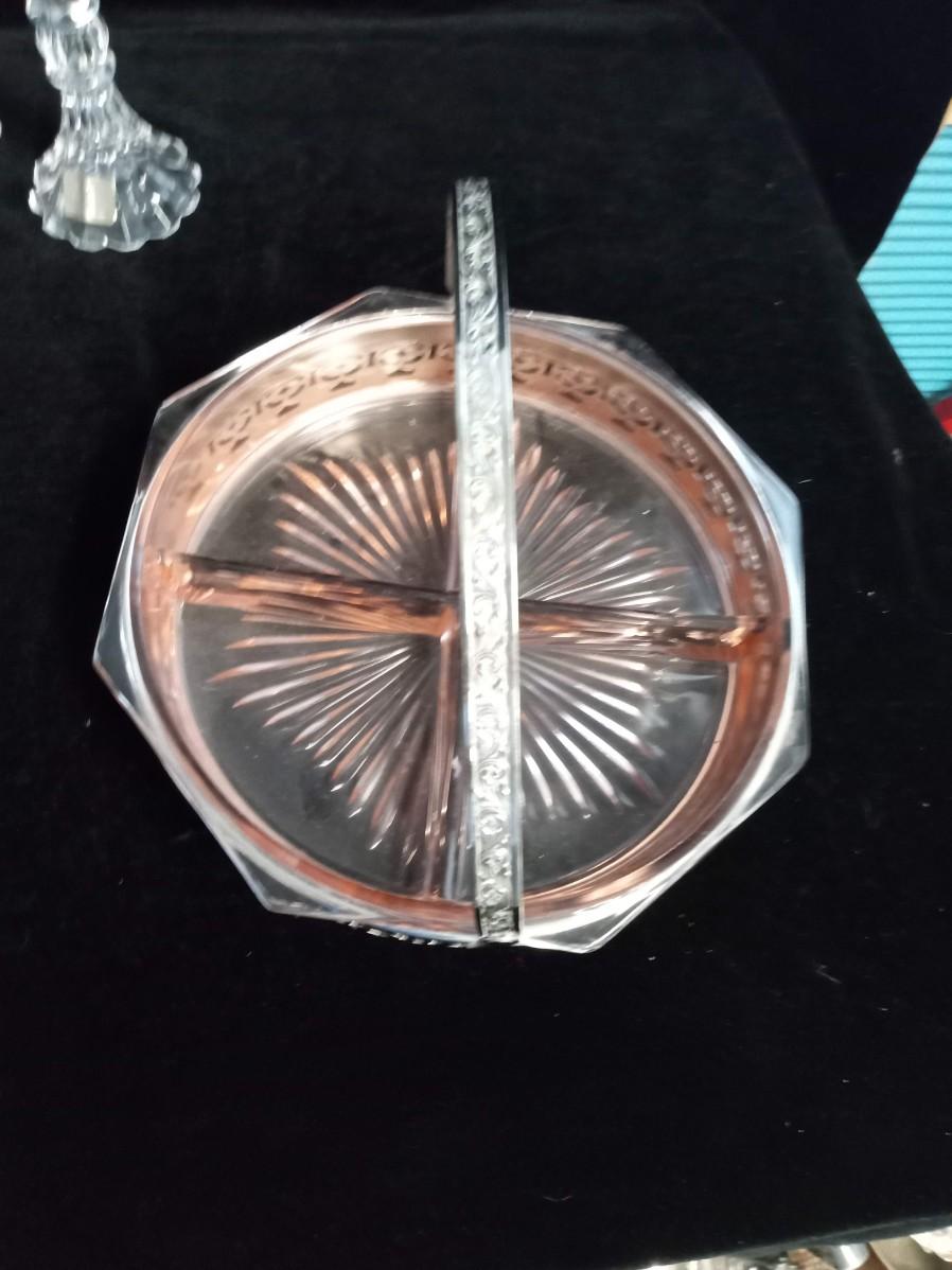 PAIR OF MIKASA CANDLESTICKS. A CAVALIER GLASS VASE AND CONDIMENT BOWL AND A DEPRESSION GLASS DIVIDED DISH WITH A METAL, HANDLED FRAME