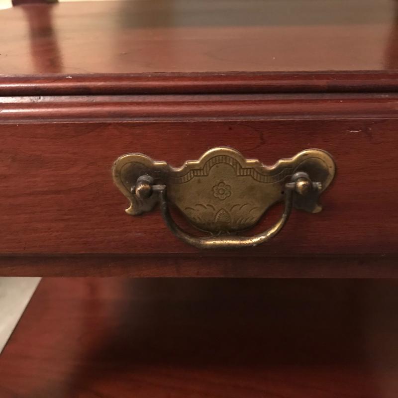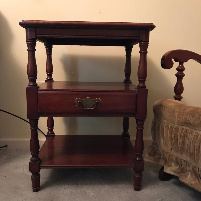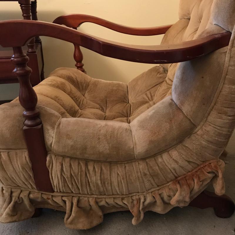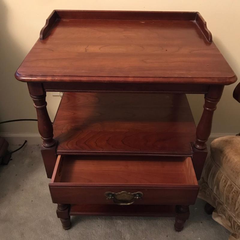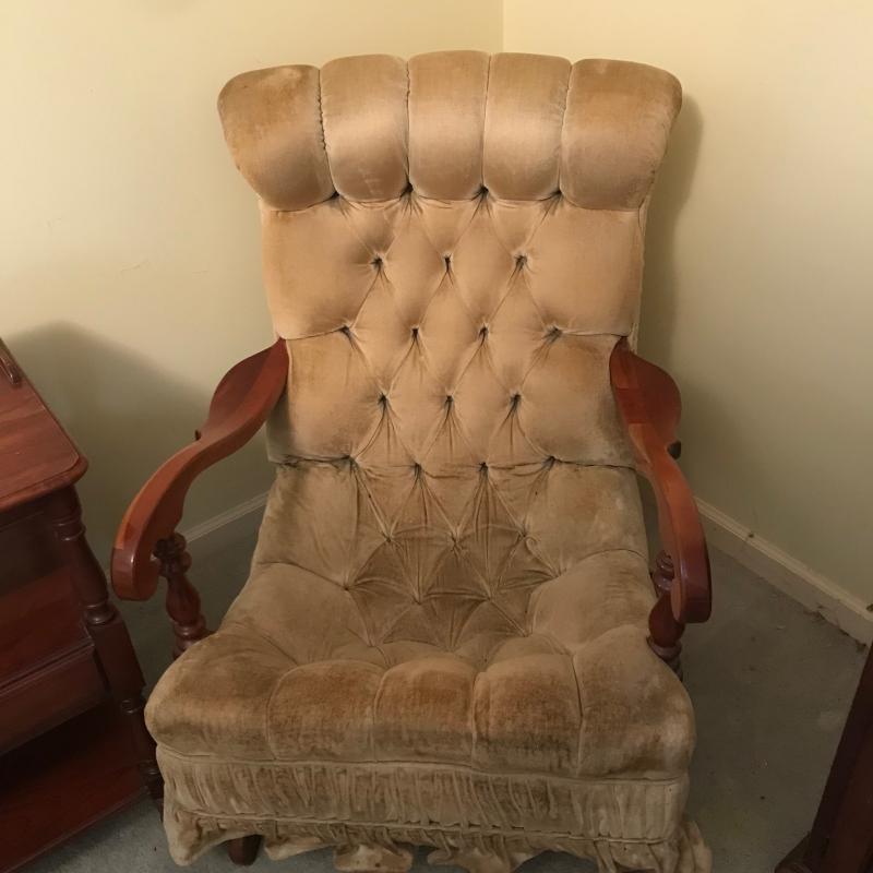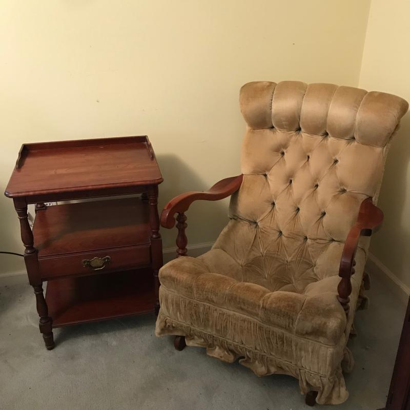 Pennsylvania House Side Table matches other lots in this auction. Lot also includes a vintage curved rocking chair with yellow velvet fabric. Fabric could use a little cleaning but is in overall good condition. Seat is very low to the ground. No shipping. Local pick up only.