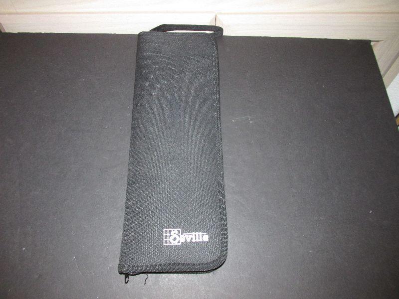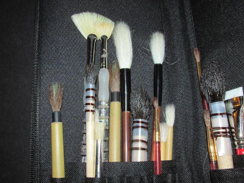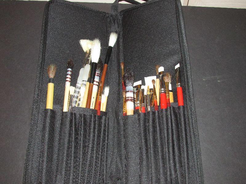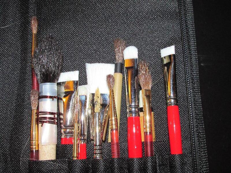 Collection of numerous used paintbrushes of different sizes in Seville black cloth zip up carrying case.