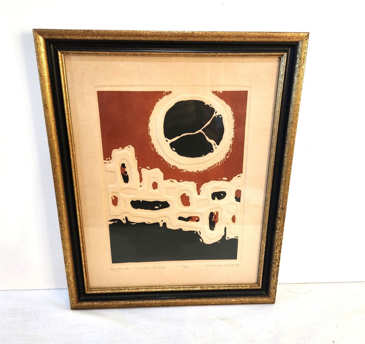 Interesting abstract dimensional print - "Approach to the River" by artist Marian McGill, pencil signed/numbered 32/100. Good condition. 14.5" x 11.5"
