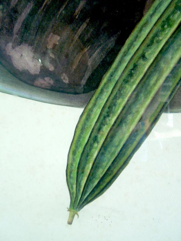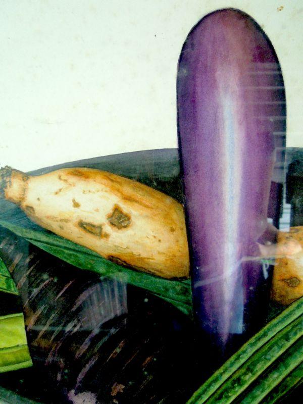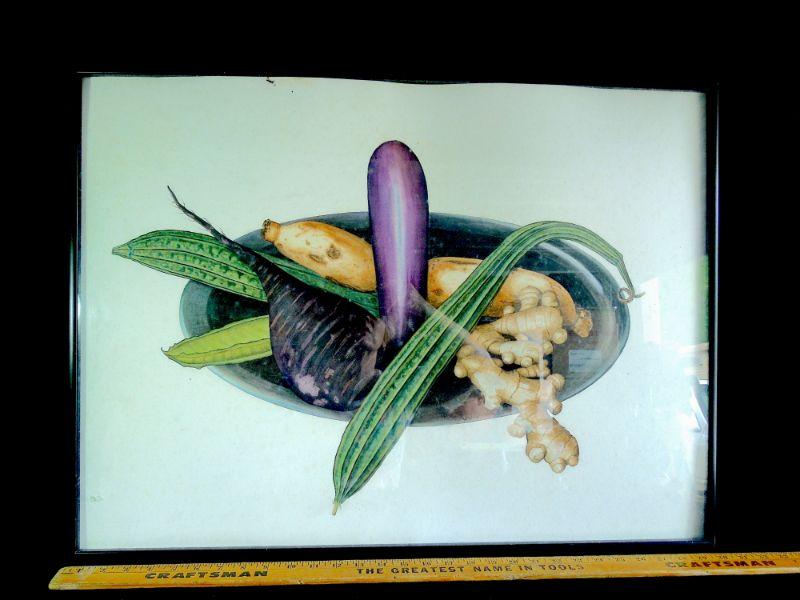 An original vividly rich watercolor of eggplant, ginger, cucumber, radish in a bowl. 30" W x 22" H. Black metal gloss frame under glass. The paper inside the frame is warped and painting needs to be removed and cleaned as there is loose debris between paper and glass.