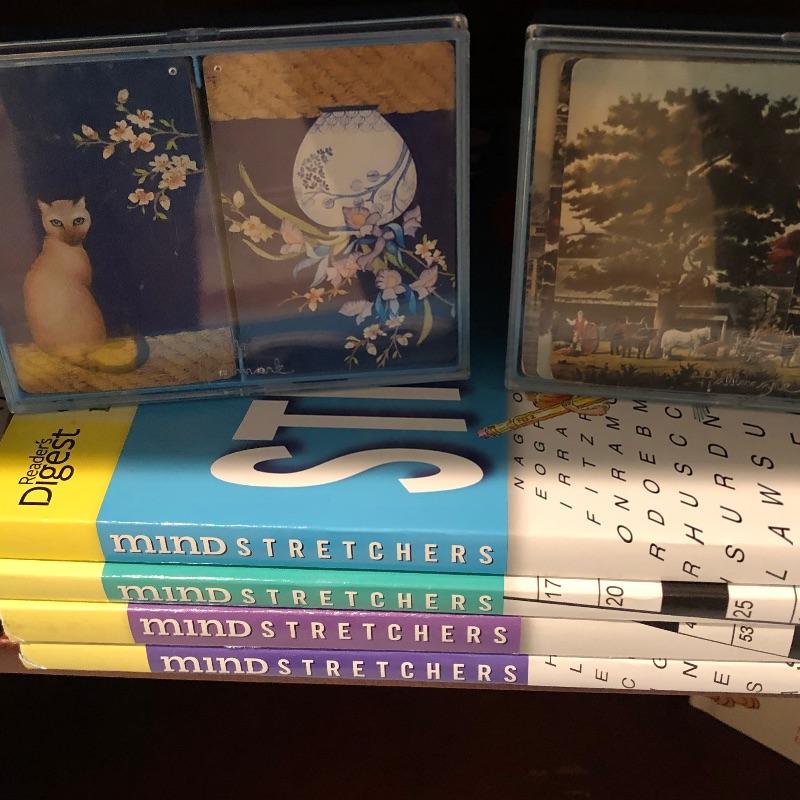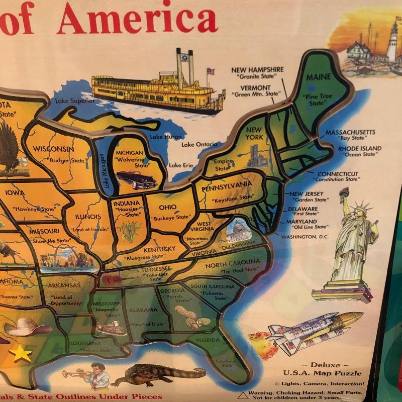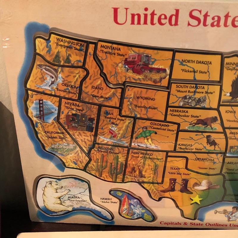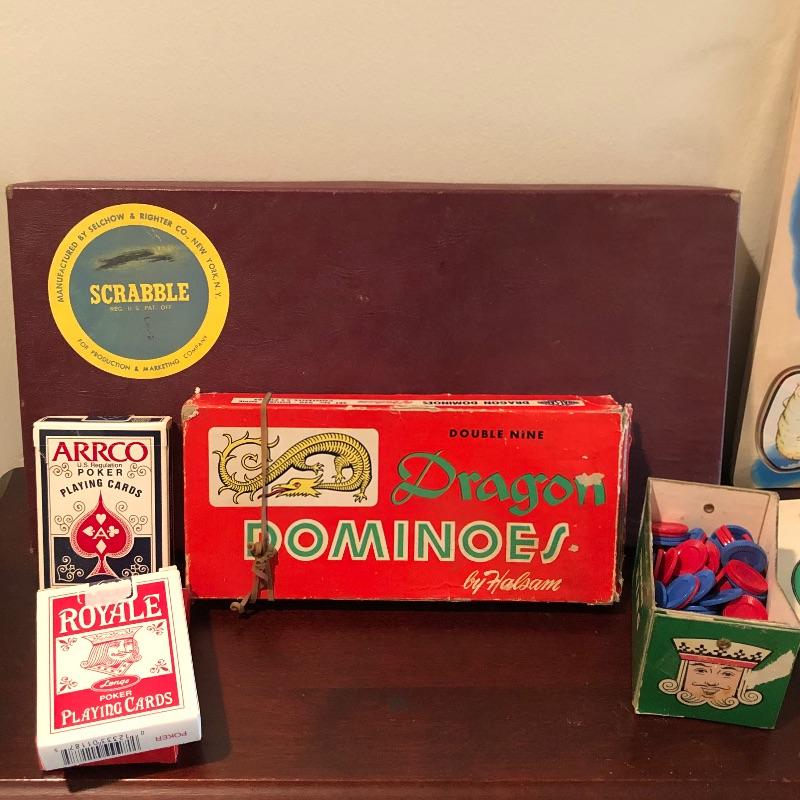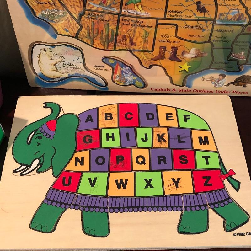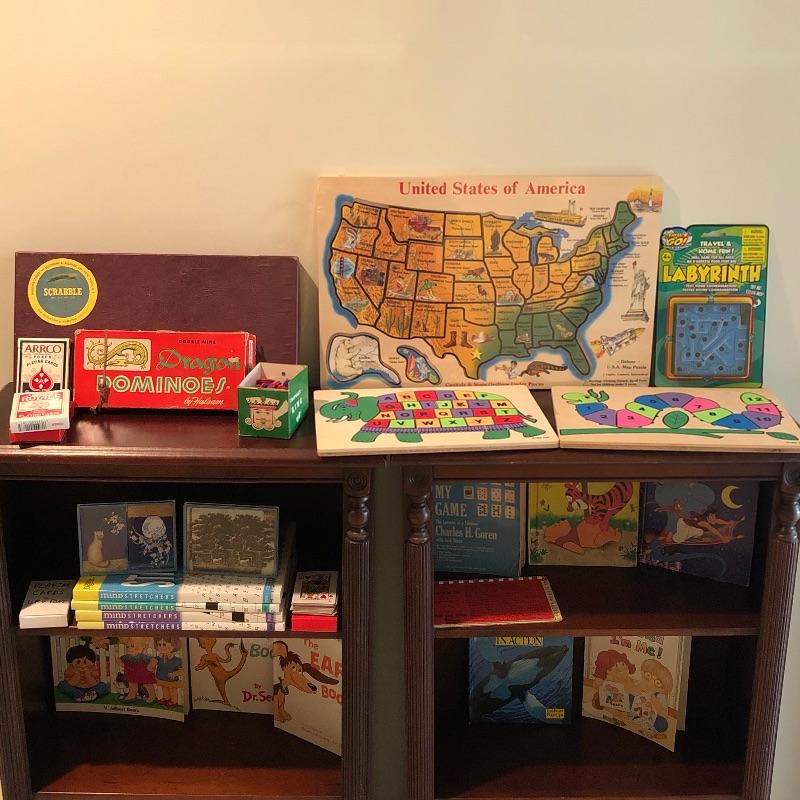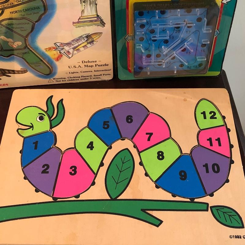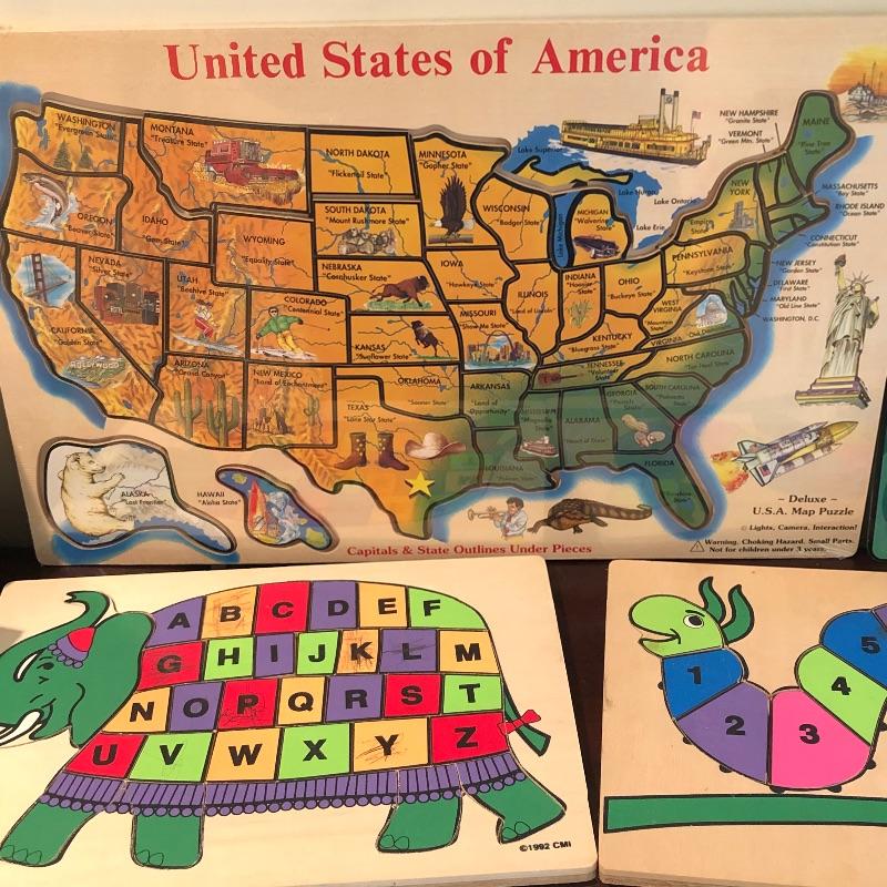 Nice assortment of games, including vintage scrabble, puzzle with wood pieces, map of US puzzle and letters and numbers puzzles etc. Shipping available. Shelves in photo not included.