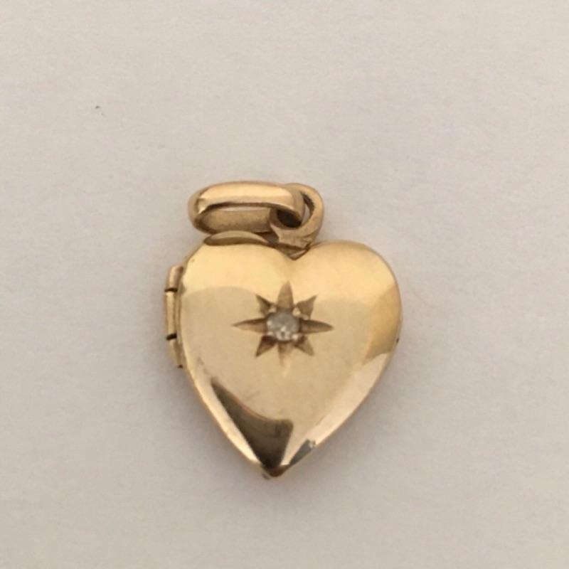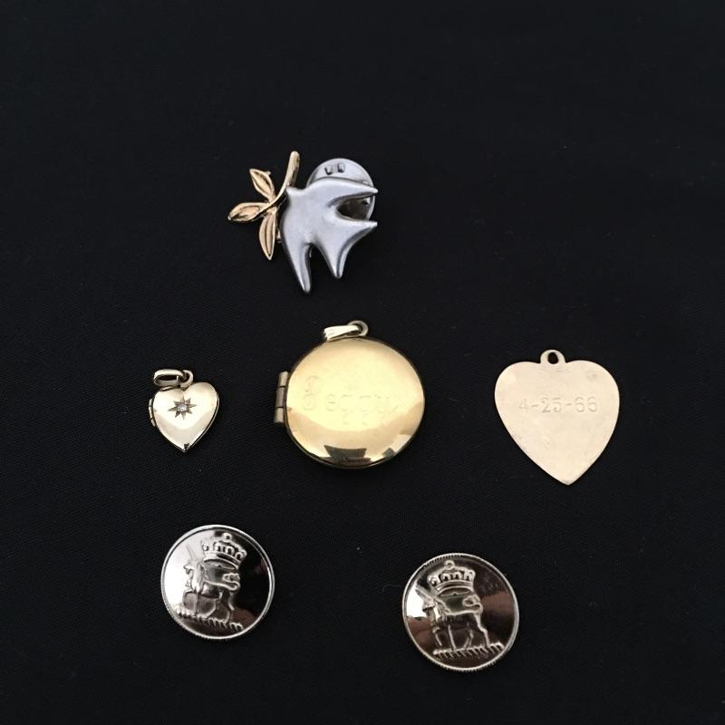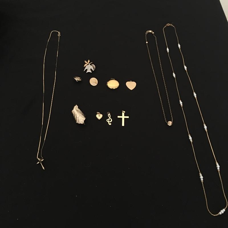 Nice selection of gold jewelry that includes a necklace marked 10KGF, heart shaped locket marked 14k, round locket marked 12KGF, two more necklaces,lockets, pin and more that are unmarked for type of material.