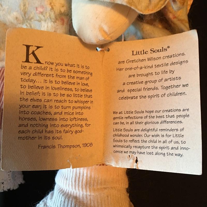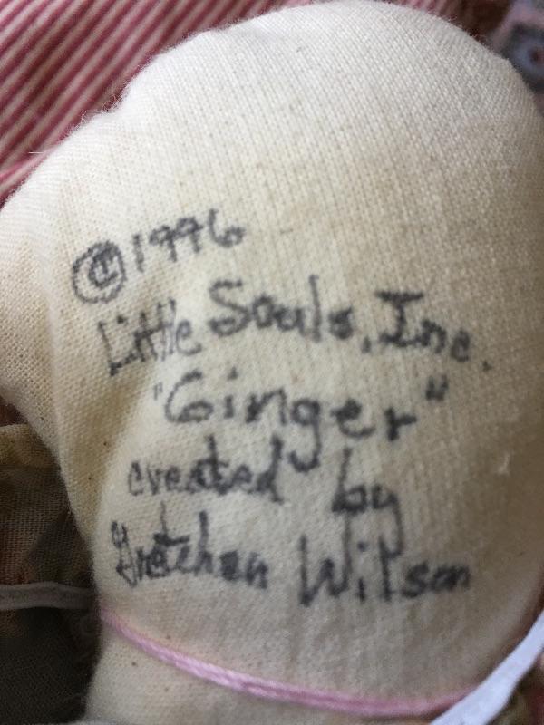 Gretchen Wilson Little Souls doll “ Ginger”. Ginger is marked 1996 on her hand and has her tag attached. A great way to start your Little Souls collection or add to your already existing one. Doll comes from a home with pets and has some pet hair stuck on her outfit. Will need to be cleaned.