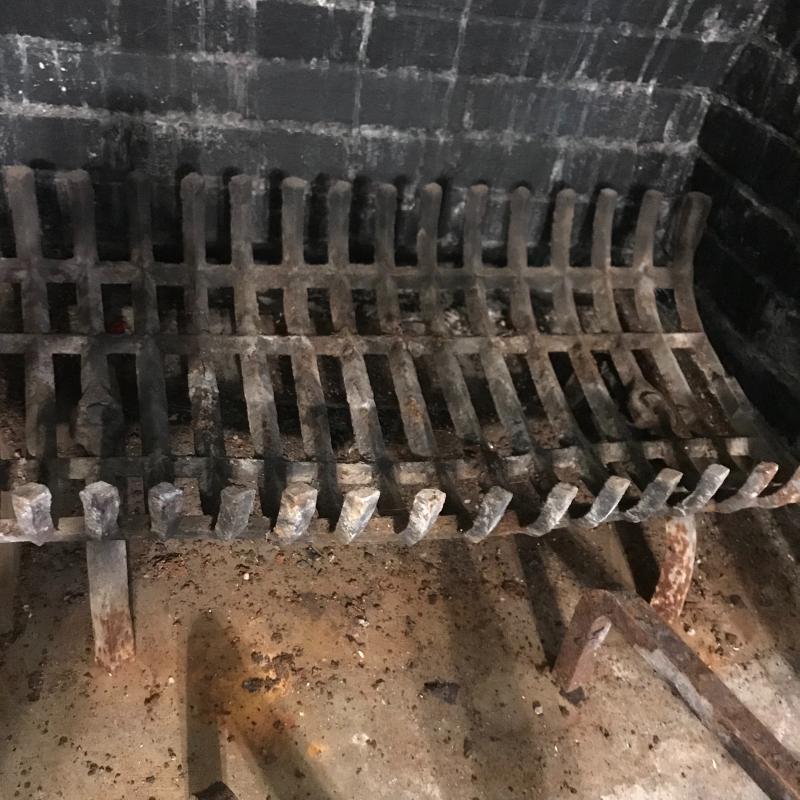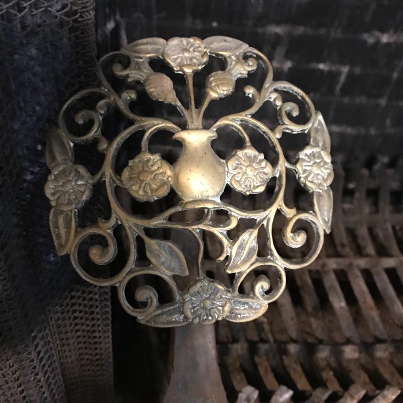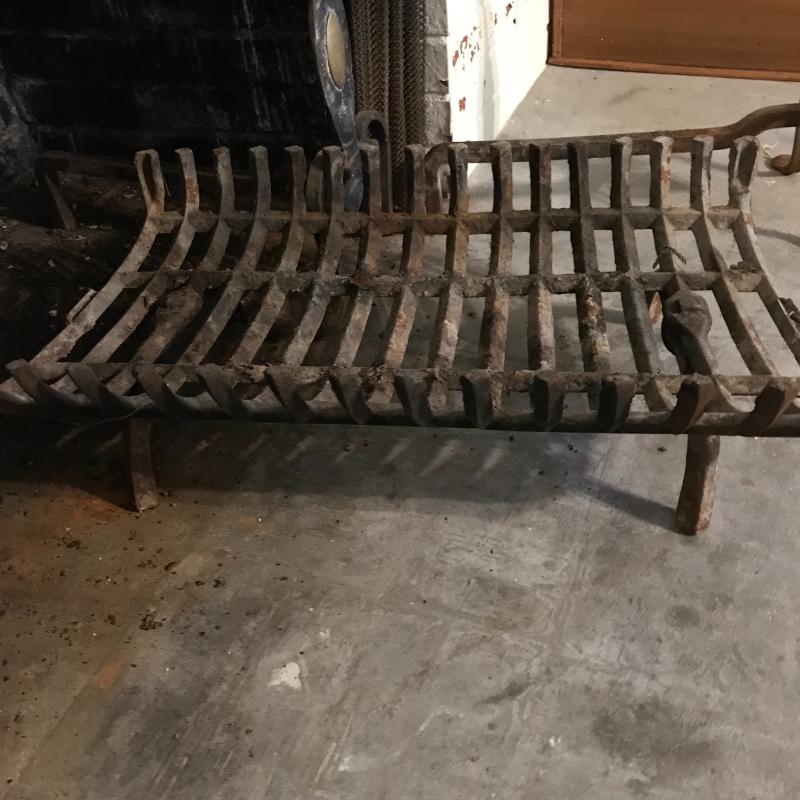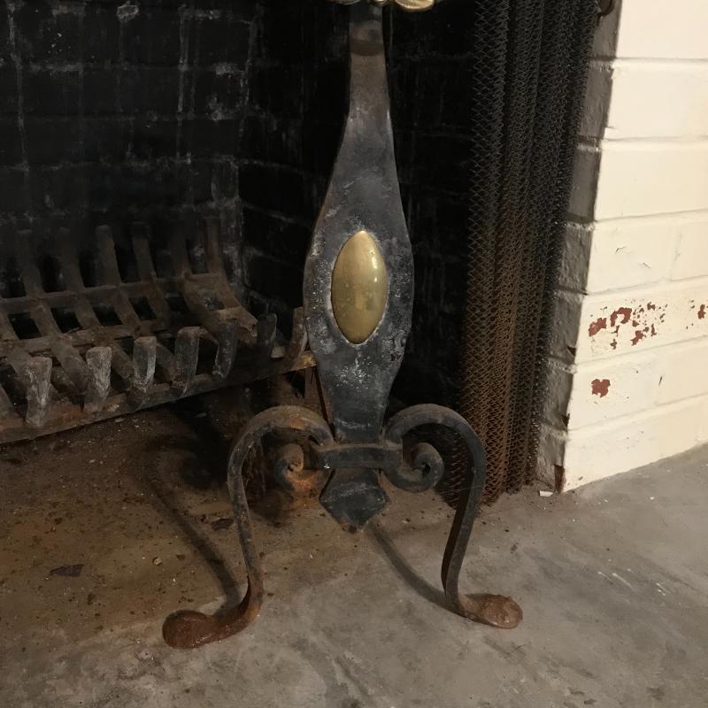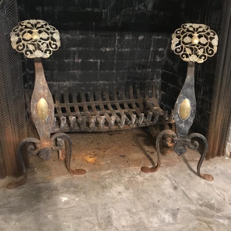 Lot includes an iron grate and two matching iron stands adorned with brass. Stands measure approx. 10.5x18x22” and grate is approx. 27” wide. No shipping.