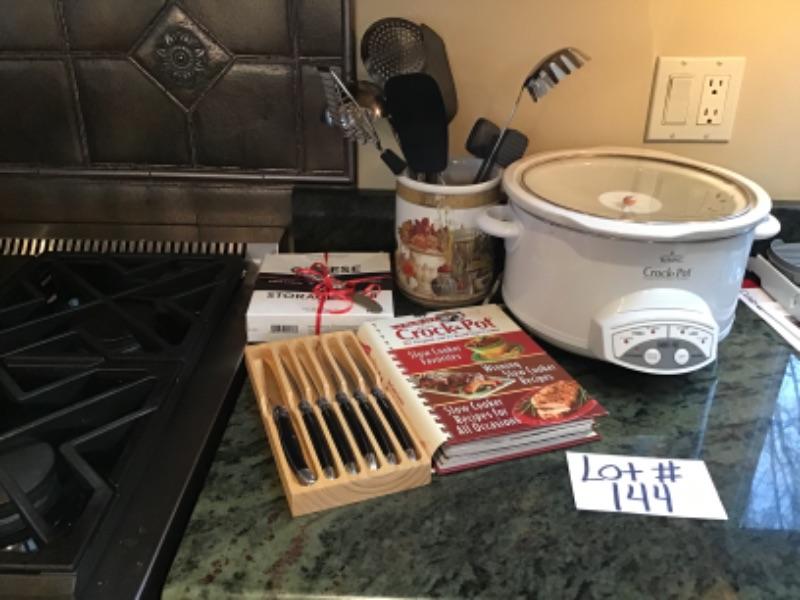Rival Stoneware Crock Pot, Crock pot cookbook, bowls, crock of utensils, 6 barenthal knives w/ holder, cheese storage
