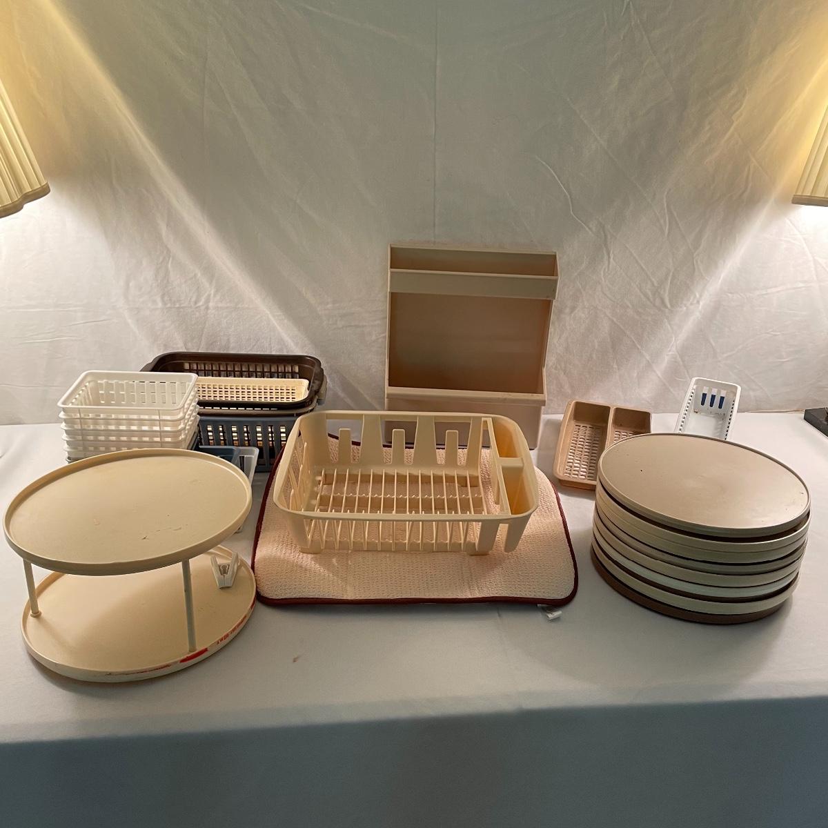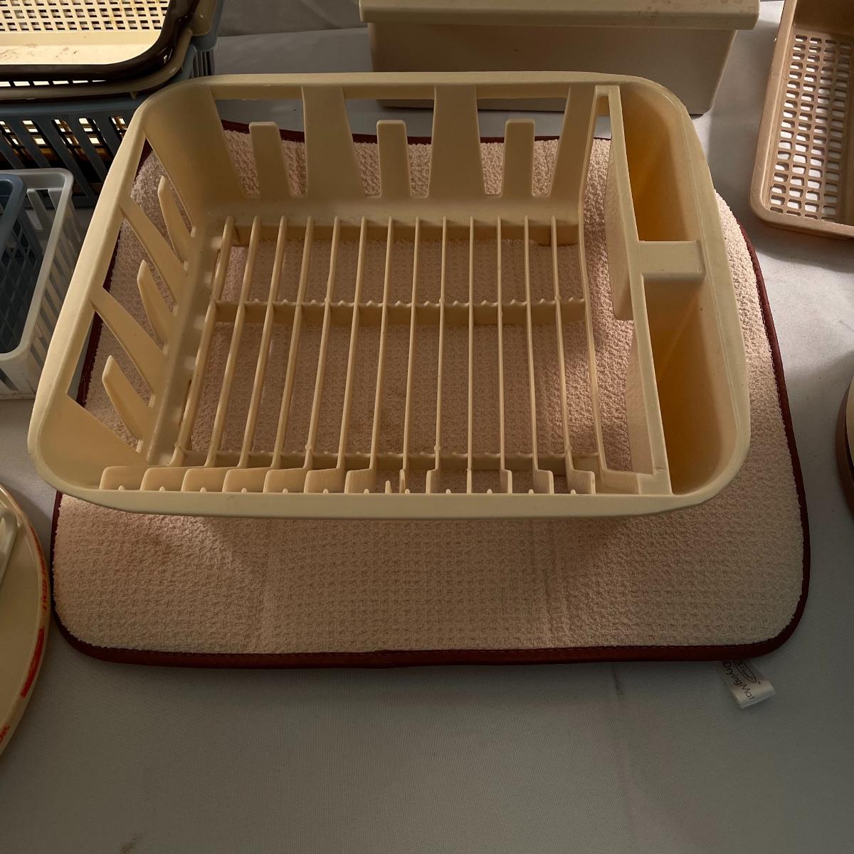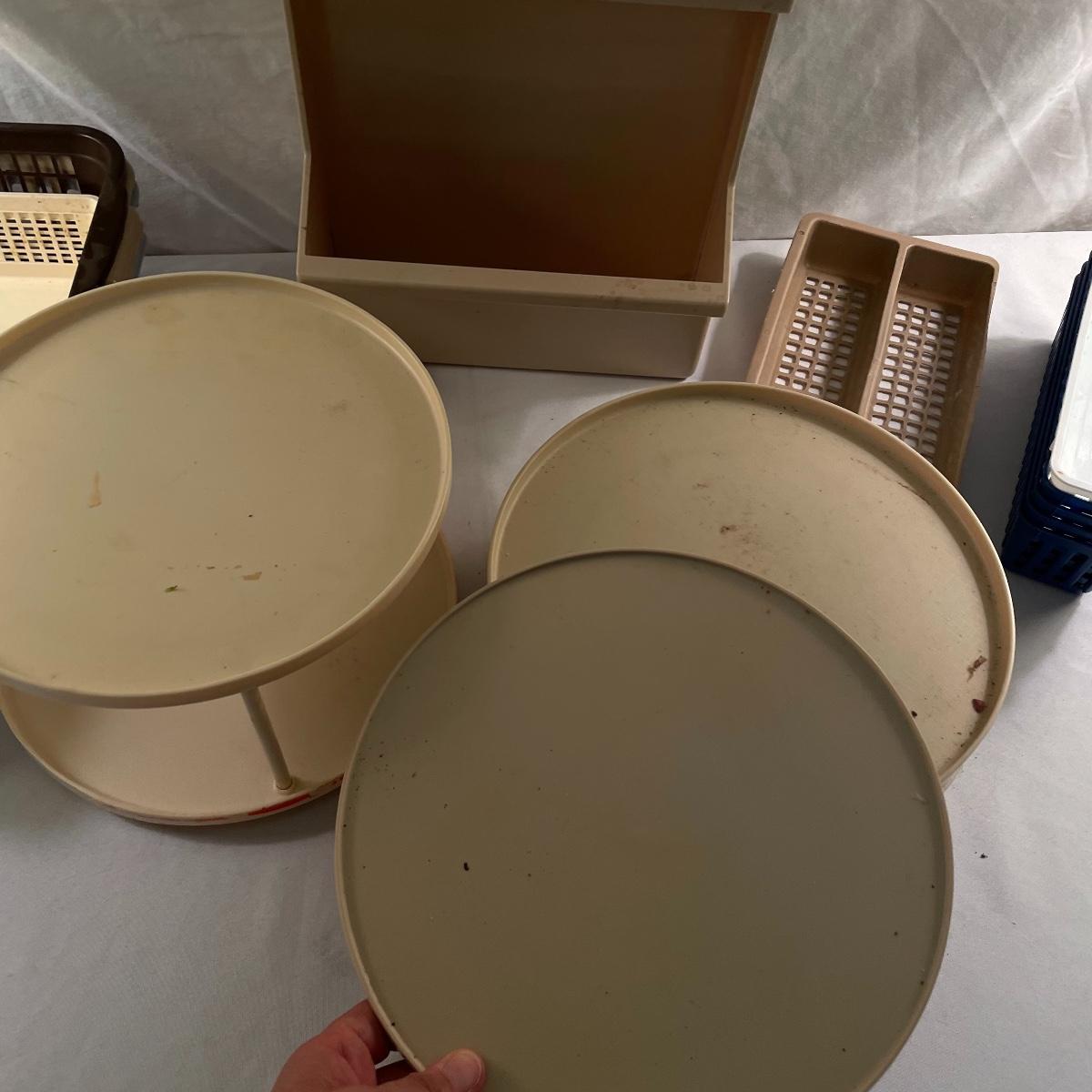 While we hope you have the kitchen of your dreams, we’re here to offer some organizing tools to get you a few steps closer. Lot contains a dish rack with drying mat, the mat is 18” x 16”. Were also offering nine plastic lazy Susan’s plus one two tiered Susan. These are perfect for spices, condiments and can be helpful in pantries, cupboards and even the fridge. Lot also features an easy to clean, shelved rack for your fridge measuring 10.75” x 5.5” x 13.25” and over twenty variously sized plastic baskets so every thing in your kitchen will have the perfect home. Most items need to be cleaned, but all have a lot of life left. See images. Local pick up only.