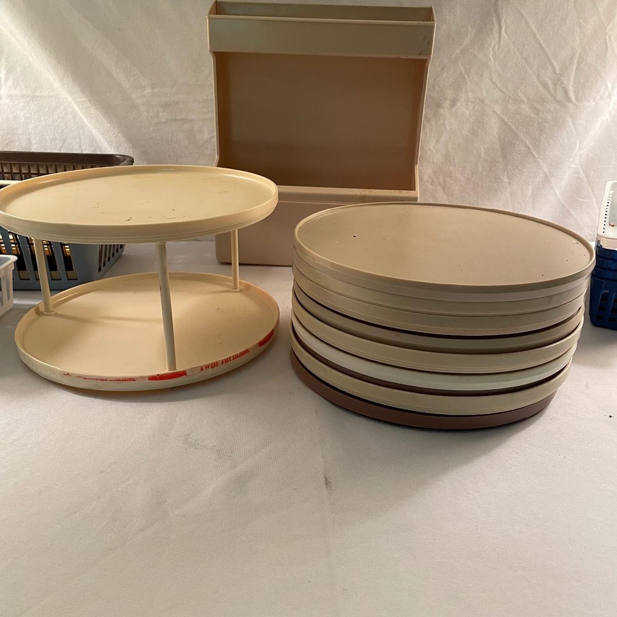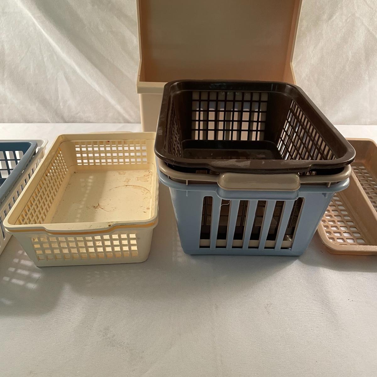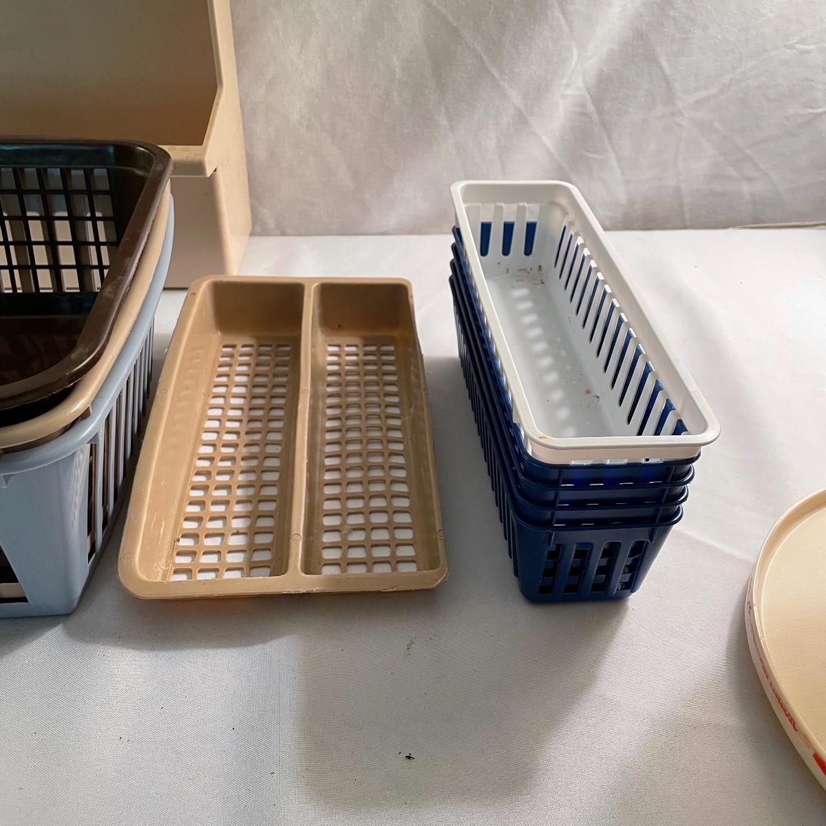 While we hope you have the kitchen of your dreams, we’re here to offer some organizing tools to get you a few steps closer. Lot contains a dish rack with drying mat, the mat is 18” x 16”. Were also offering nine plastic lazy Susan’s plus one two tiered Susan. These are perfect for spices, condiments and can be helpful in pantries, cupboards and even the fridge. Lot also features an easy to clean, shelved rack for your fridge measuring 10.75” x 5.5” x 13.25” and over twenty variously sized plastic baskets so every thing in your kitchen will have the perfect home. Most items need to be cleaned, but all have a lot of life left. See images. Local pick up only.