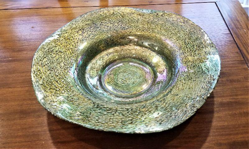 Very pretty large (19" across) art glass abstract center bowl. Good condition.