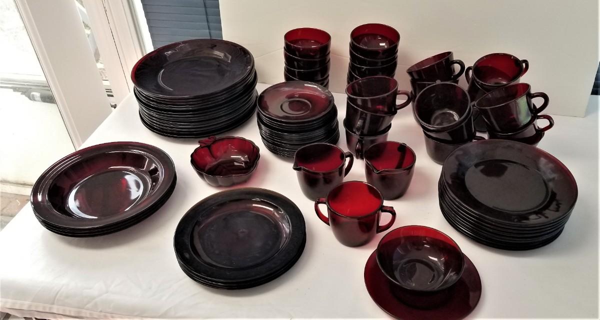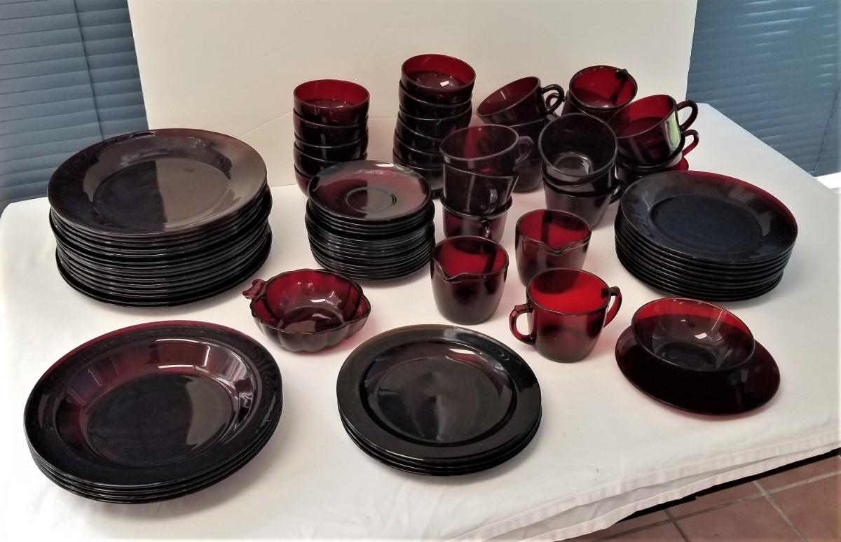 You get all you see here: 15 plats (9" across), 10 small bowls, 15 cups, 16 cup saucers, 2 creamers, 1 open sugar, 4 soup bowls, 10 salad/dessert plates, several miscellaneous pieces. All in good condition. Vintage Ruby Red Glass.