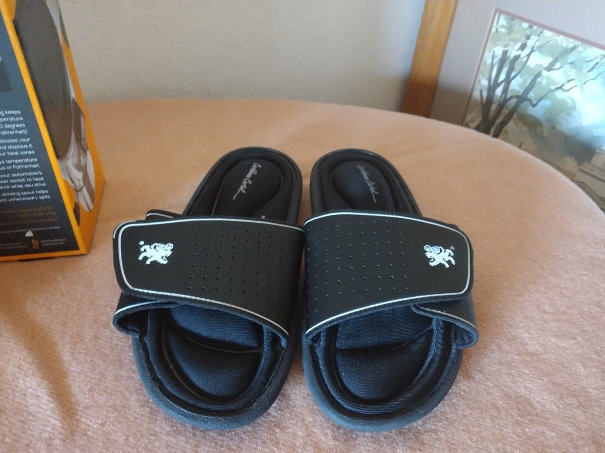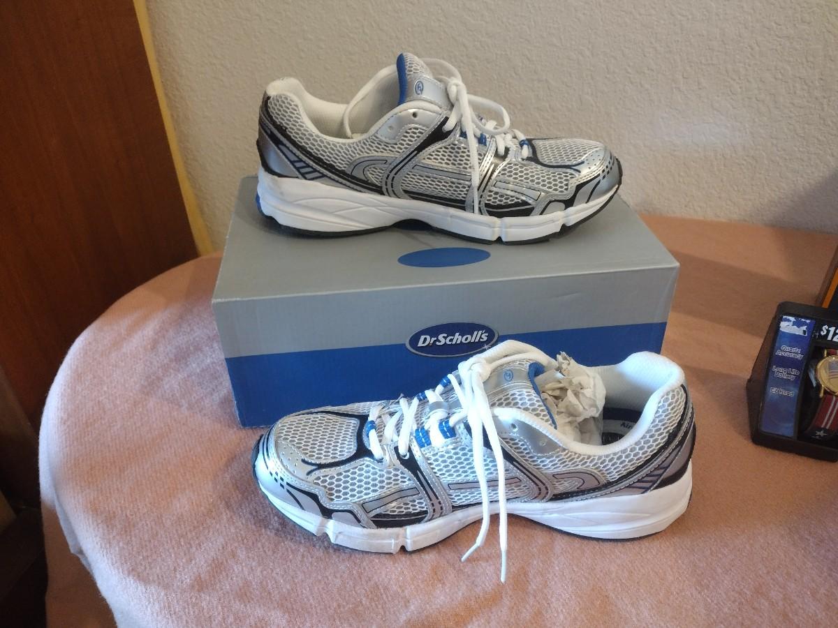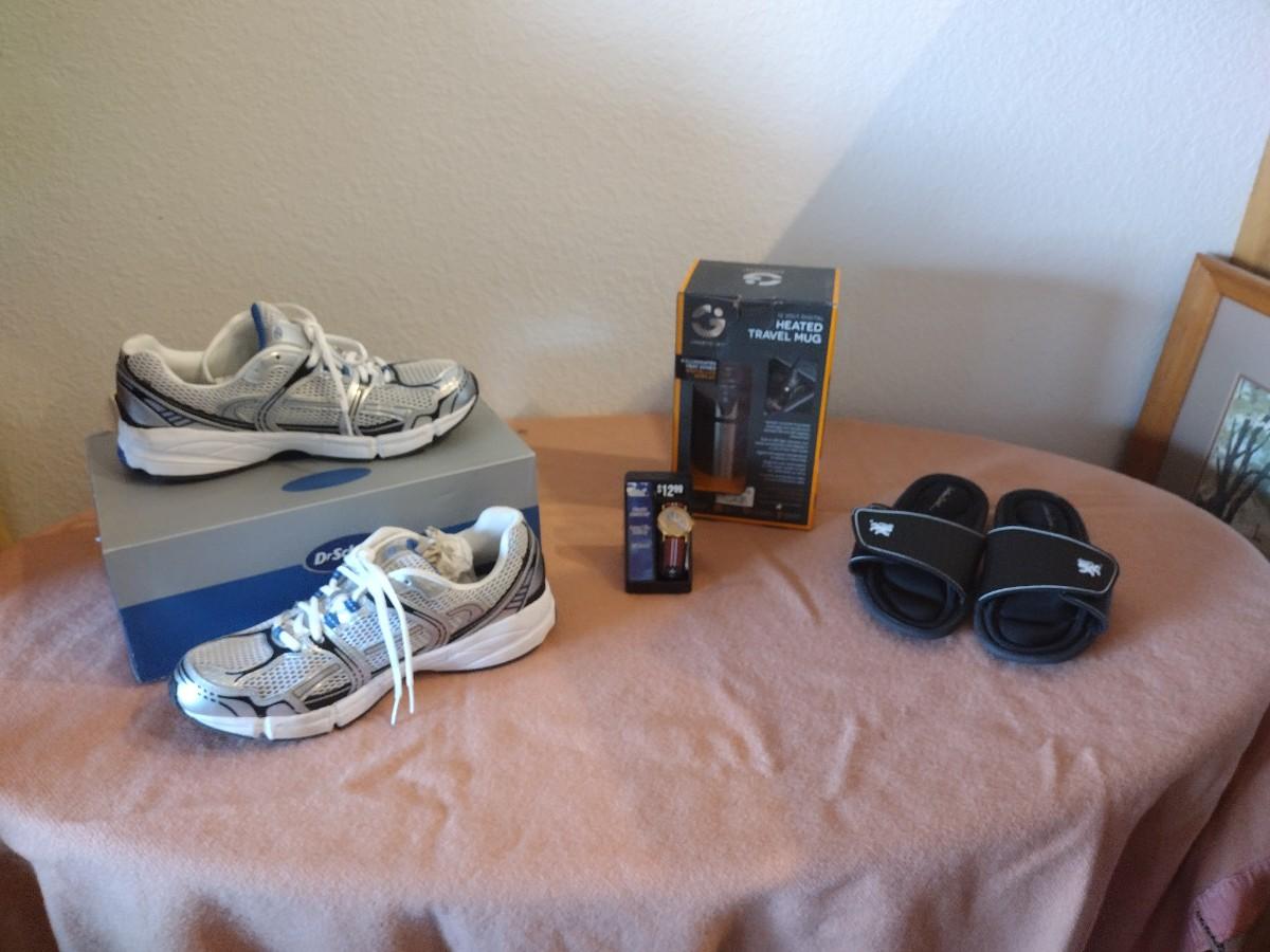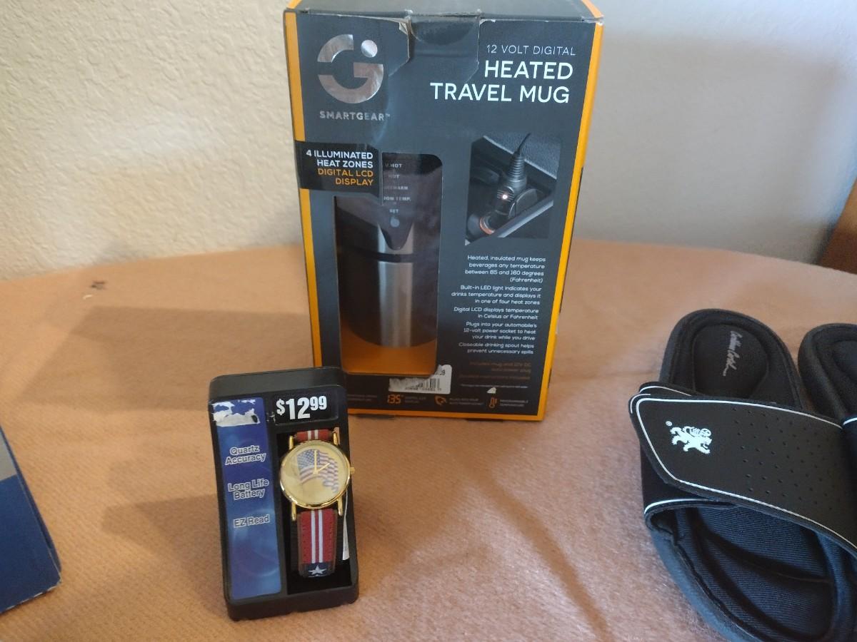 BRAND NEW DR. SCHOLL'S SHOES SIZE 9 1/2 , NEW HEATED TRAVEL MUG, AMERICAN FLAG WATCH, AND MEMORY FOAM SLIP ON SANDLES
