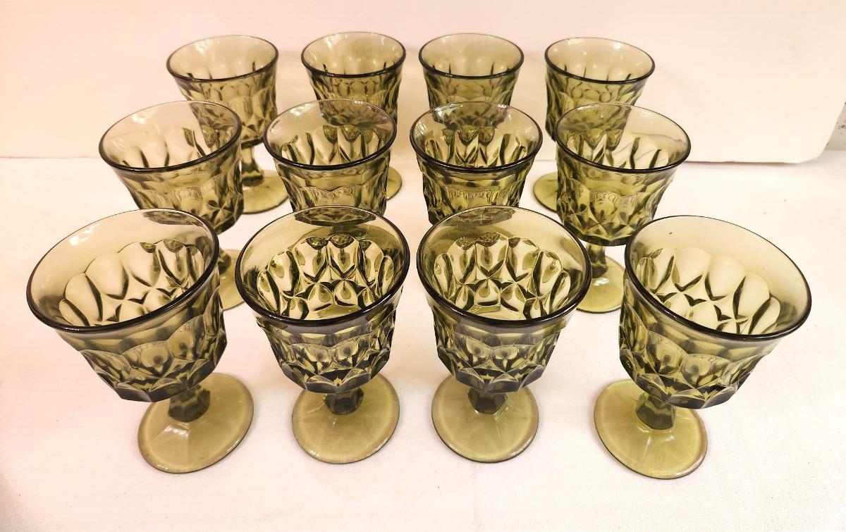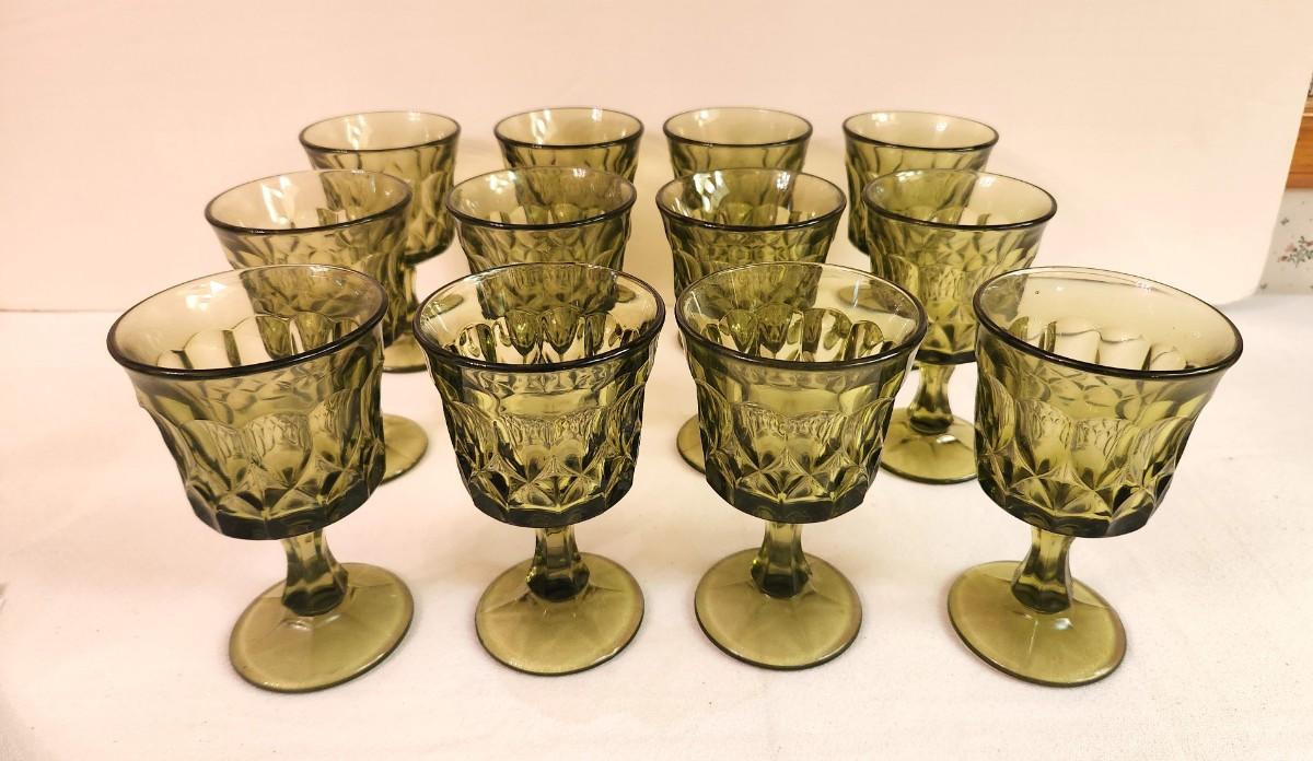 Avocado Green Mid Century glassware - Noritake cordials in the "Perspective" pattern - lot of 12. Each 5" tall - all in good condition.