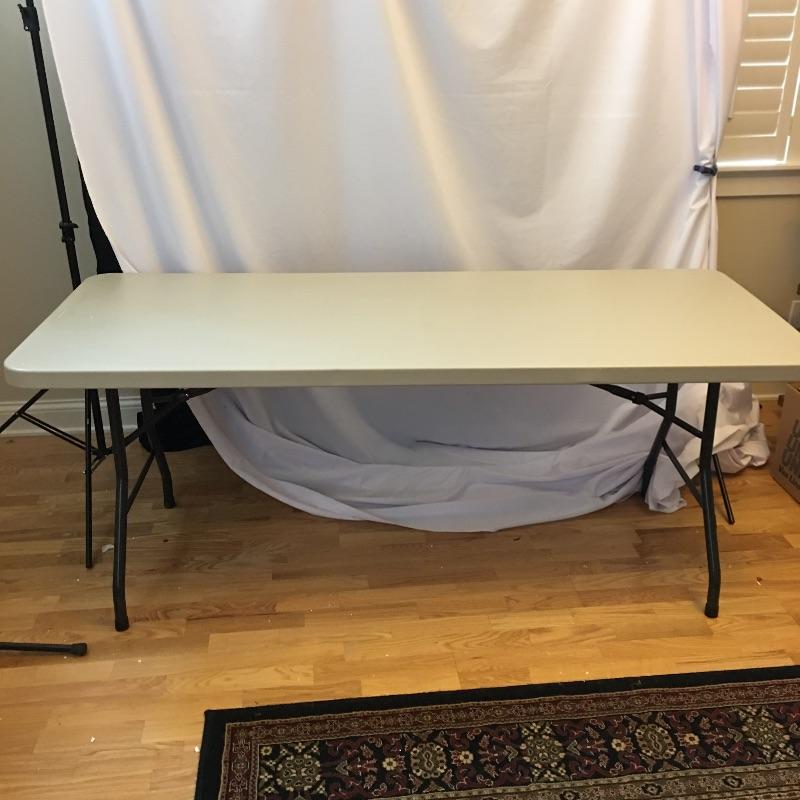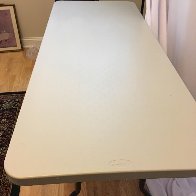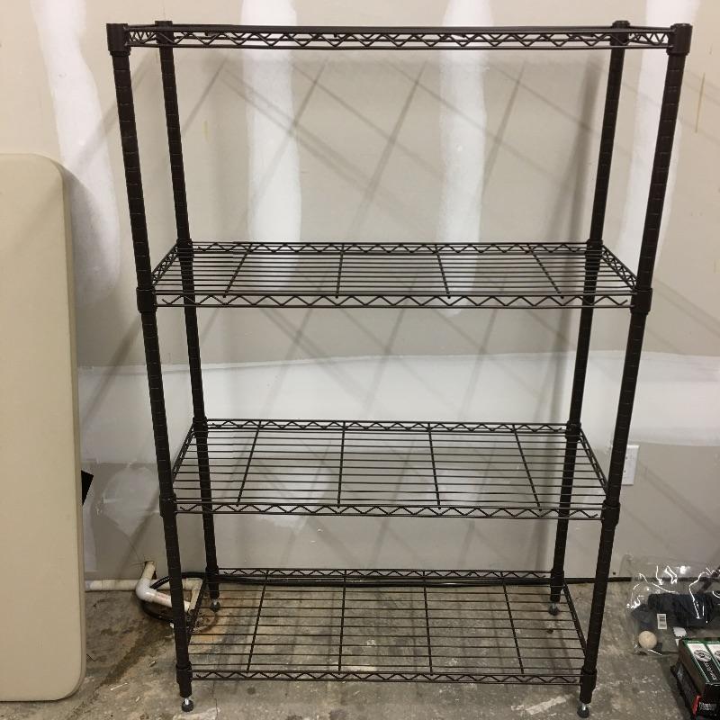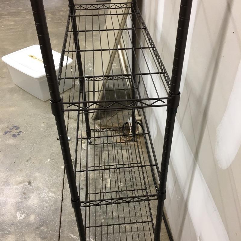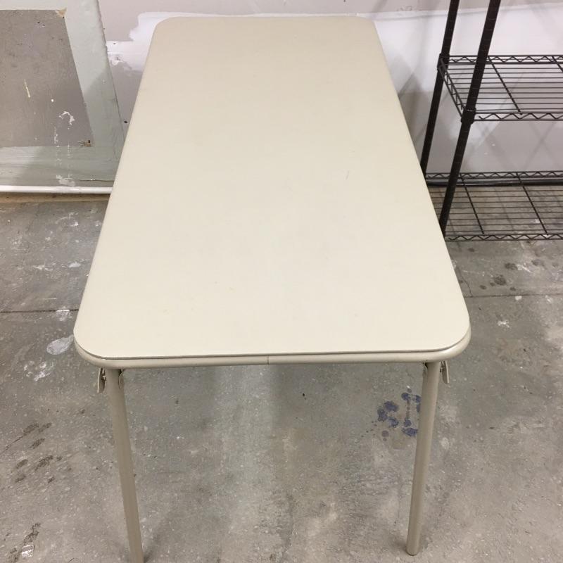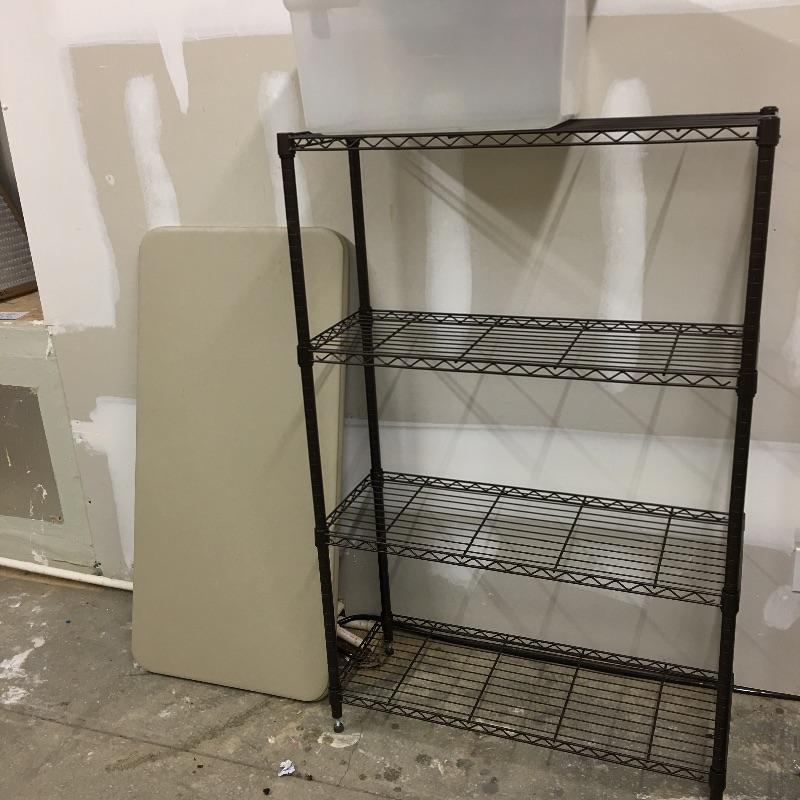 Metal shelving unit with four shelf’s , two plastic folding tables and one clear bin with top. Metal shelving unit measures 13” x 36” x 55.5”. A great lot for storage and tables.