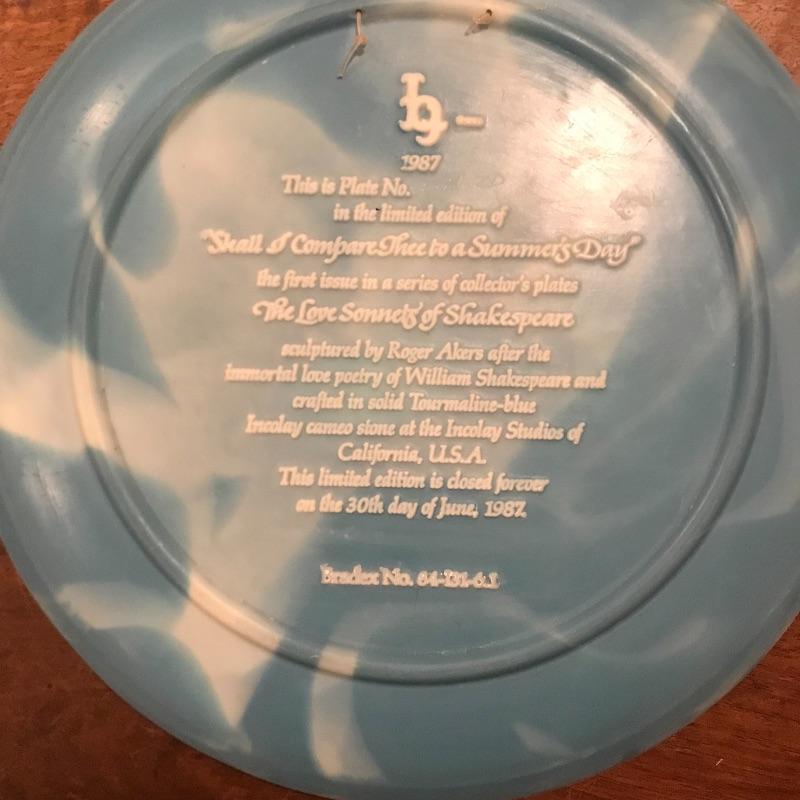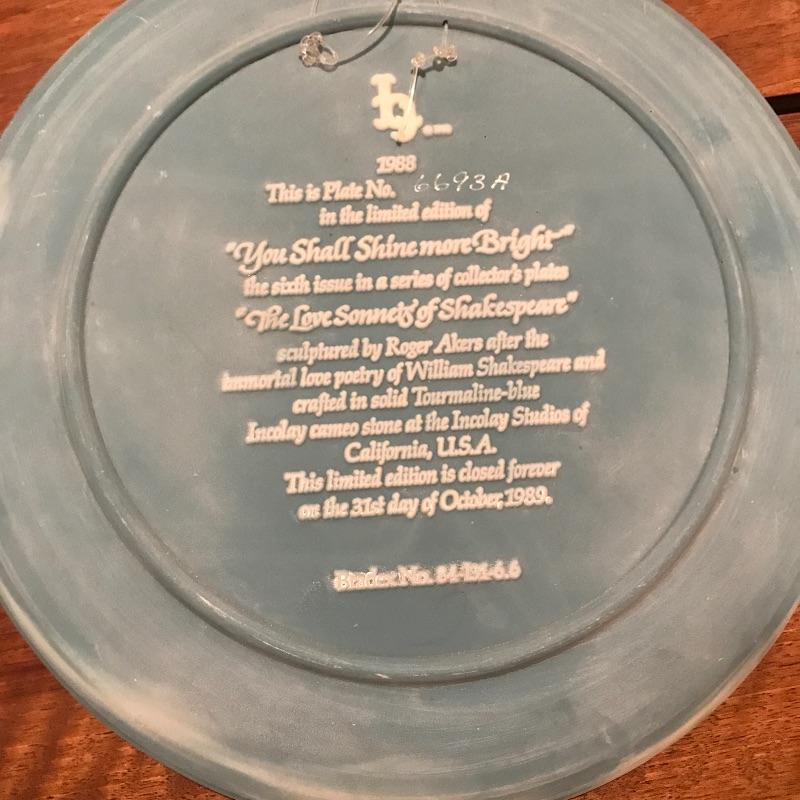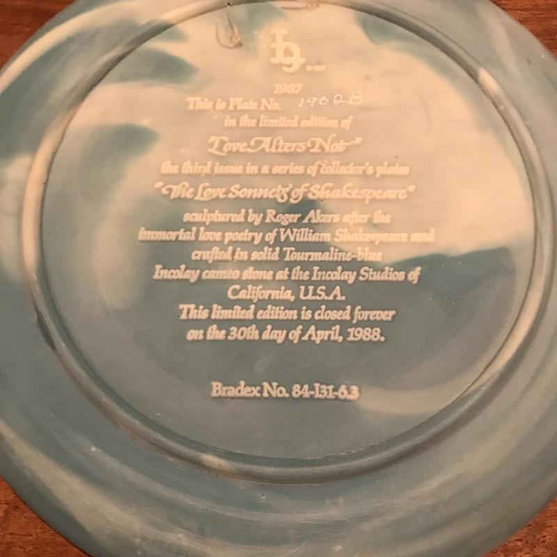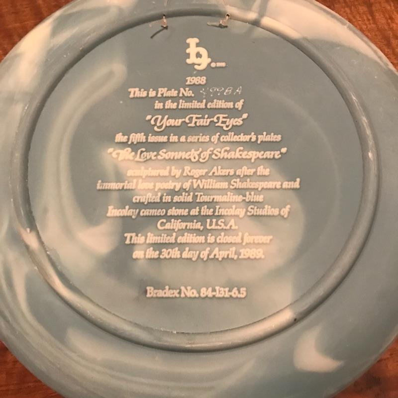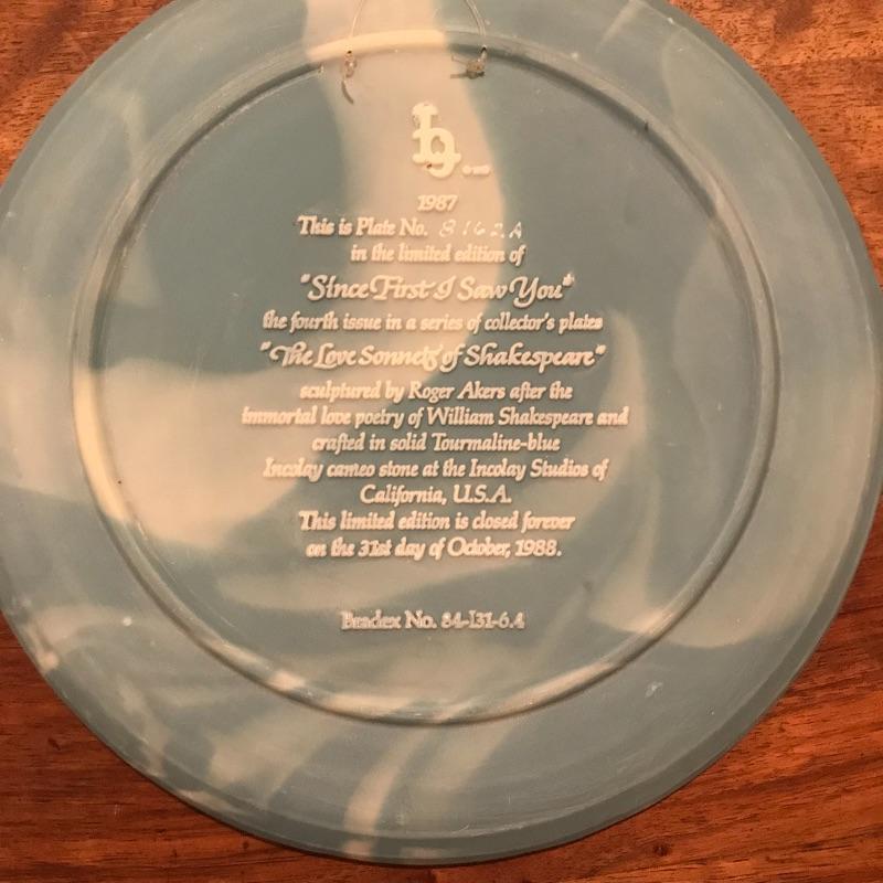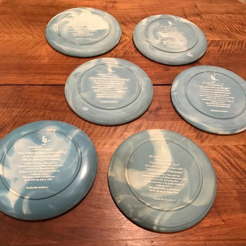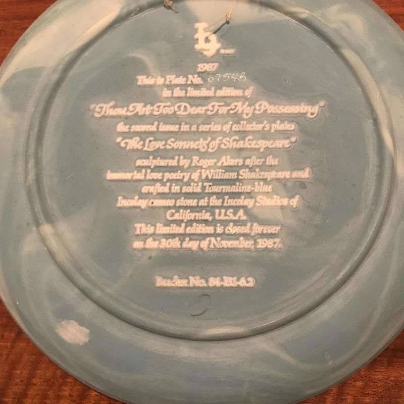 This 6-piece plate collection by artist Roger Akers is inspired by The Love Sonnet of Shakespeare. Collection includes Shall I Compare Thee to a Summer’s Day, Since First I Saw You, You Shall Shine More Bright, Thou Art Too Dear for My Possessing, Your Fair Eyes, and Love Alters Not. Plates are made from solid Tourmaline-blue Incolay cameo stone, approx. 9” in diameter, and include certificates of authenticity. See pics. Shipping available.