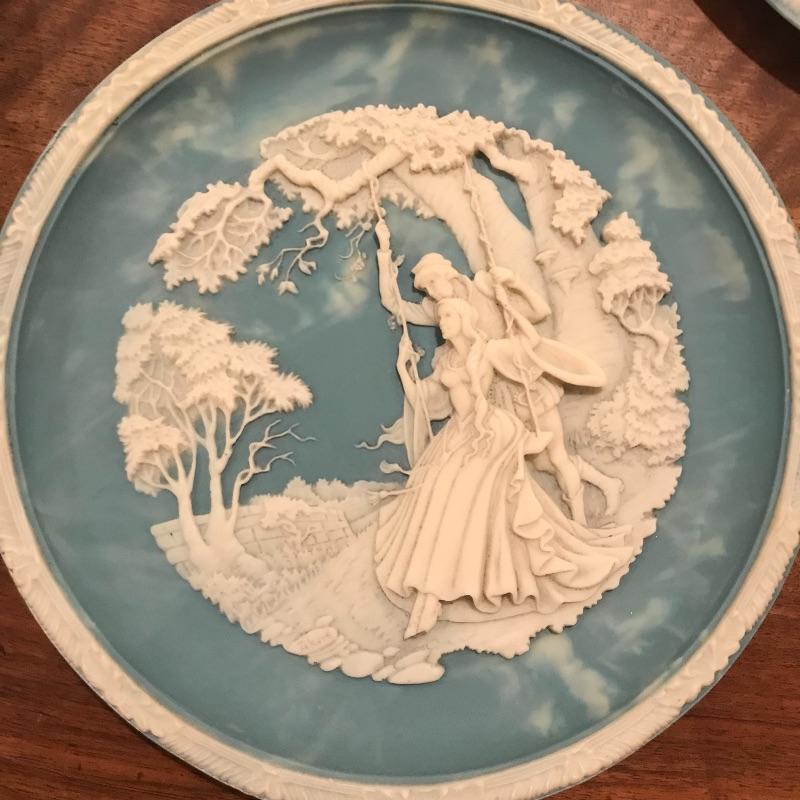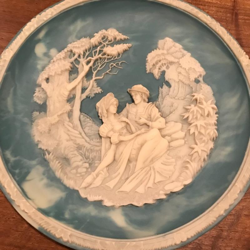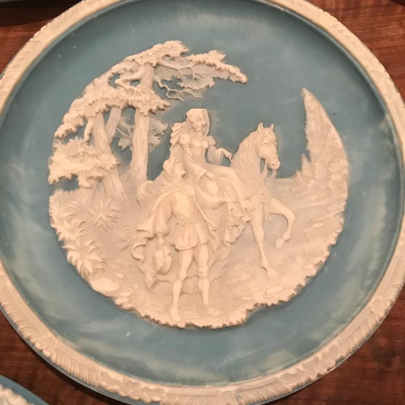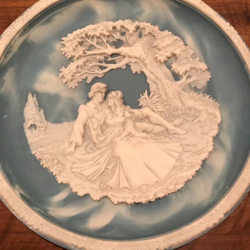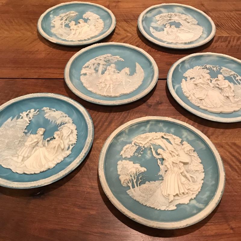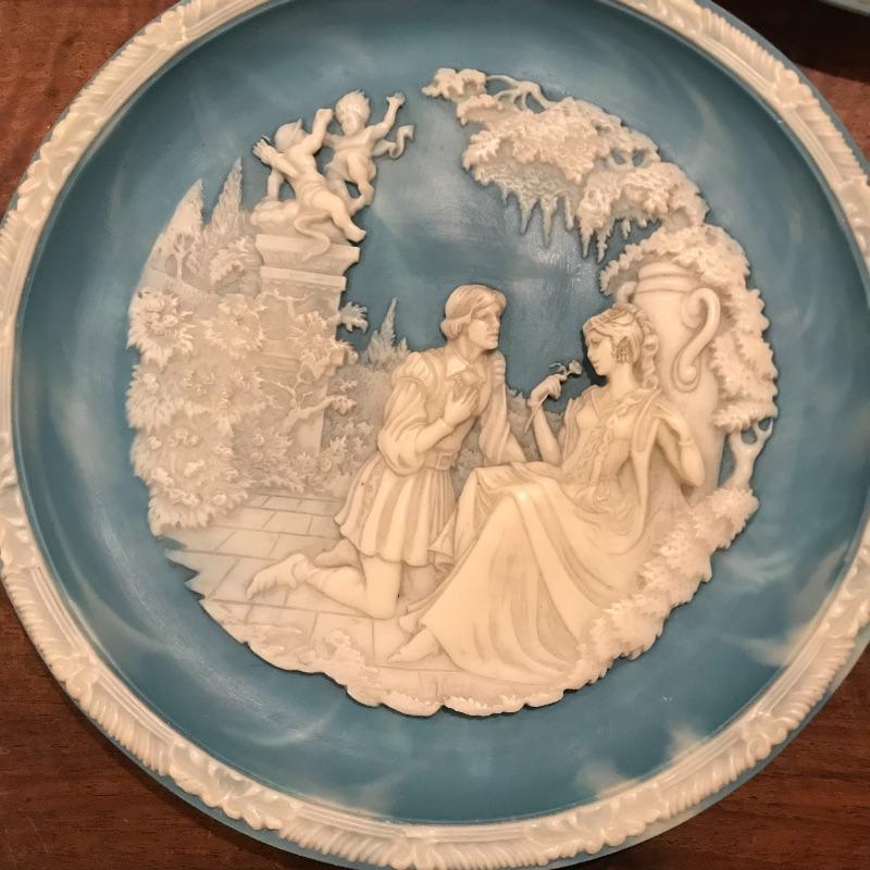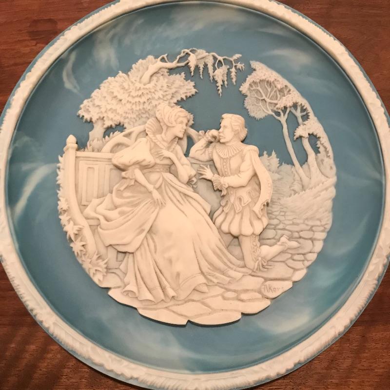 This 6-piece plate collection by artist Roger Akers is inspired by The Love Sonnet of Shakespeare. Collection includes Shall I Compare Thee to a Summer’s Day, Since First I Saw You, You Shall Shine More Bright, Thou Art Too Dear for My Possessing, Your Fair Eyes, and Love Alters Not. Plates are made from solid Tourmaline-blue Incolay cameo stone, approx. 9” in diameter, and include certificates of authenticity. See pics. Shipping available.