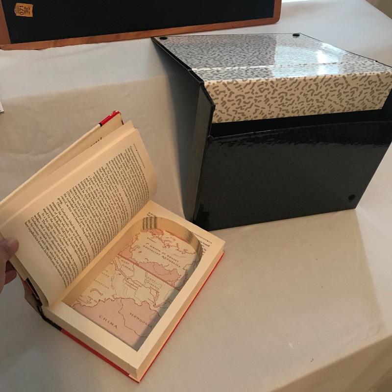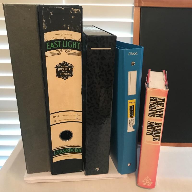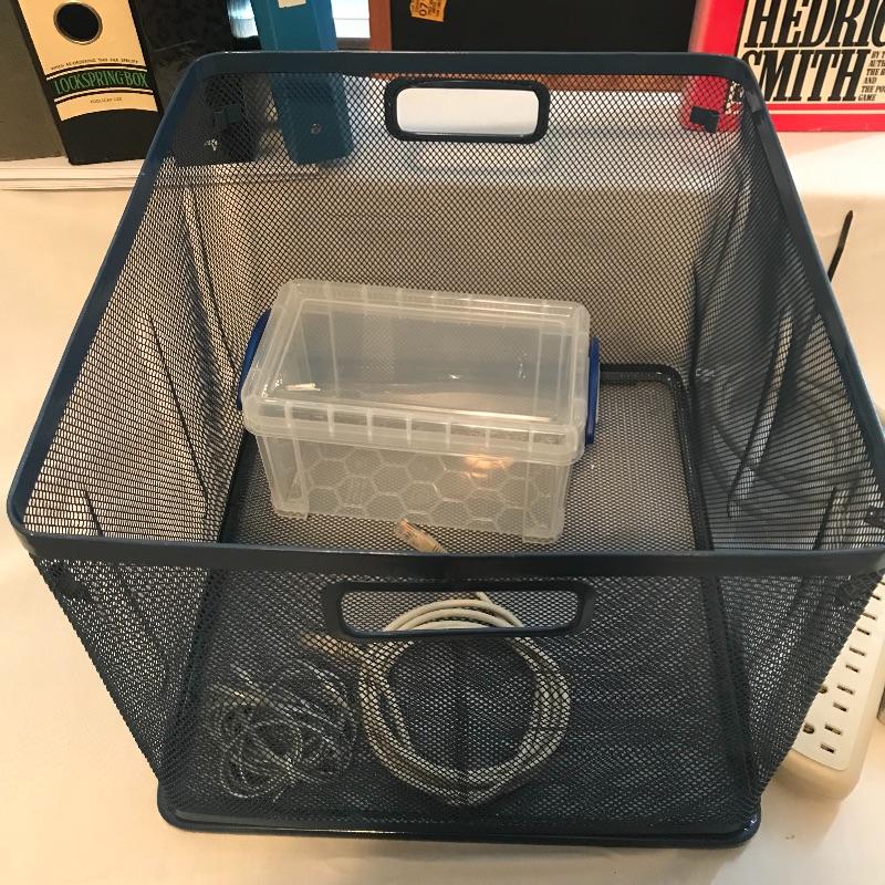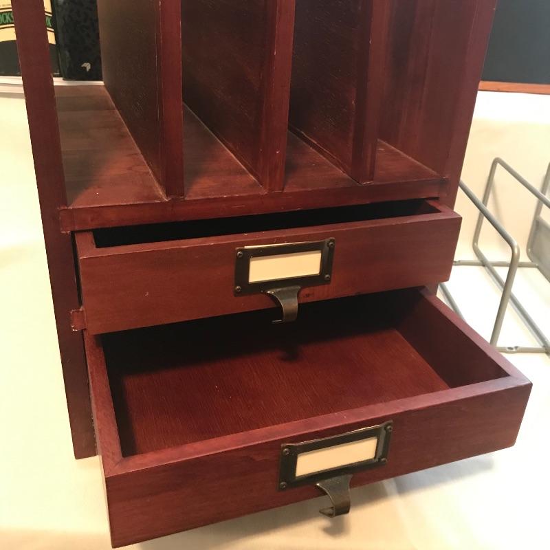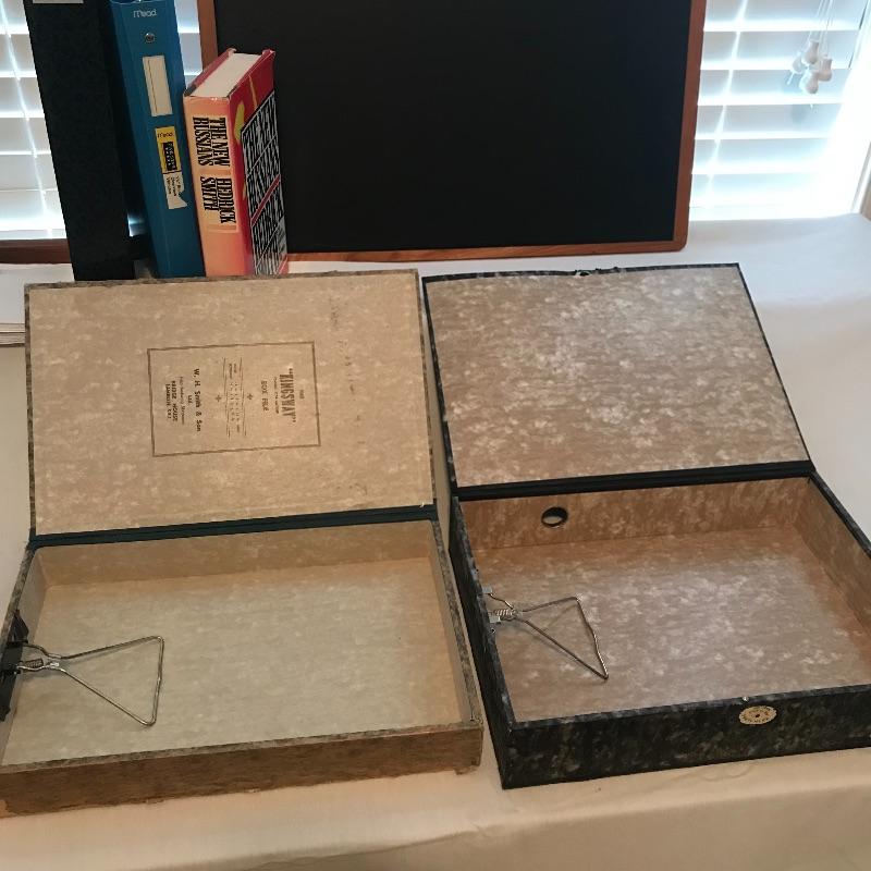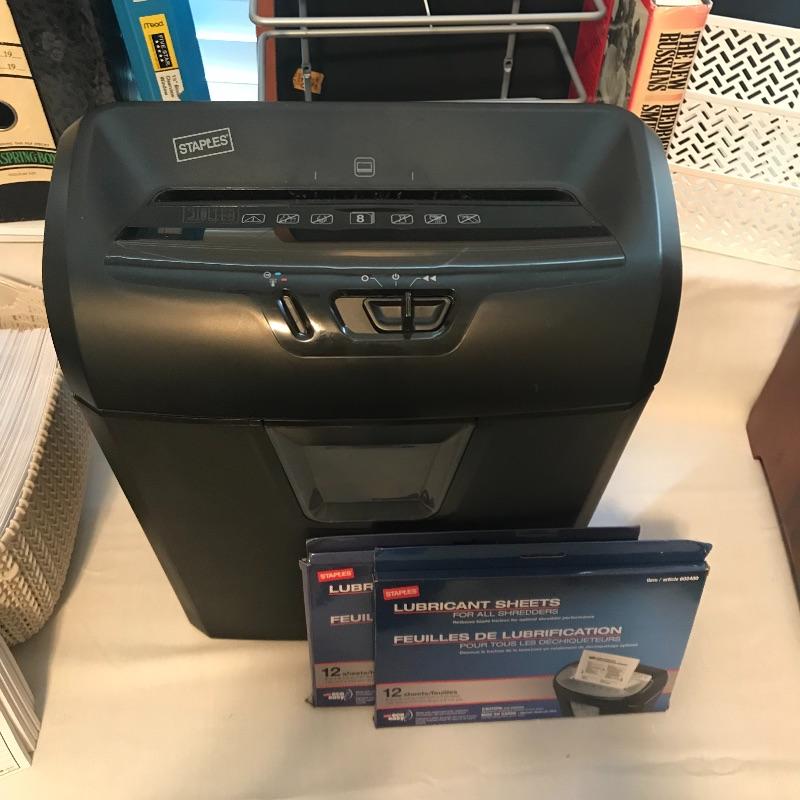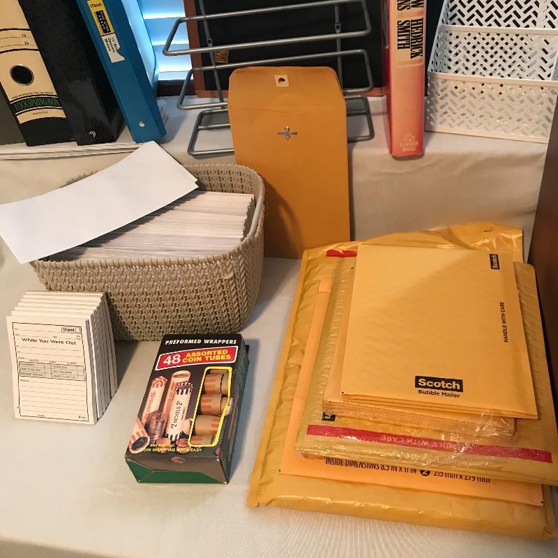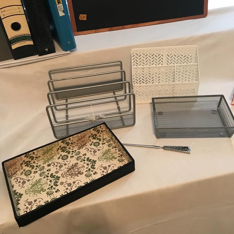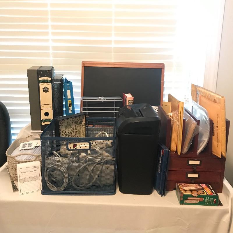 Large collection of office necessities including a Staples shredder, file boxes, metal organizing boxes and even a cut out book to hide some precious items. Lot also includes standard envelopes and larger mailers. Lastly, a leather top lap desk. Wooden file organizer is from Pottery Barn. See photos. No shipping.