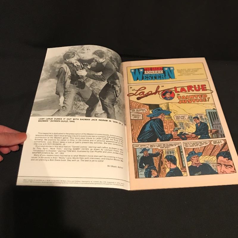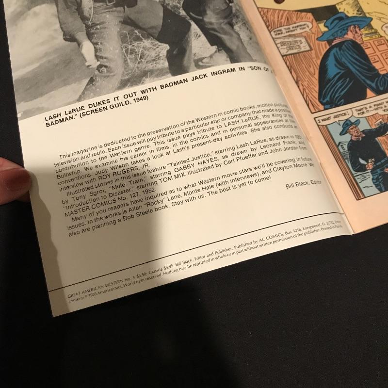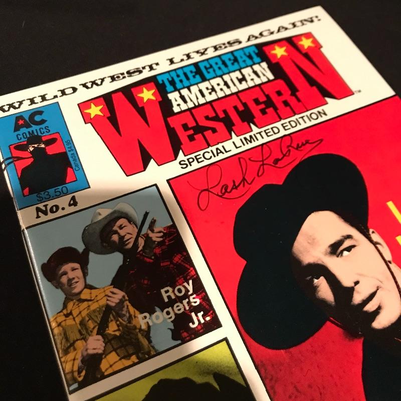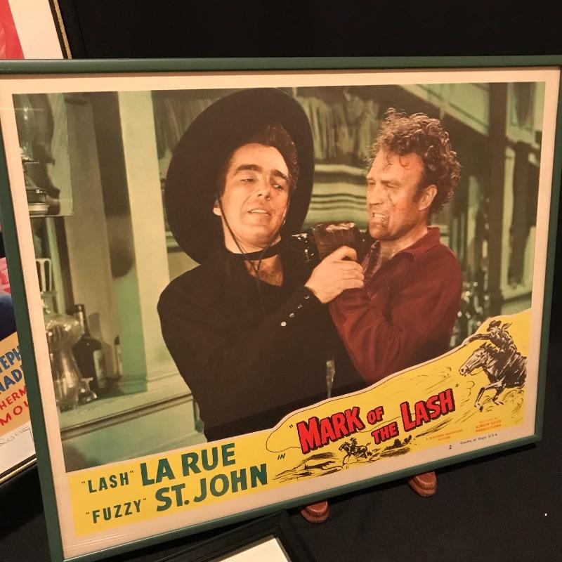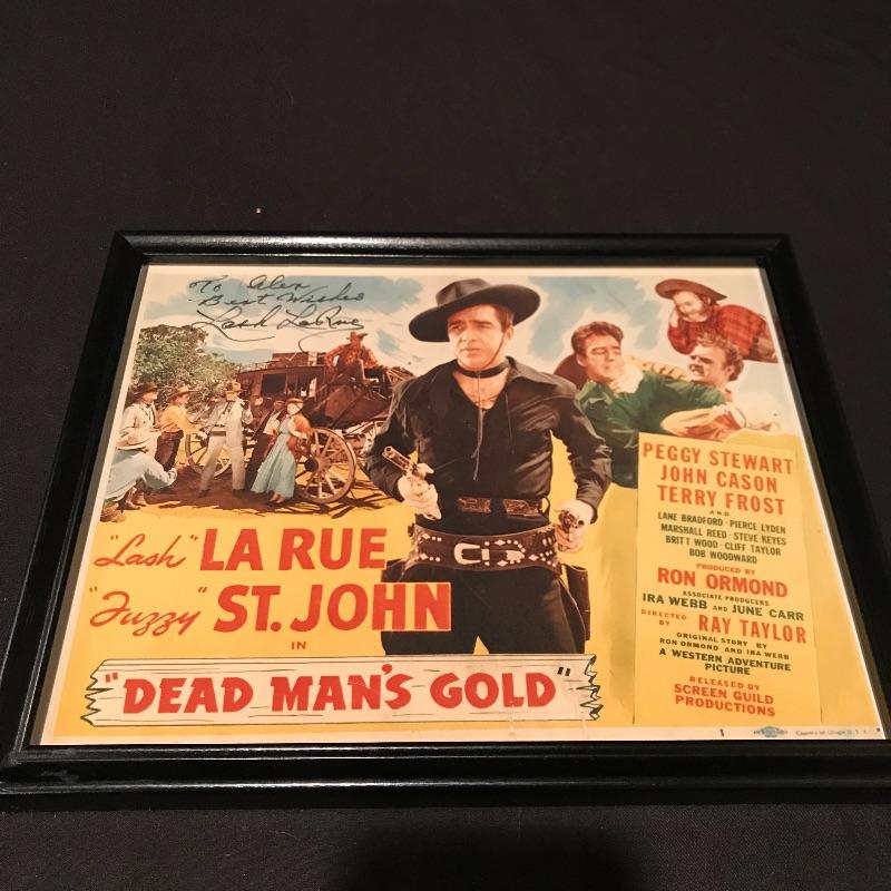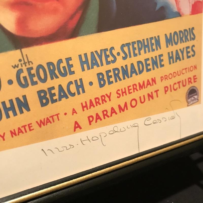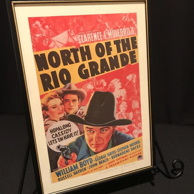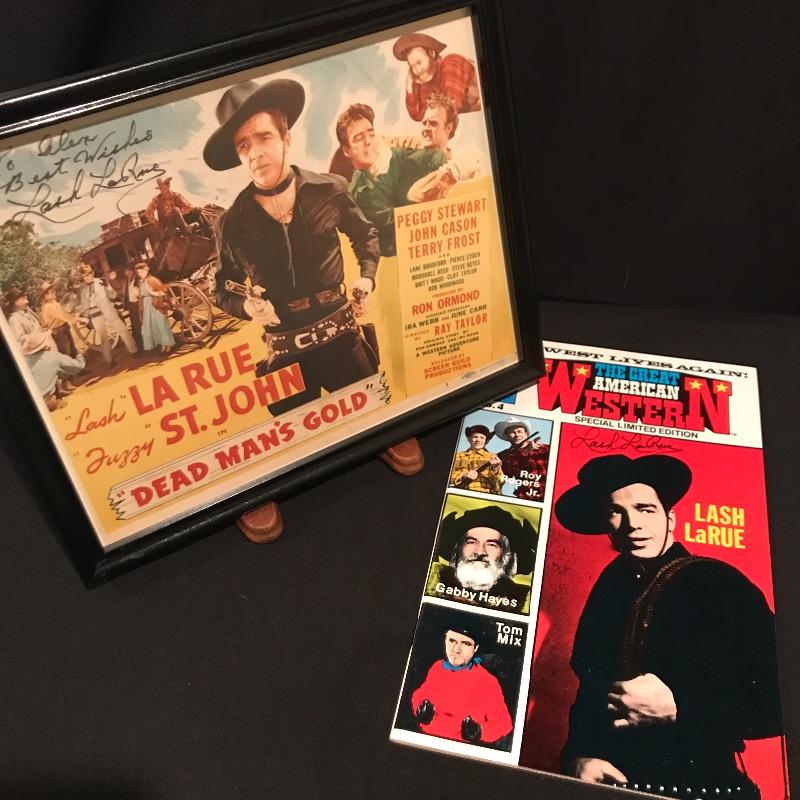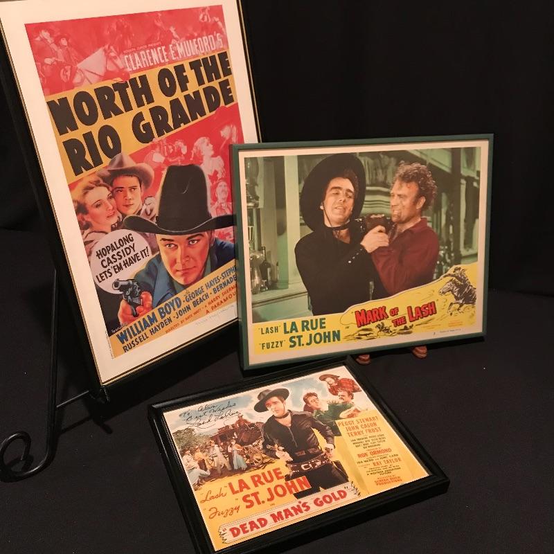 Two framed movie posters with Lash La Rue, one is personalized and signed. “Mark of the Lash” has a nice green metal frame and the “Dead Man’s Gold” is signed in a black wooden frame. You’ll also find a signed copy of The Great American Western Comic No.4 Special Limited Edition 1989. The Lash La Rue trio is accompanied by a Hopalong Cassidy “North of the Rio Grande” movie poster in a black wooden frame measuring approximately 11.75” x 16.75”. Signature is possibly Grace Bradley’s, appearing as “Mrs. Hopalong Cassidy” in pencil. No COAs. Shipping available. Please call UPS at 828-252-6930 with dimensions for a shipping quote prior to bidding.