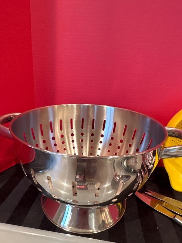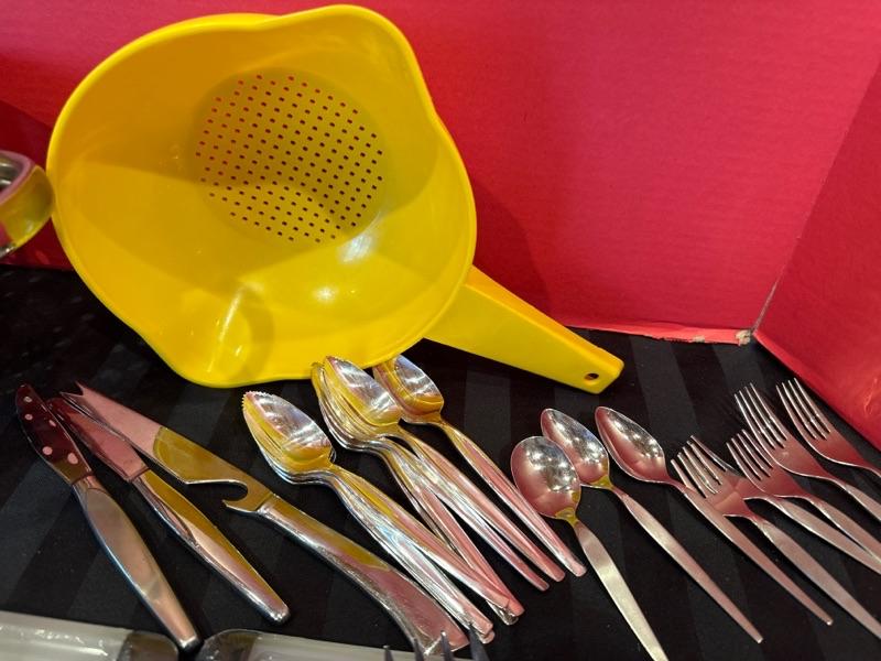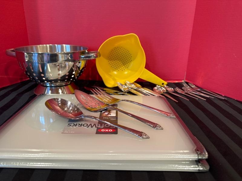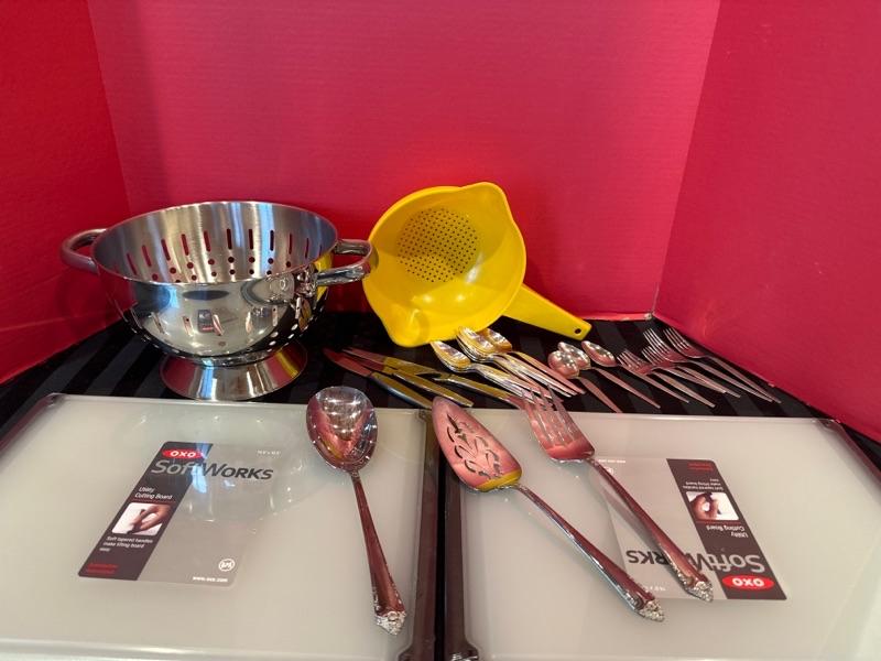 2, cutting boards, 1 plastic strainer 1 stainless steel colander stainer different spoons, grapefruit spoons, serving spoons, forks, knifes