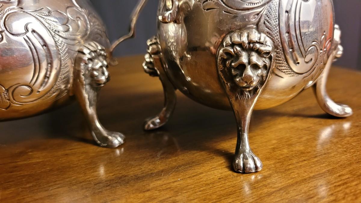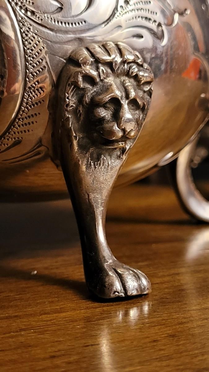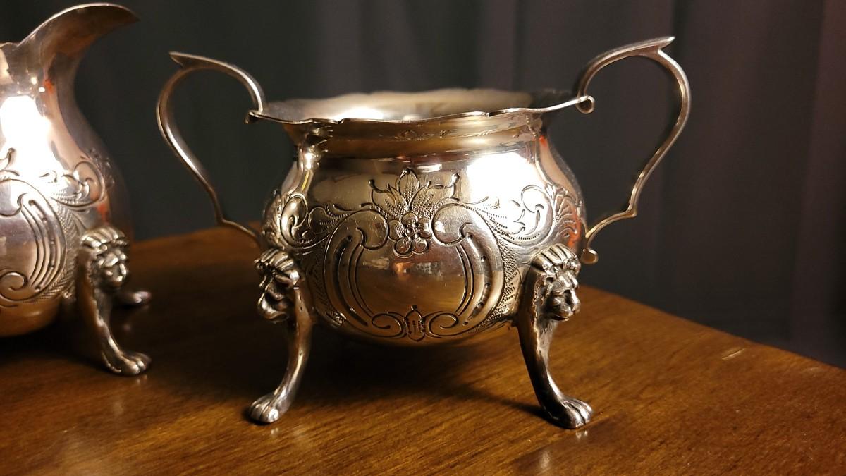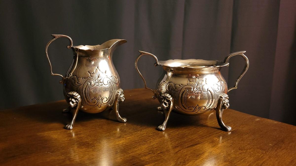 Lot 144: (2) Vintage Lion Feet Accent Silver Plated Hand Chased Sugar and Creamer Set
