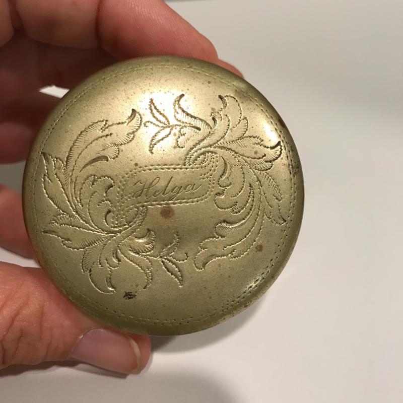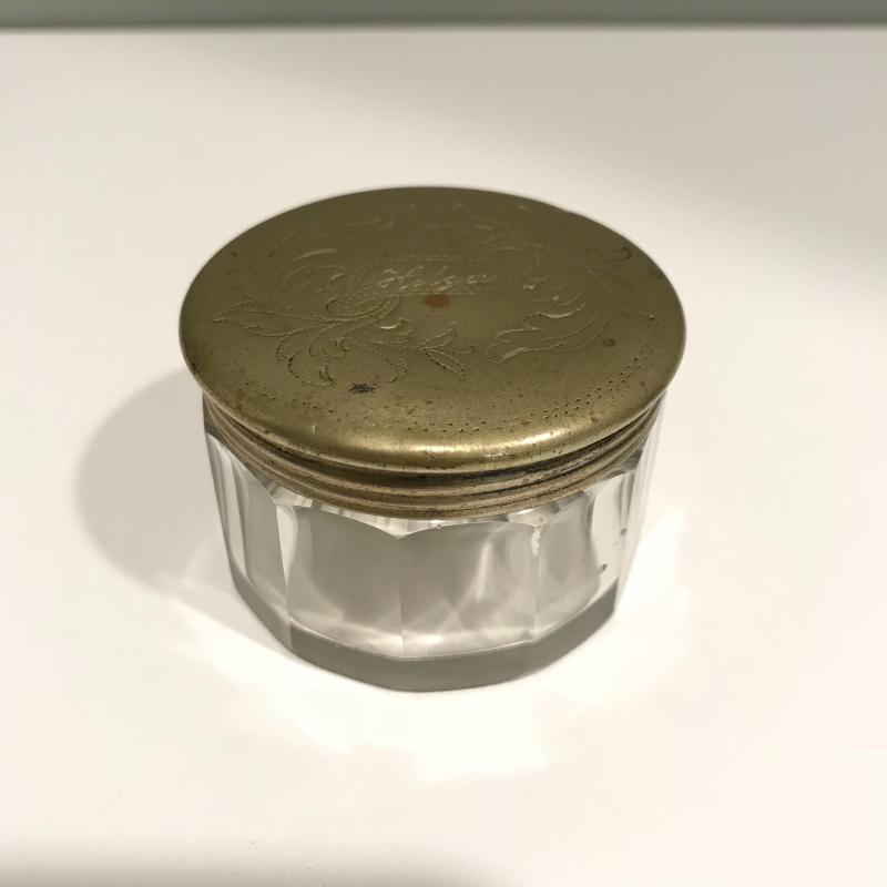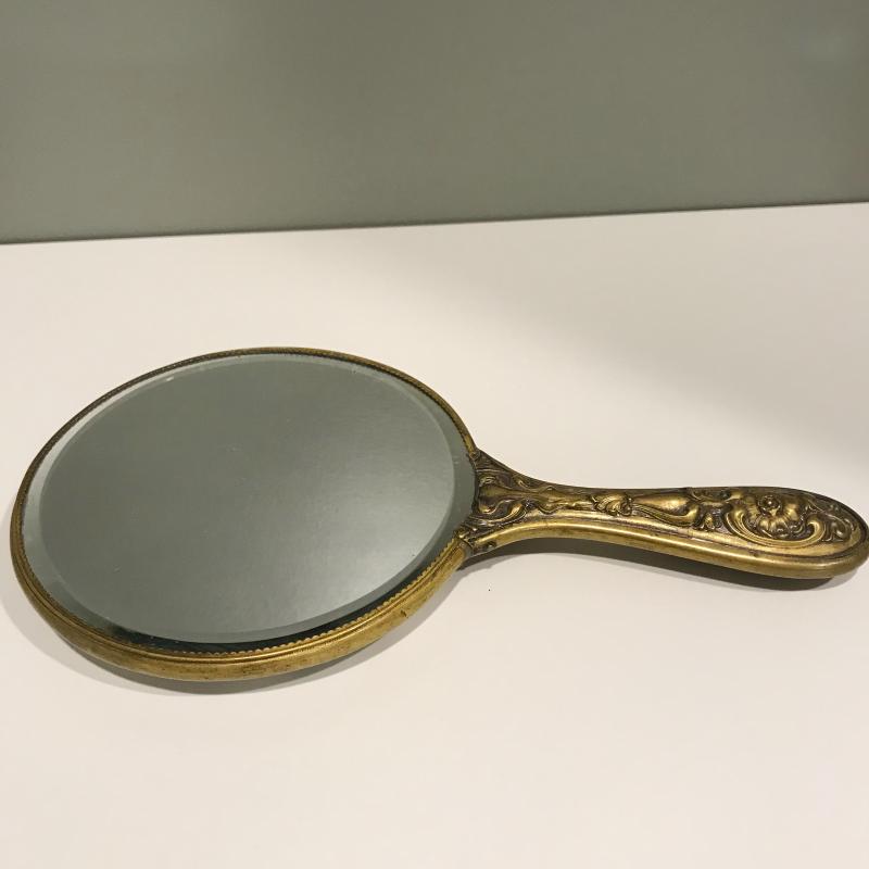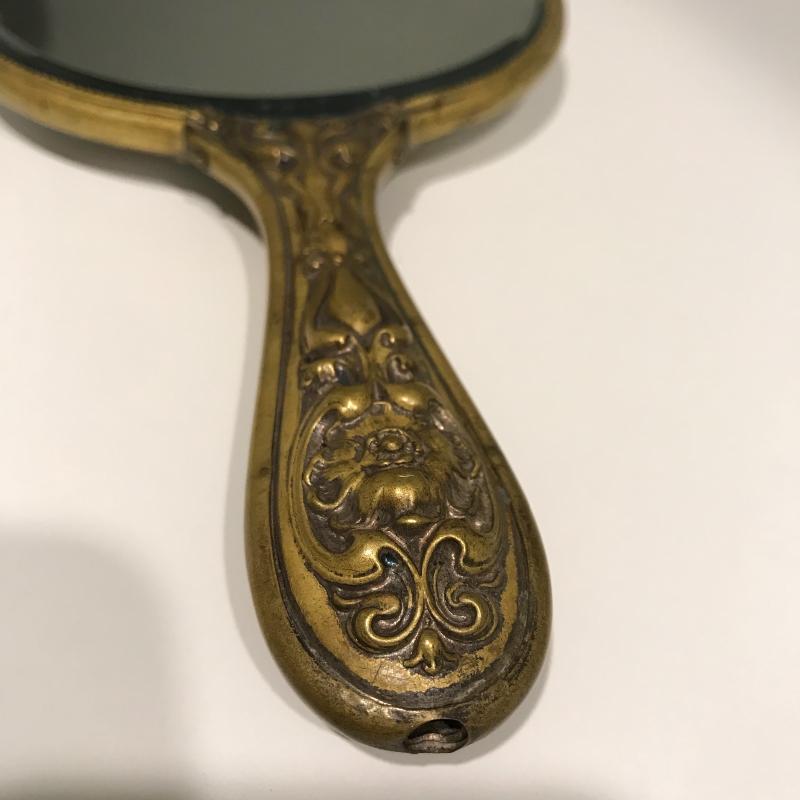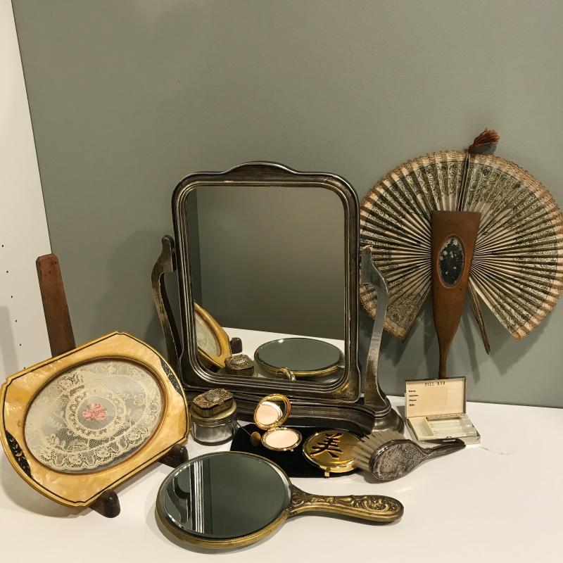 Large vanity lot includes a fantastic vintage fan that pulls out to open. Small tear on bottom. Lot also includes Sterling brush handle, mirrors, pill and powder boxes, an Estée Lauder powder compact with manufacturer’s texture print still in powder, delicate doily tray and more! Swivel mirror is approx 12.25” tall. Shipping available or local pick up in Arden, NC.