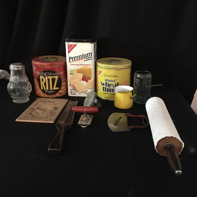 This sweet vintage kitchen collection includes cracker tins, ladle, can opener, Coke glass, rolling pin and more. See images for all the gems included here.