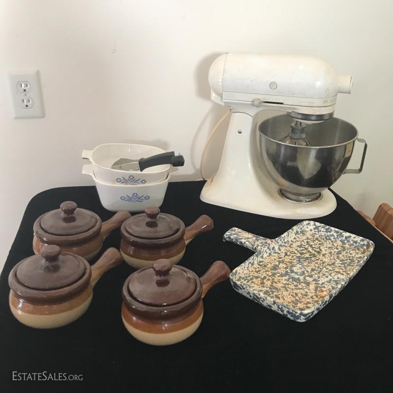 Lot of vintage kitchen items includes a refurbished Kitchen-Aid mixer with two bowls (dirty but works), two Corningware dishes with holder, Awesome Vintage Doctor Douglas Wonder Baker and Some miscellaneous bakeware. No shipping. Pick up in Mills River, NC.