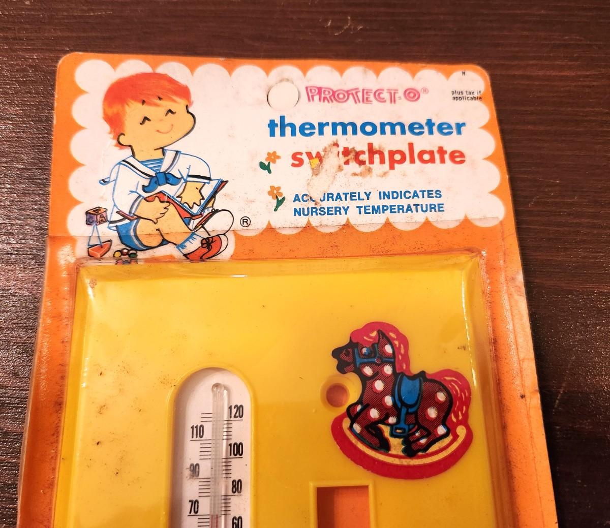 1960's nursery switch plate - new in original package - features a rocking horse and a built-in thermometer. For the days before widespread home air conditioning! Package is 7.25" tall.