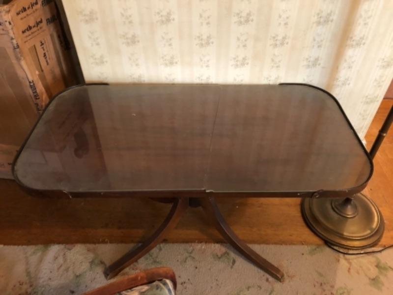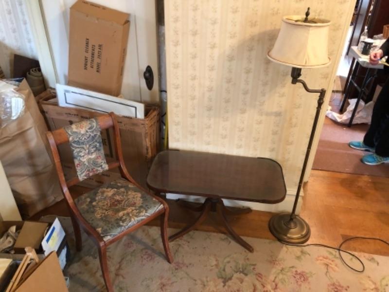 Lot 144F. Mahogany pedestal coffee table with floor lamp and chair“”$35