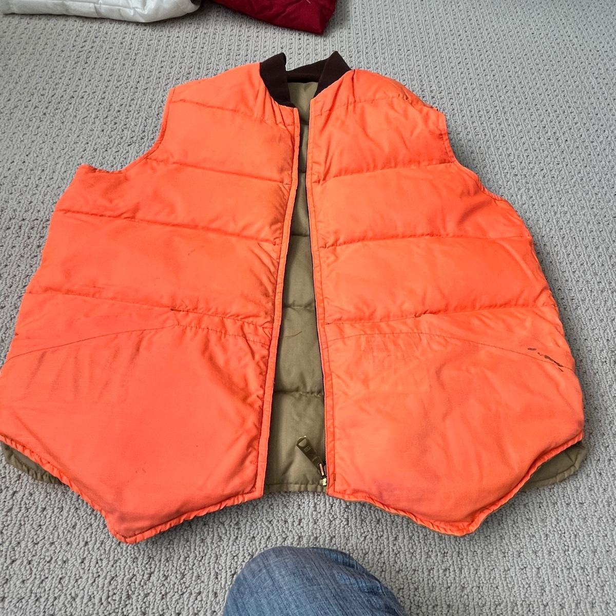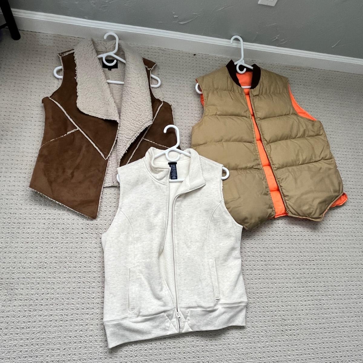 Lot 145 shearling vest, hunting vest (tan and orange) white vest (L)