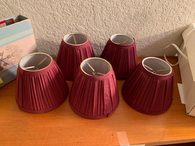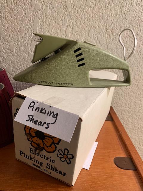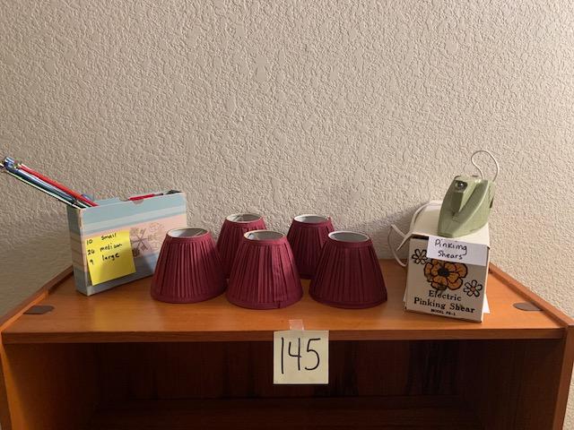 Misc. lamp shades, knitting needles, and electric pinking shears