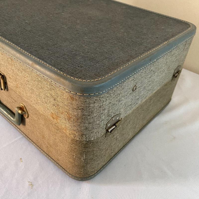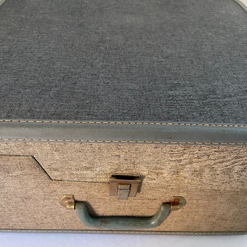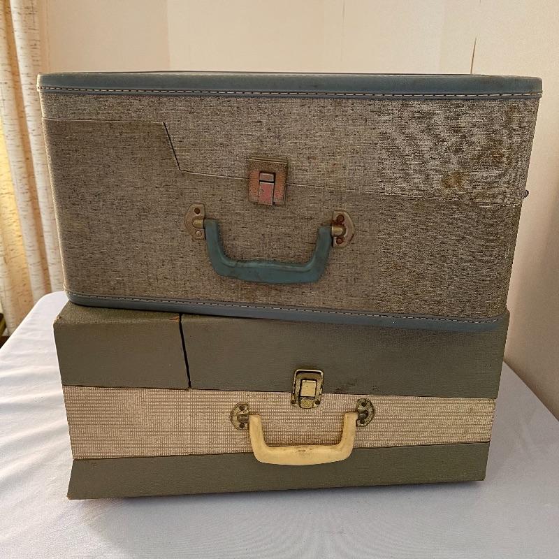 Two vintage Magnavox micromatic suitcase stereo record players with internal speakers. The first is a green hard plastic material and the clasps close on both sides. The second is covered in blue and beige textured material, and both clasps close for this turntable as well. Both units powered on and turntable turned when tested.