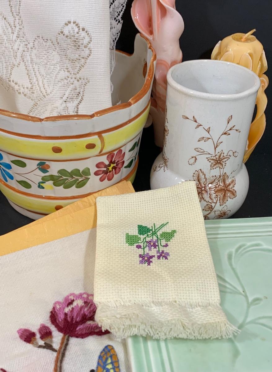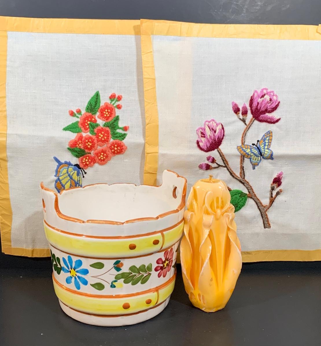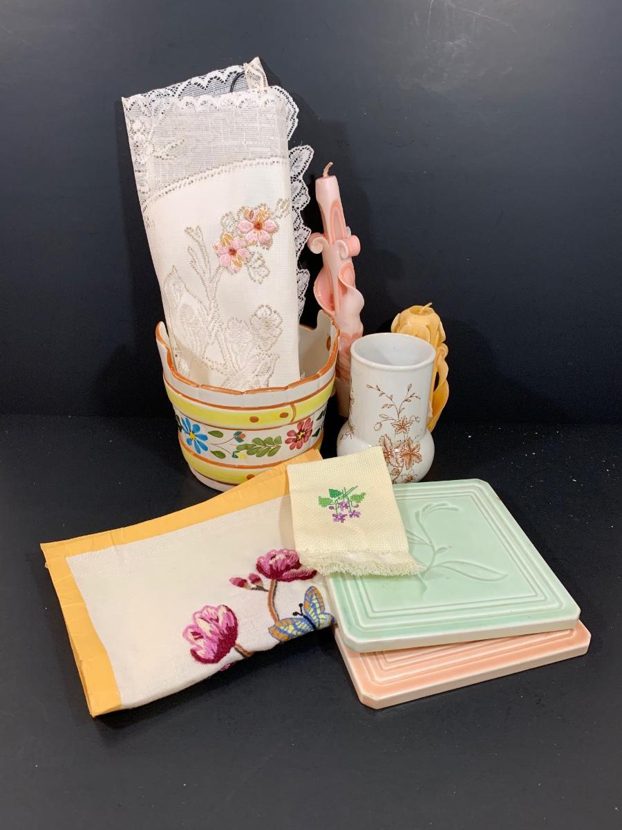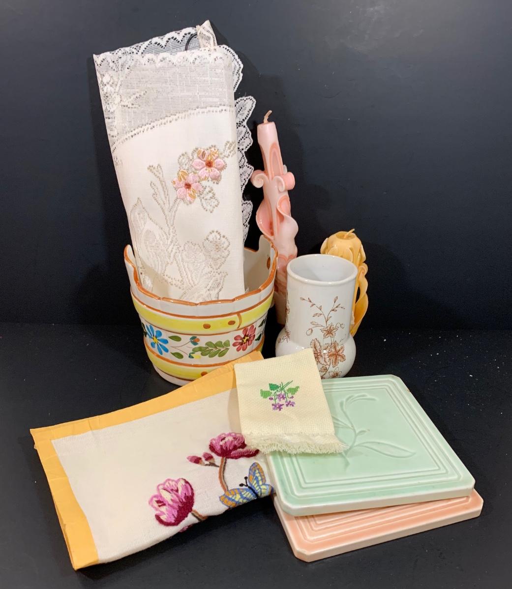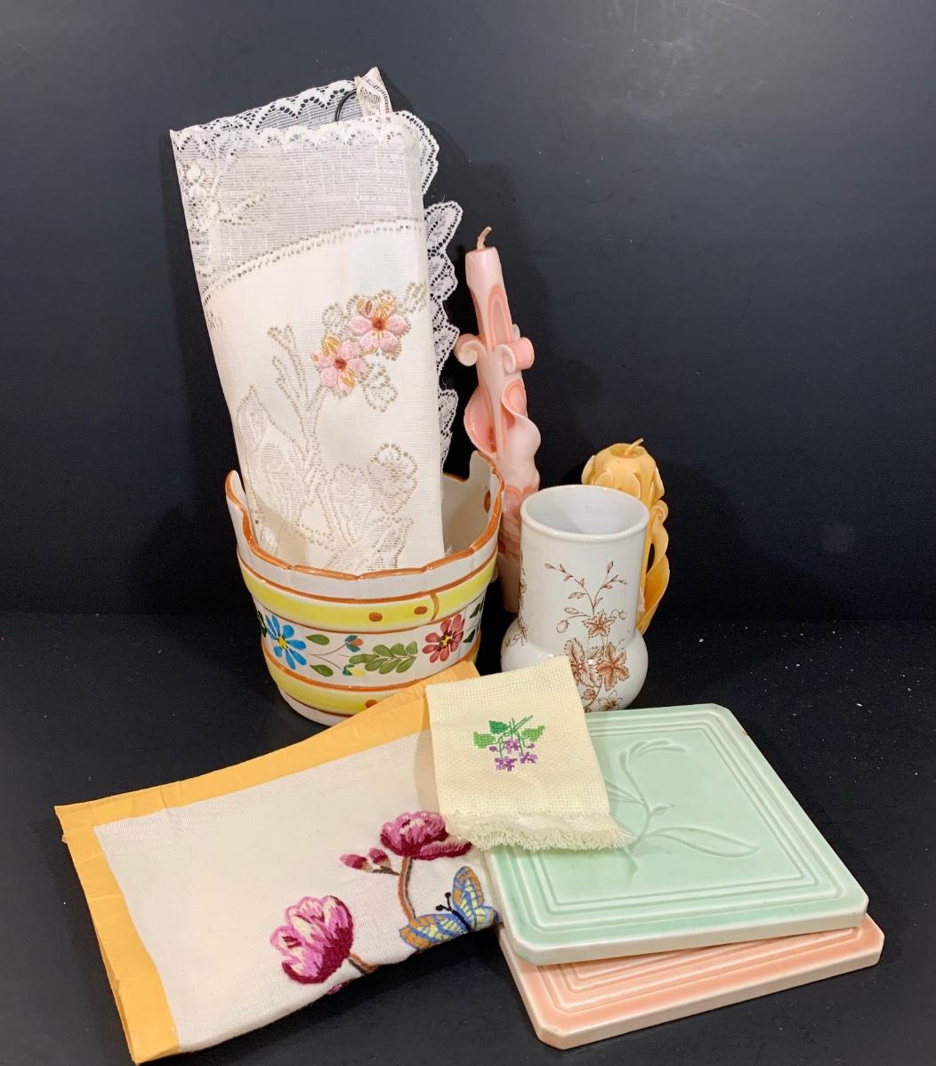 Collection includes a hand painted planted, 2 floral needle point , candles, trivets and a lace wall hanging.