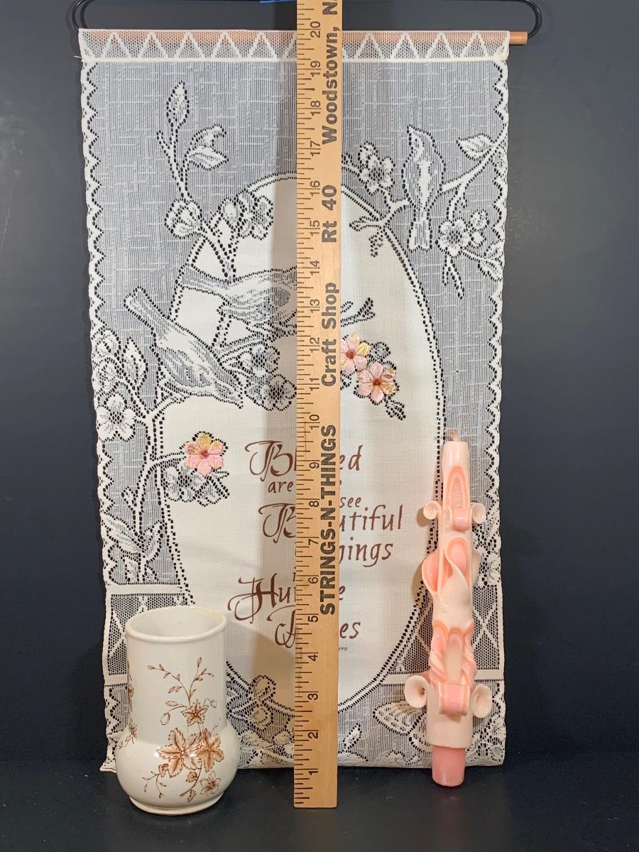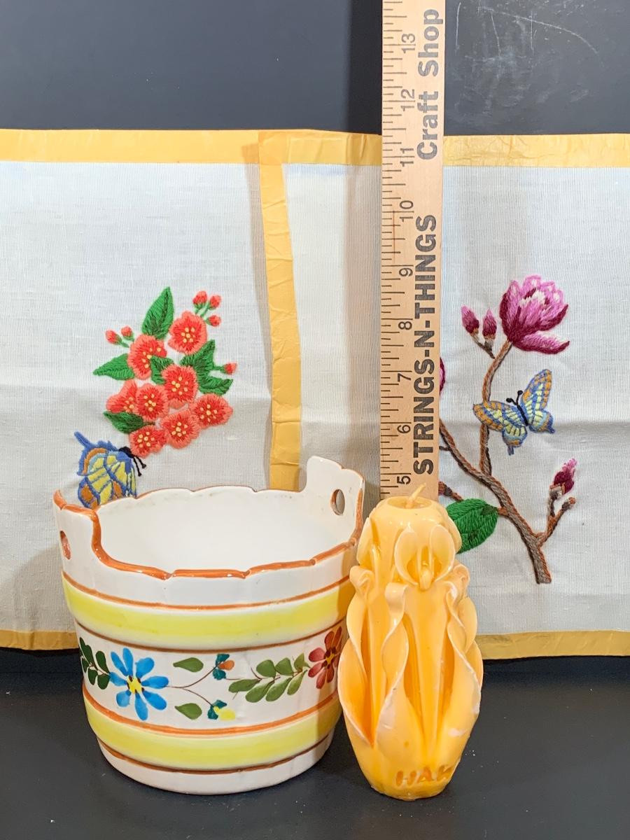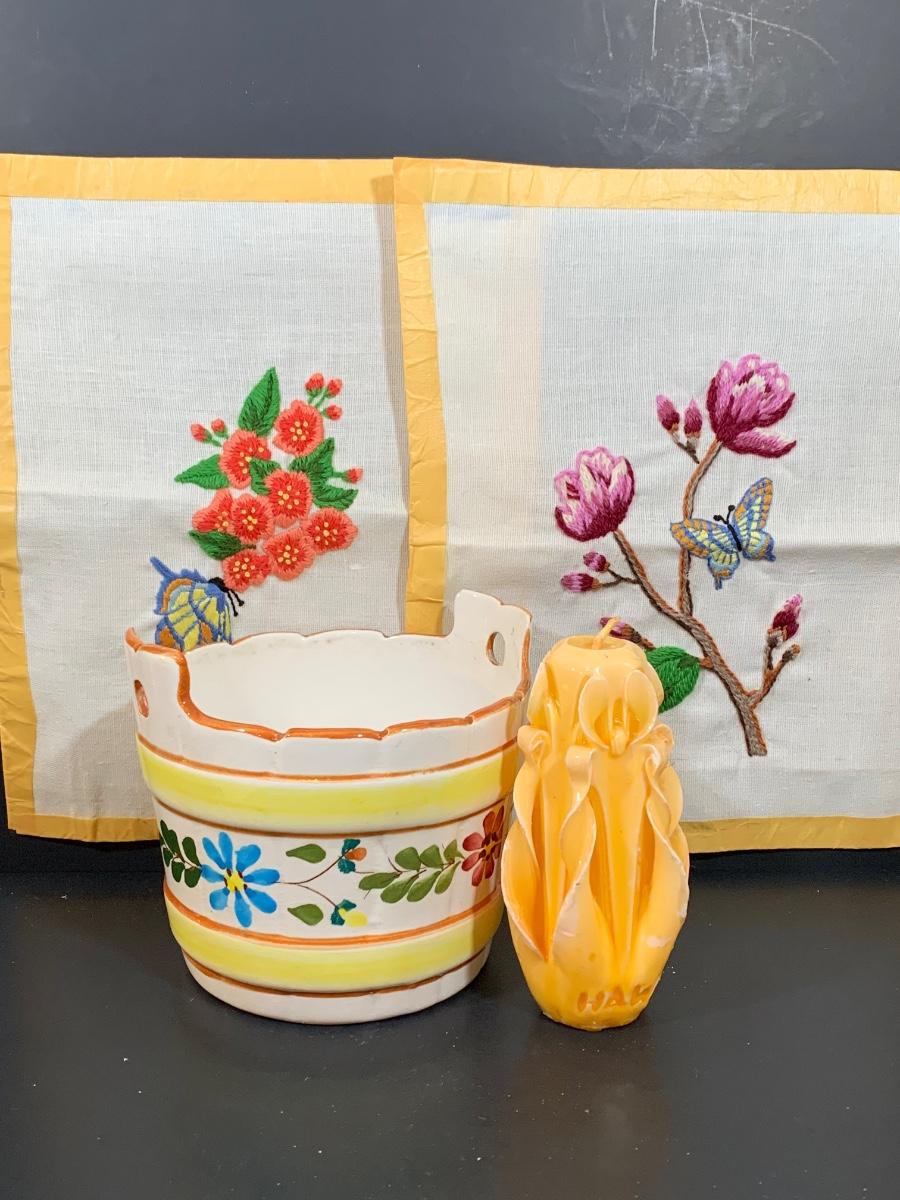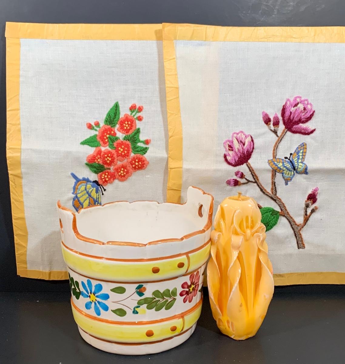 Collection includes a hand painted planted, 2 floral needle point , candles, trivets and a lace wall hanging.