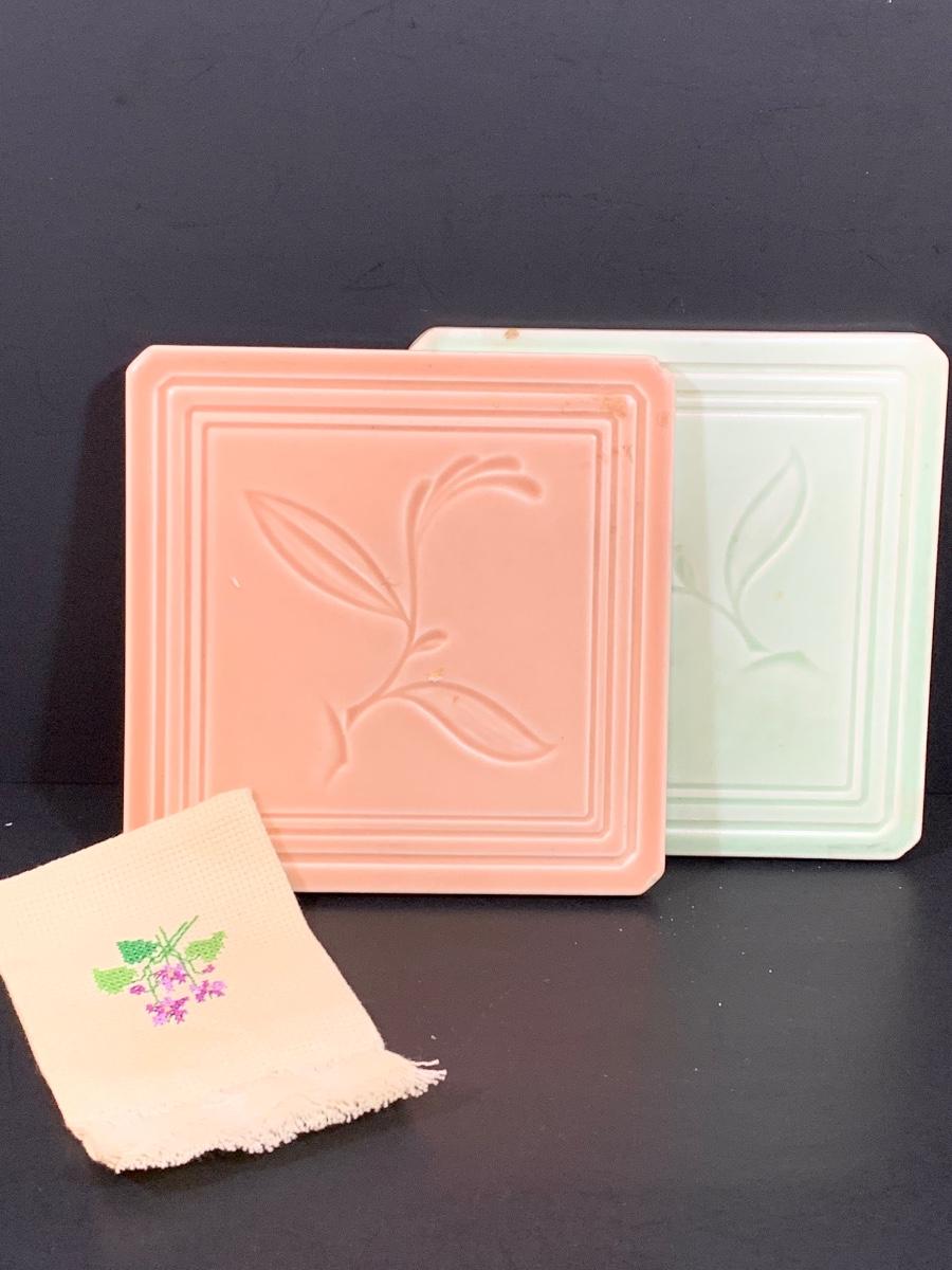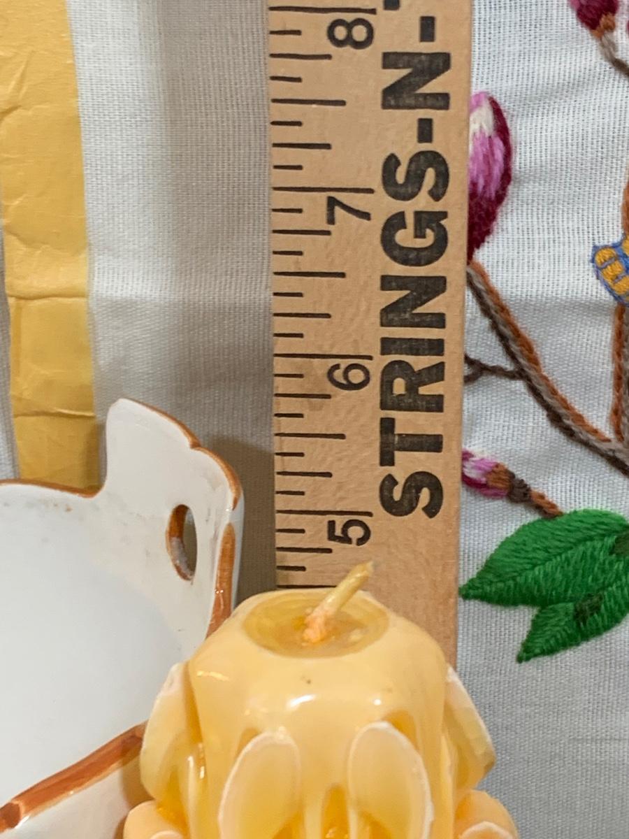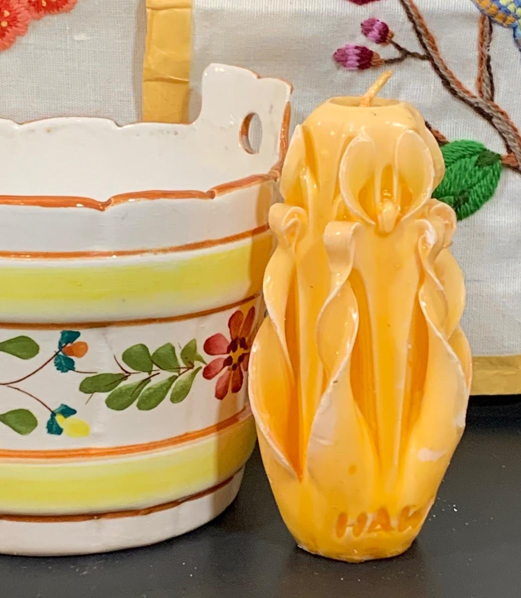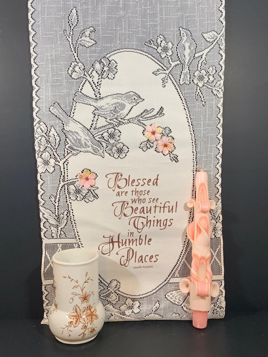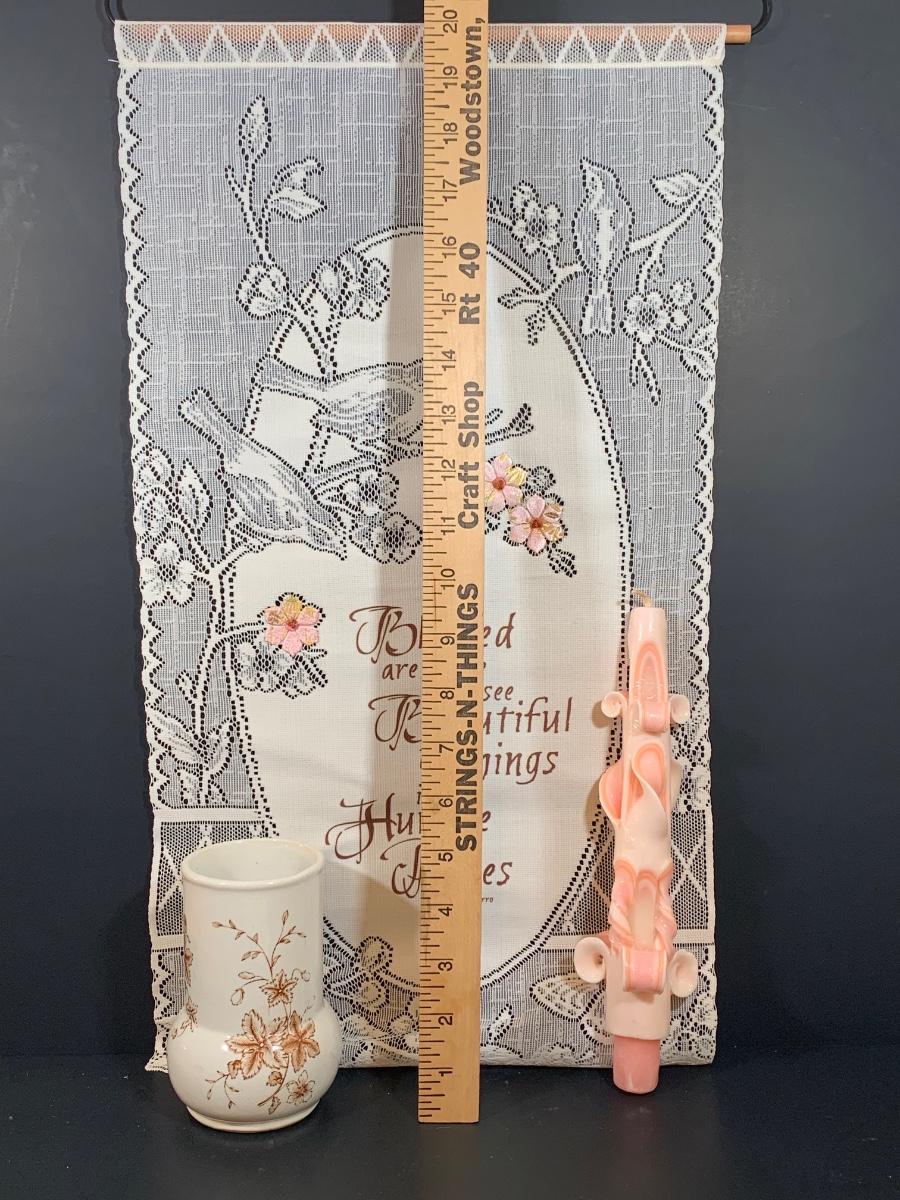 Collection includes a hand painted planted, 2 floral needle point , candles, trivets and a lace wall hanging.
