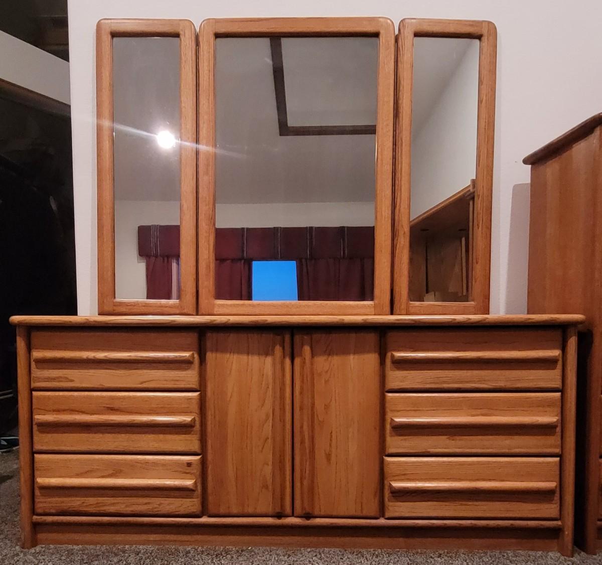 Lot 145: Vintage 2 Piece Oak Dresser & Triptych Mirror